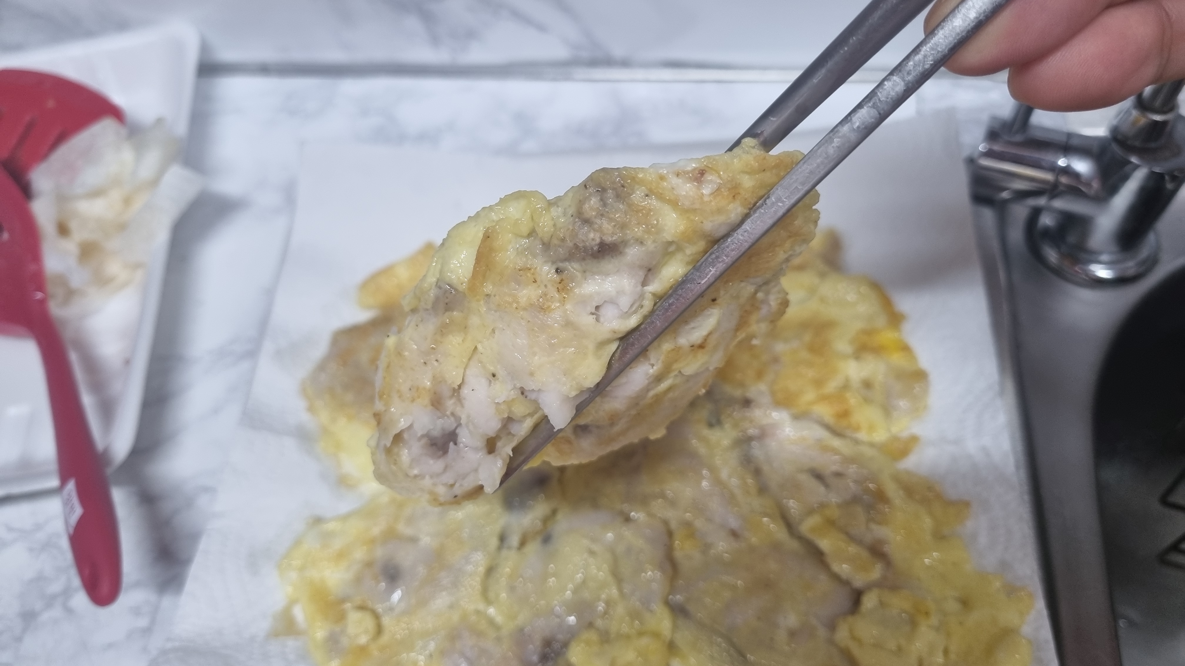 이렇게 순식간에 민어 전이 만들어지는 순간입니다. 계란반죽하고 밀가루 묻히는 것이 오히려 시간이 더 걸리고 실제로 부치는 시간은 정말 짧게 걸리고 요리과정도 아주 간다 합니다.