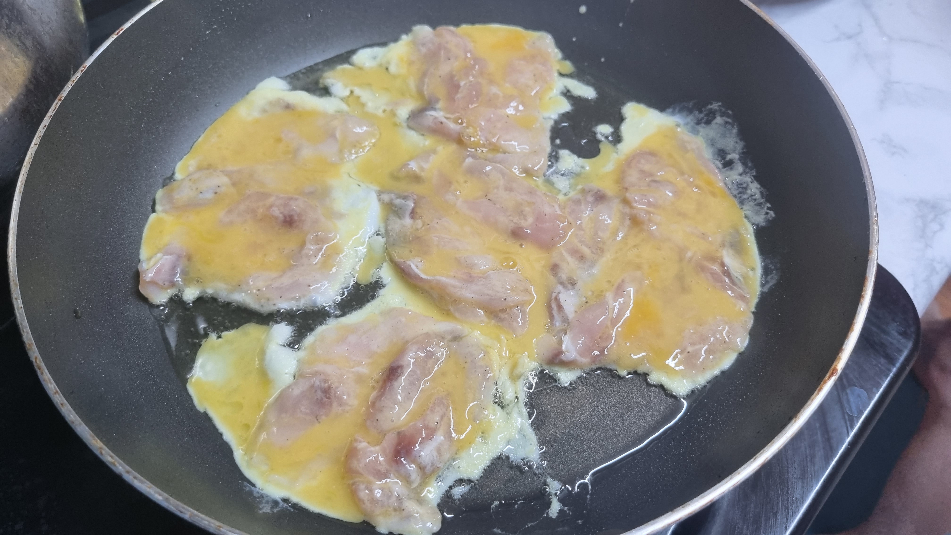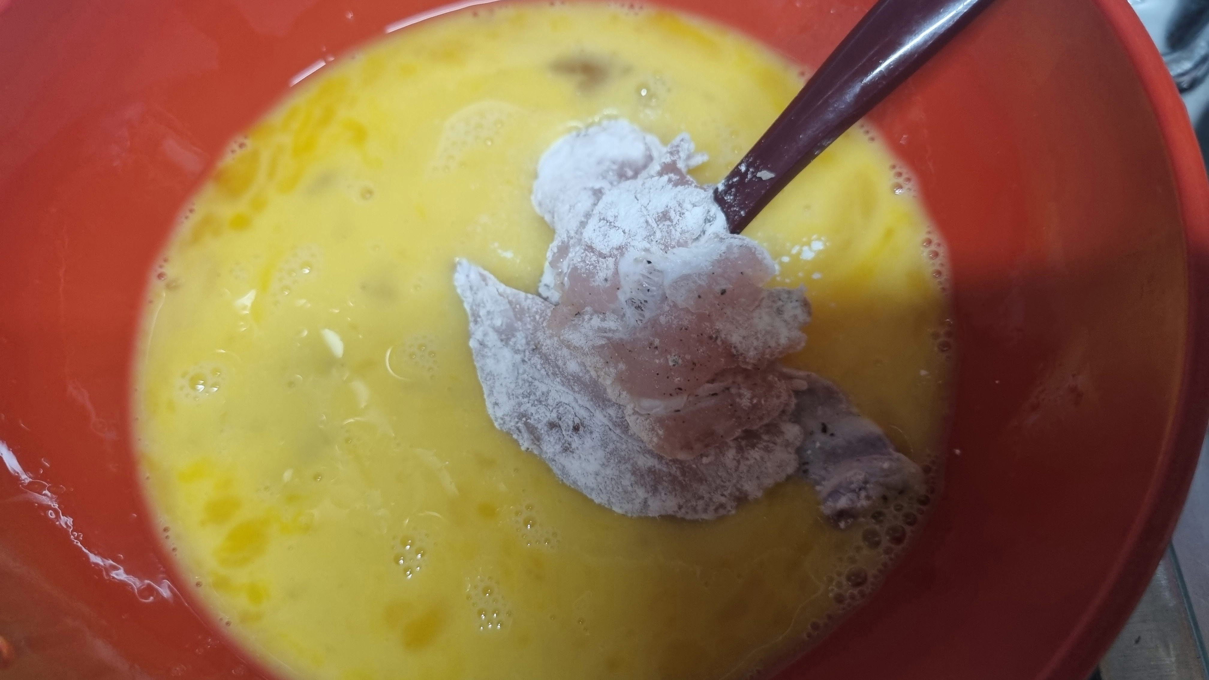 밀가루가 묻힌 민어를 계란 반죽에 다시 한번 푹 담가 골고루 발라지게 하고 이어서 바로 미리 달군 프라이팬에 굽기 시작합니다.