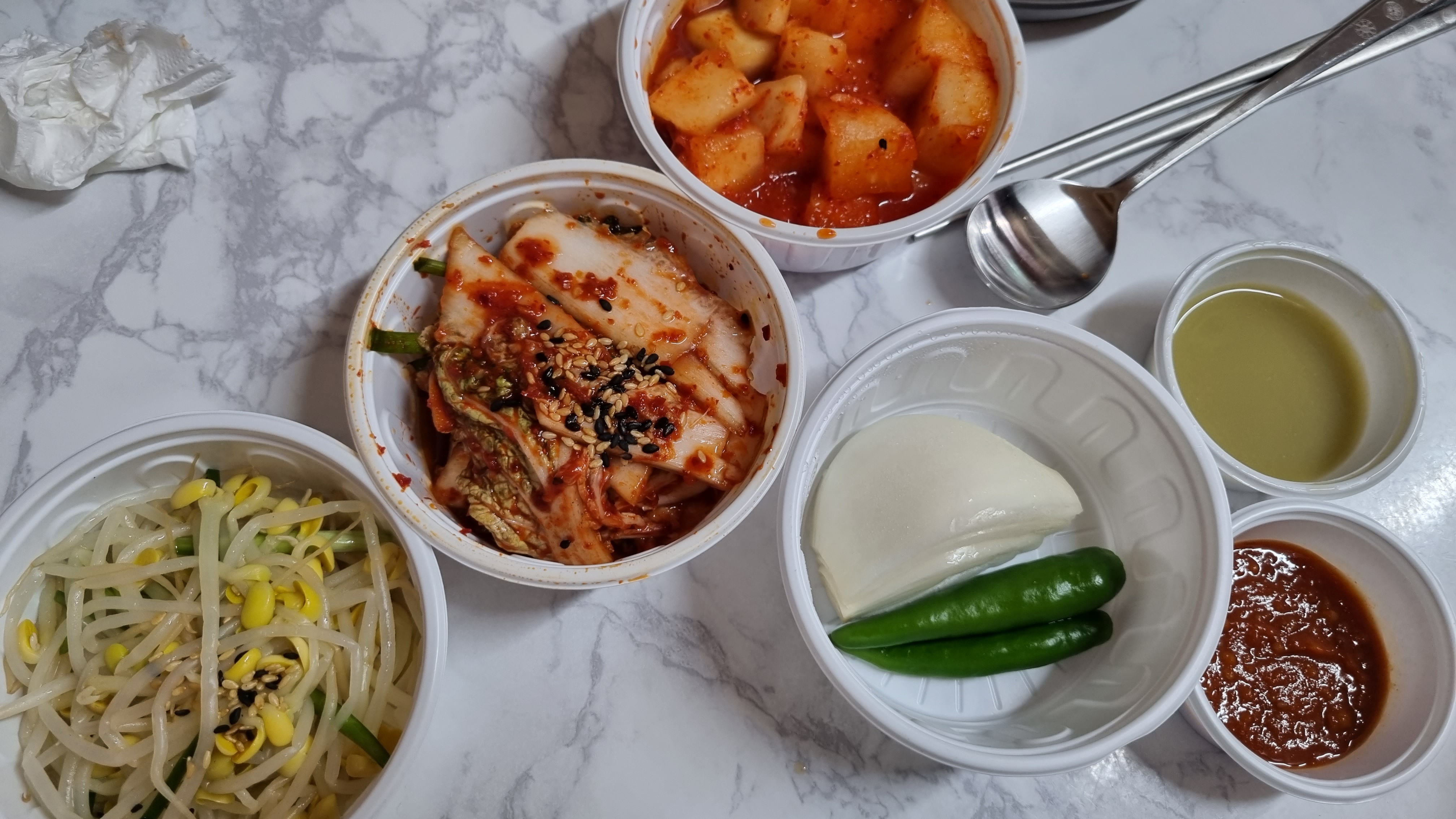 함께 포장되어 있는 반찬인데 먹을 것만 간단하게 구성되어 있네요. 배추김치, 콩나물, 깍두기, 양파 고추등이 있습니다.