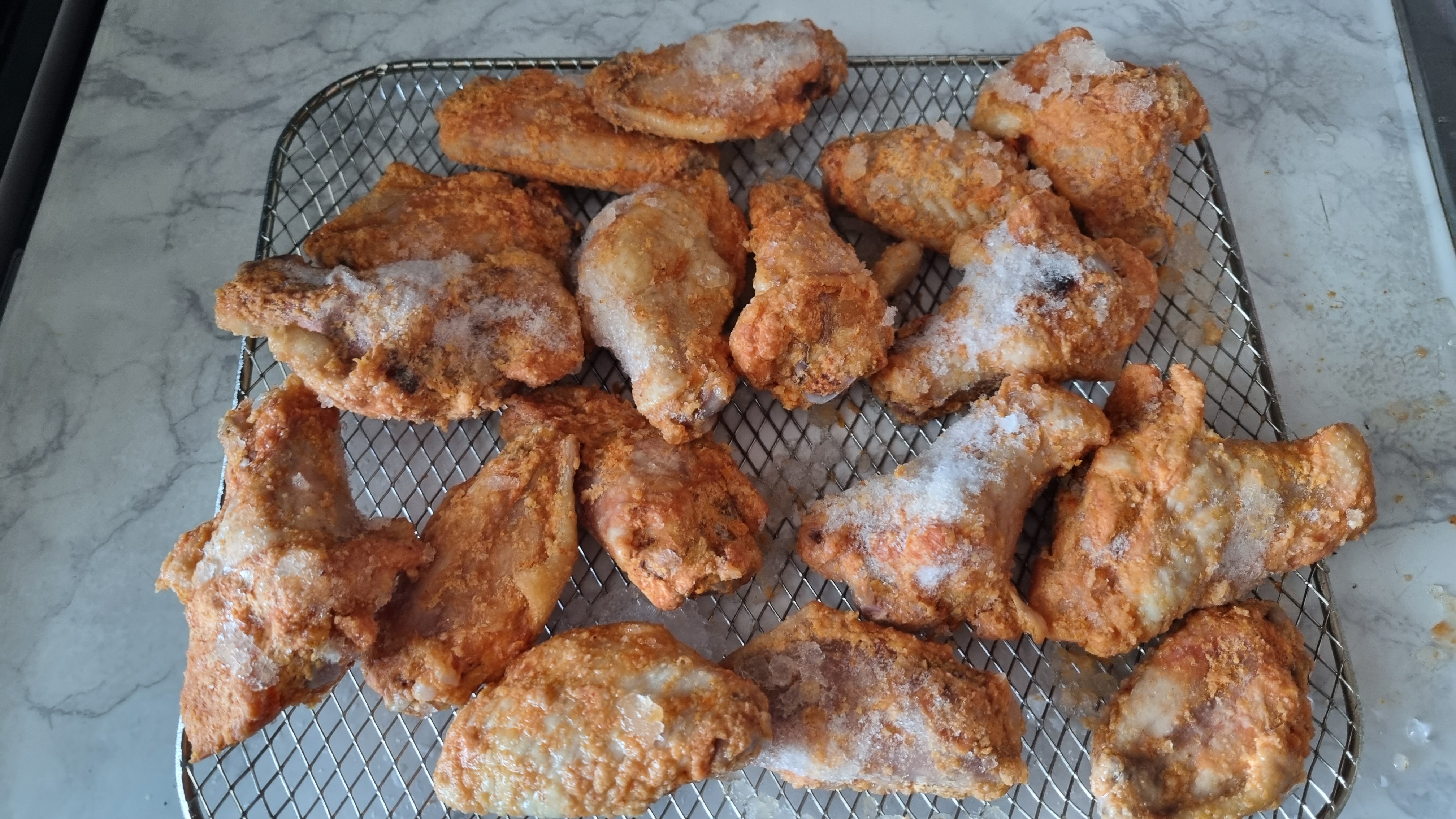 에어프라이어 그릴에 펼쳐 놓았는데 살얼음이 많이 보이네요. 사진에서 보이는 것 처리 닭날개와 윙으로 구성되어 있으며 파우더가 묻혀져 한번 튀겨서 급냉하여 판매되는 듯 보입니다.