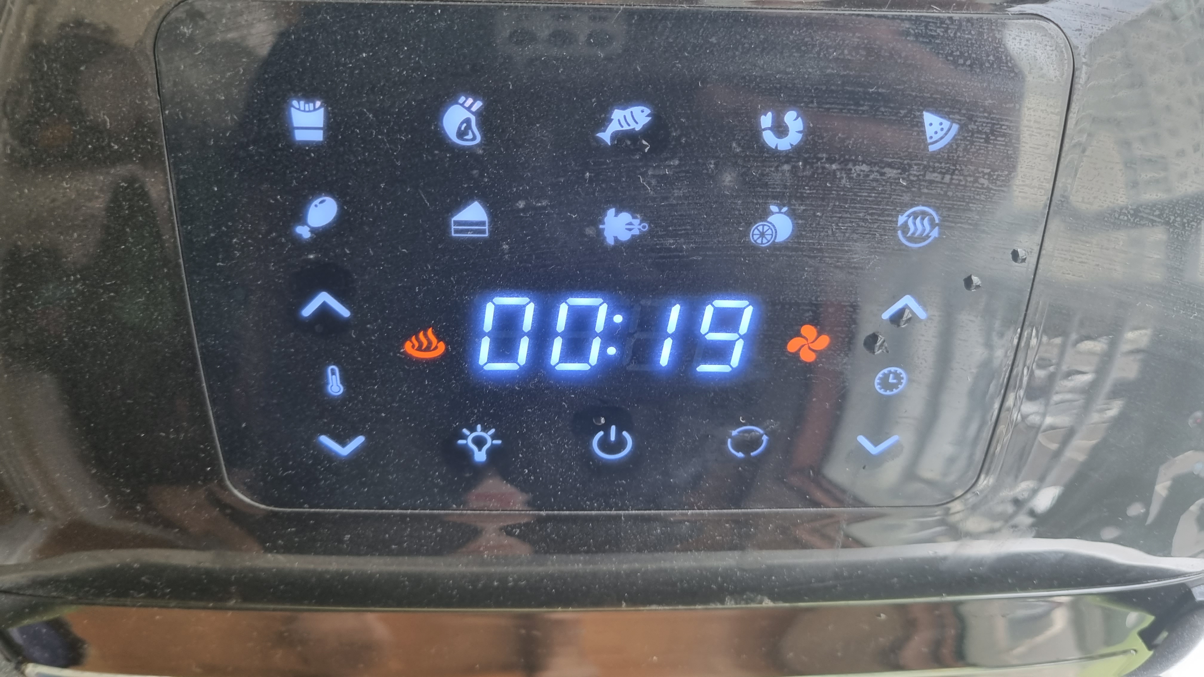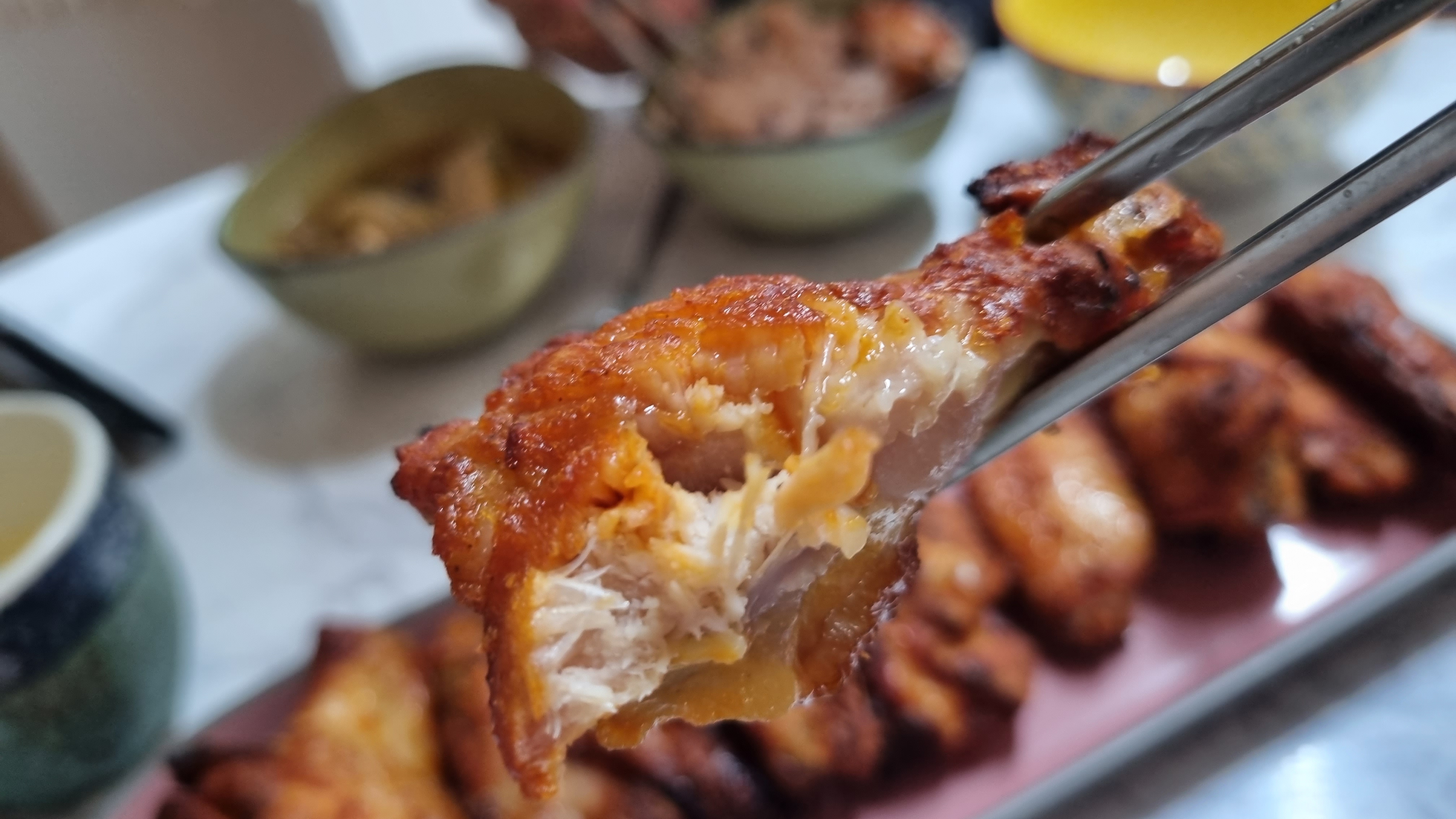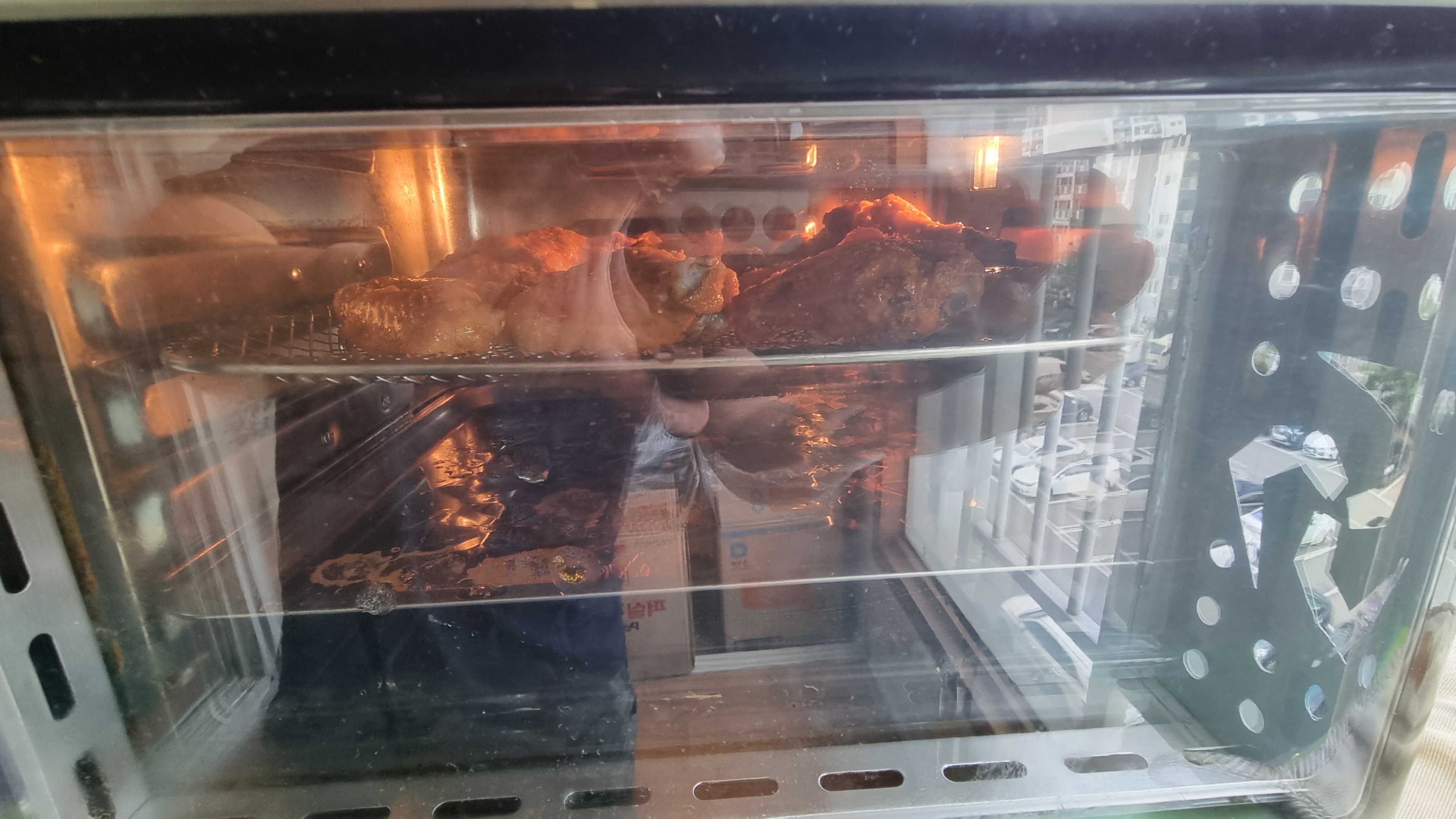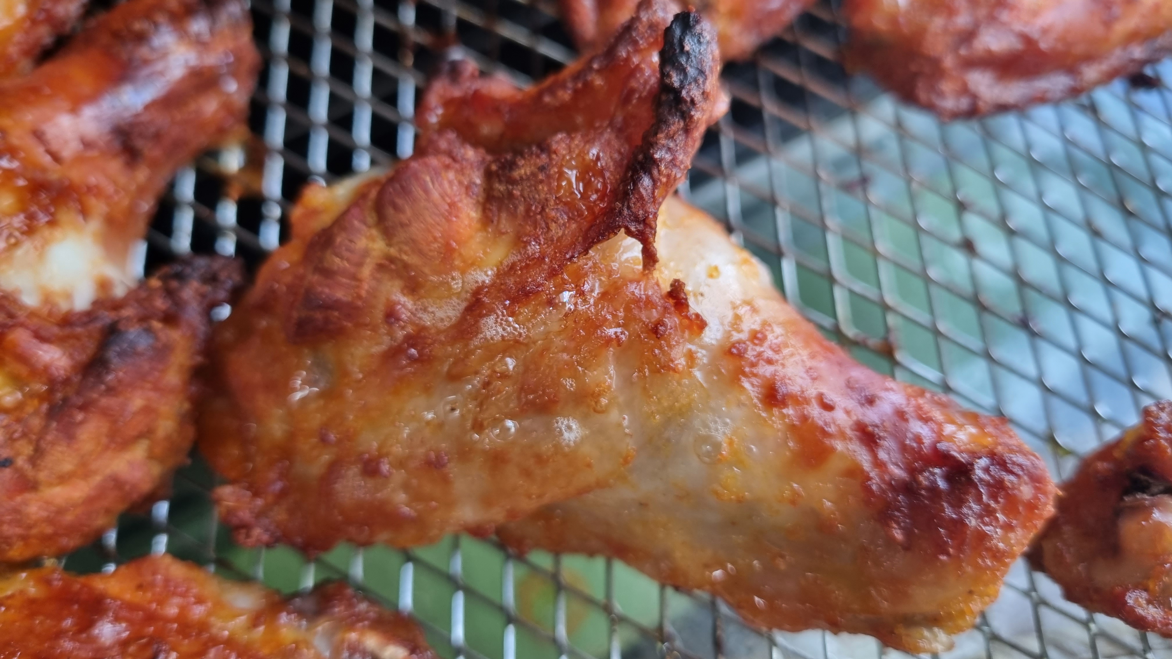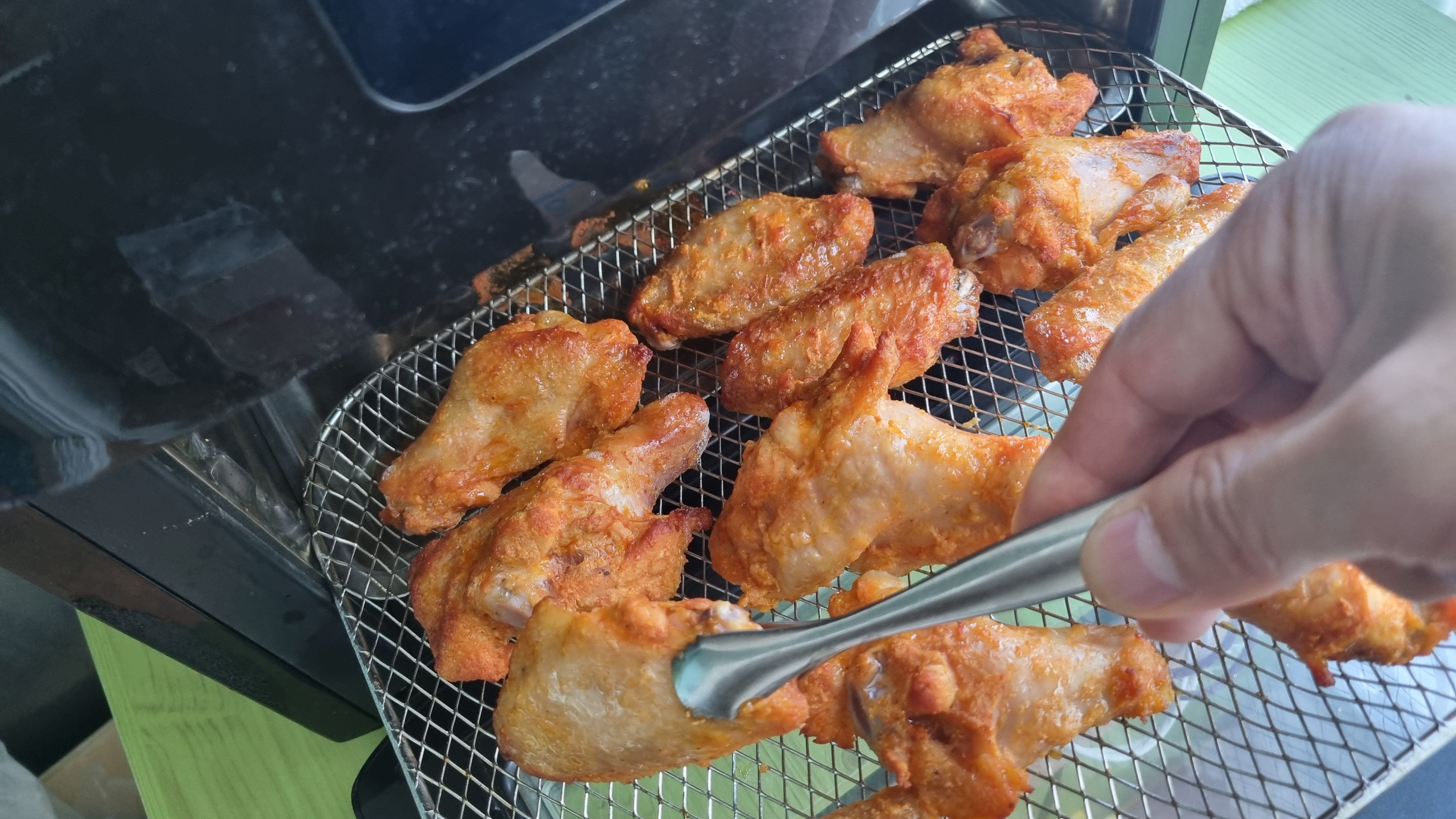5분 정도 가동후 뒤집어 주고 위해 문을 열고 꺼내어 상태를 확인했는데 아주 잘 구워지고 있었습니다. 냄새도 좋고 보기에도 좋고 정말 고급스럽게 보이는 날개치킨이었습니다.