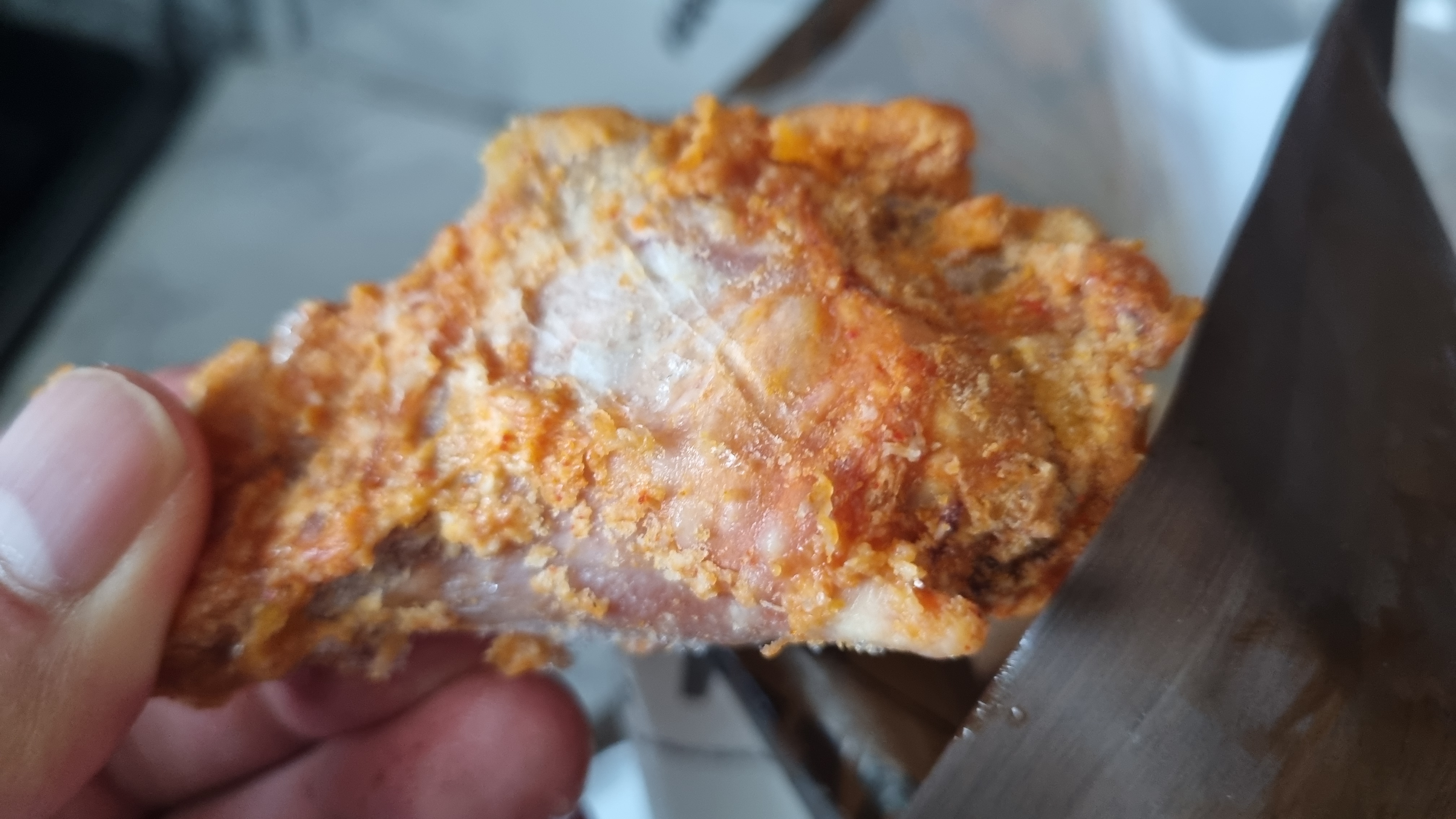 냉동치킨 포장을 개봉했습니다. 마트에서 구입 후 집에 냉장고 냉동실에 보관하였고 오늘 열어 보았는데 살얼음이 많이 있습니다.
