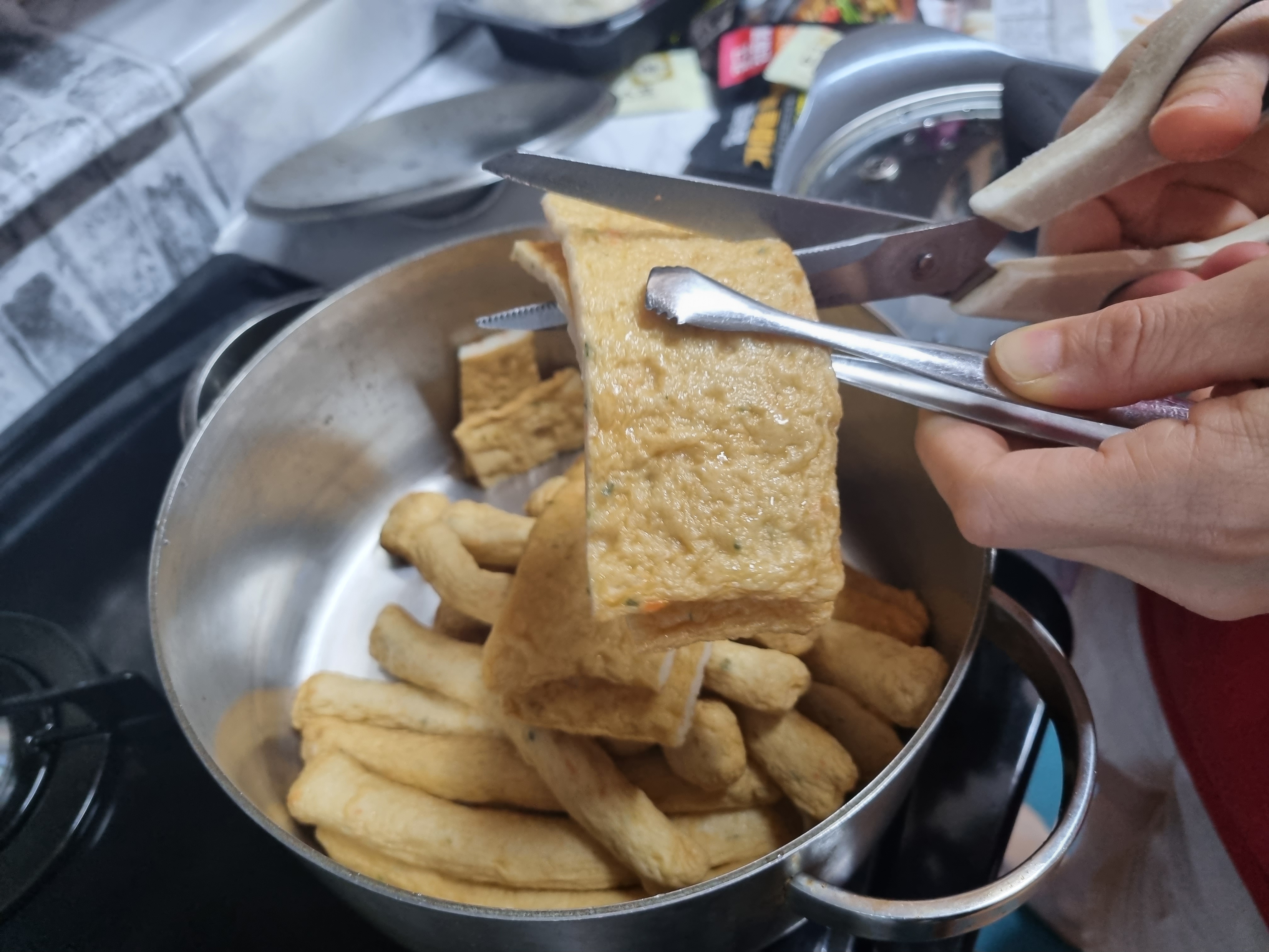 일단 어묵을 원하는 만큼의 크기로 잘라주면 됩니다. 원형 그대로 크게 해도 괜찮고 한입에 먹기 좋은 크기로 잘라 주워도 상관없습니다.