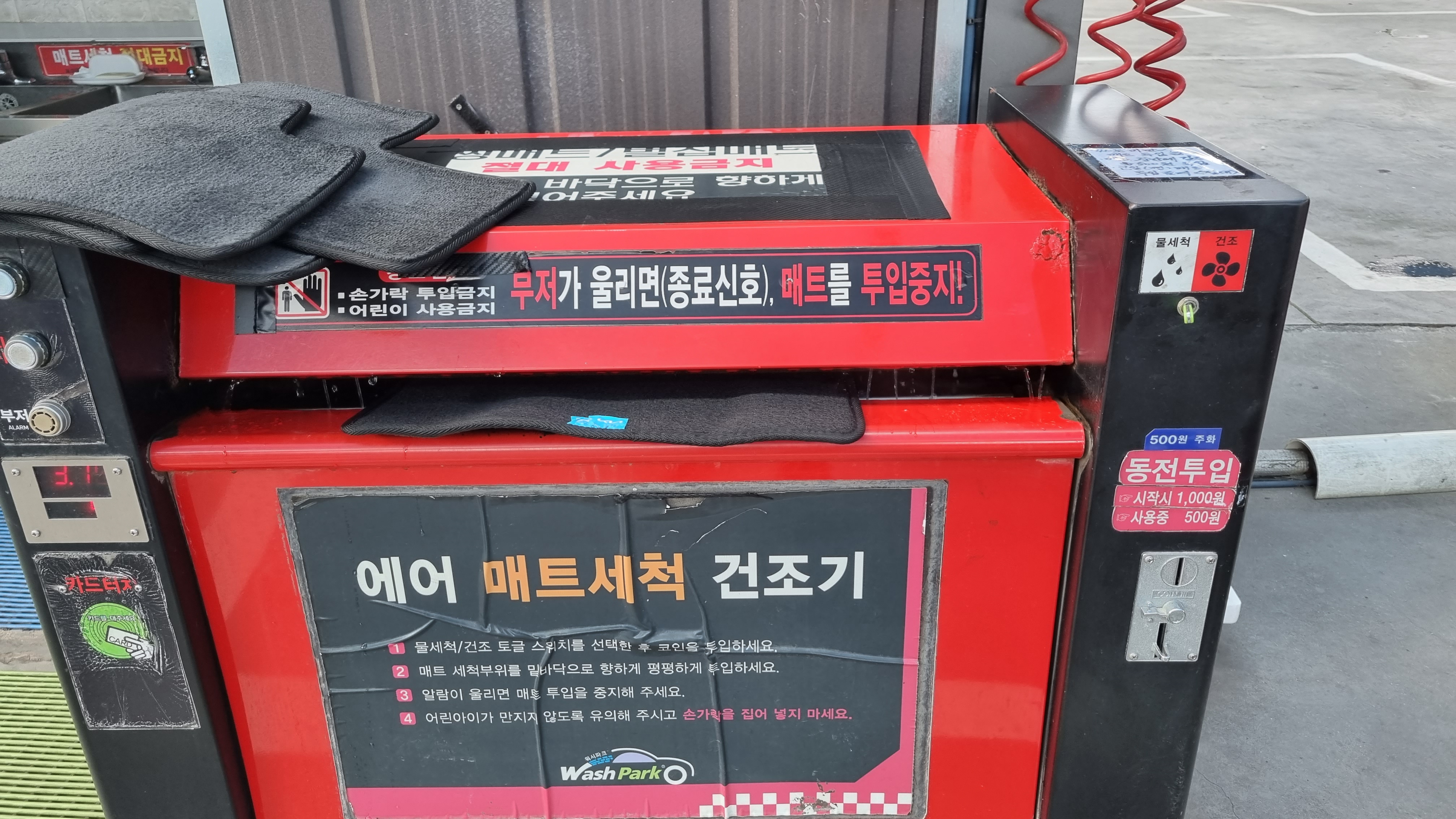 그런데 이 기기는 매트 청소가 마음에 안 들 때도 있는데 차라리 차량 고압세척 시 5백 원 정도 추가 투입하여 고압물세척으로 하는 것이 훨씬 더 깨끗하게 됩니다.