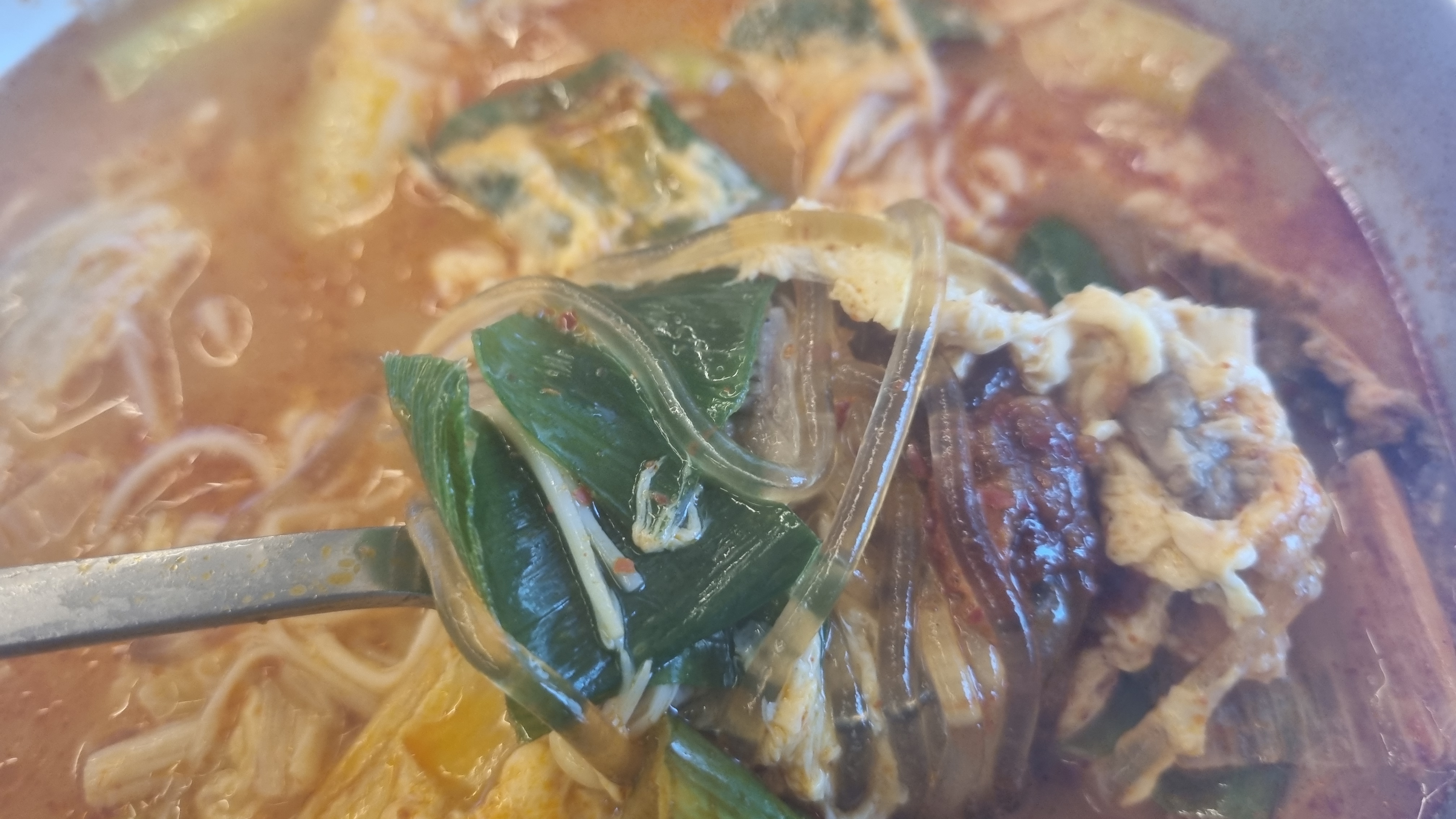 국물이 살짝 매콤한 기분이 들기는 하는데 매운 정도까지는 아닙니다. 당면과 계란이 듬쁨 들어간 기분이고 고추와 야채도 조금 들어갔습니다.