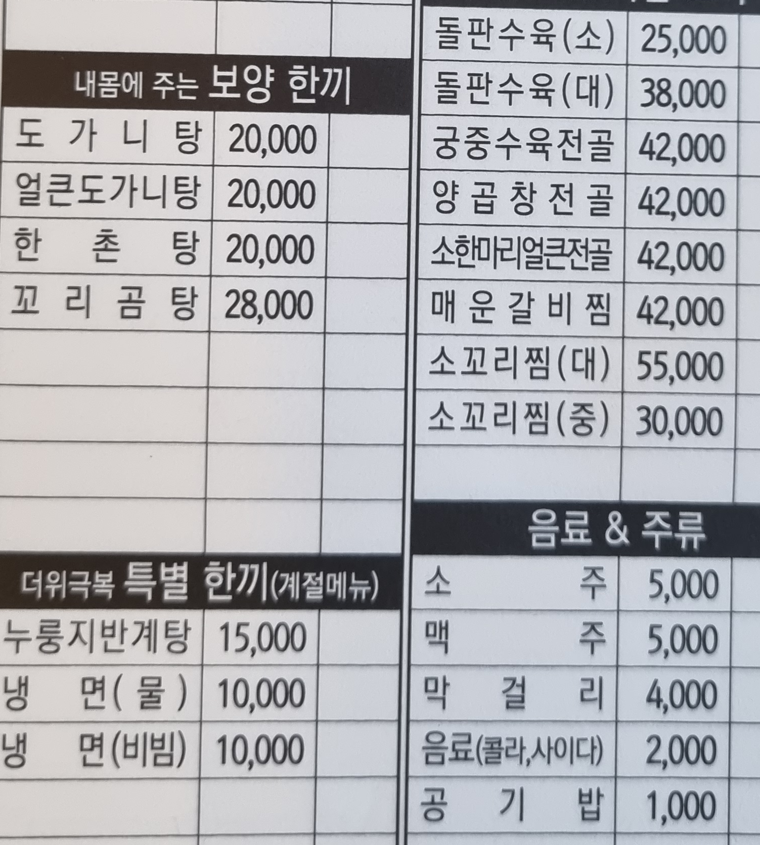 소머리곰탕과 양곰탕이 15,000원이며 기타 만두류와 전골 수육등이 있어 회식도 가능하겠습니다.