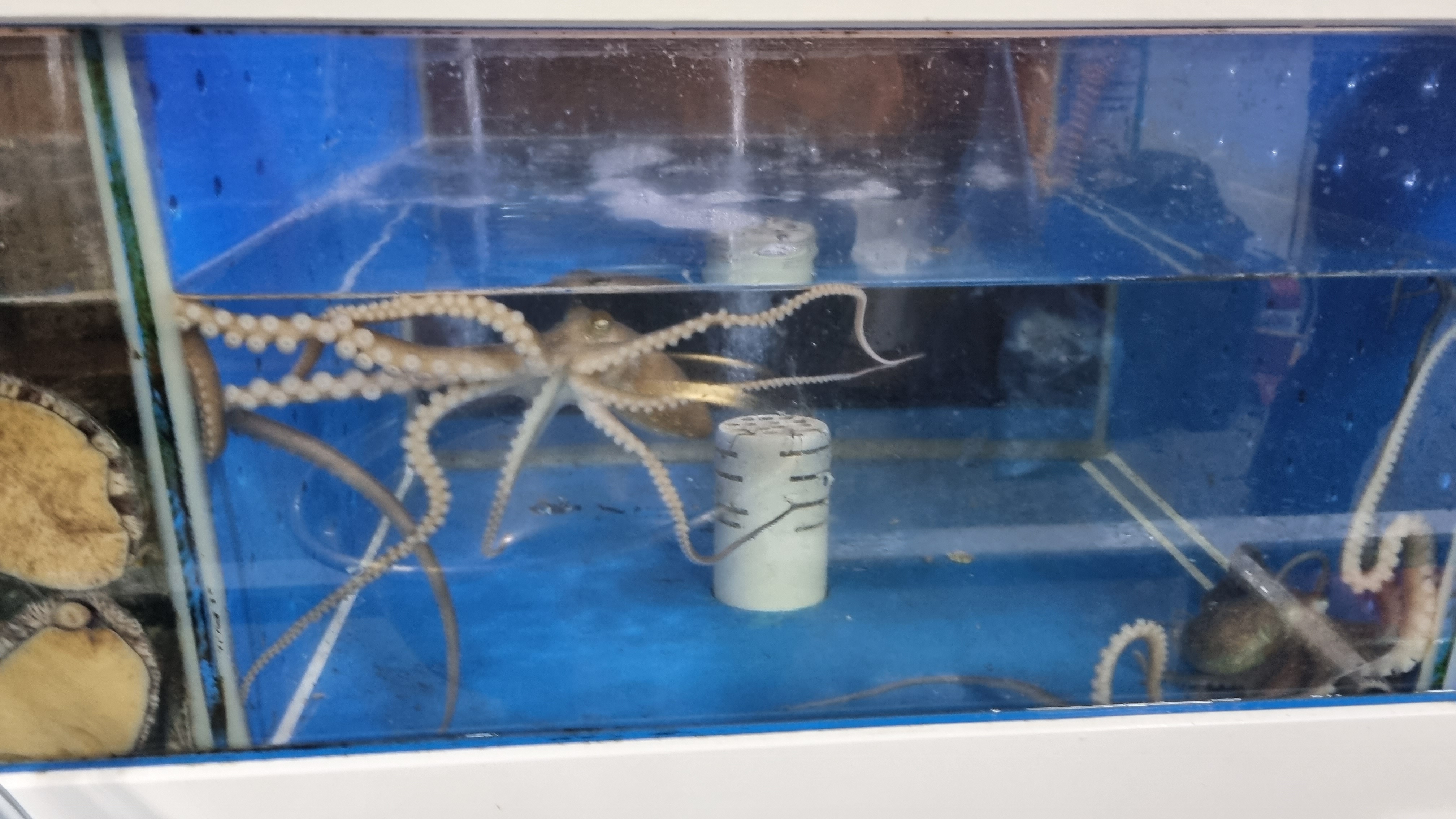 수족관에 생선횟감 대신 힘있는 낙지가 싱싱하게 살아 움직이고 있습니다.