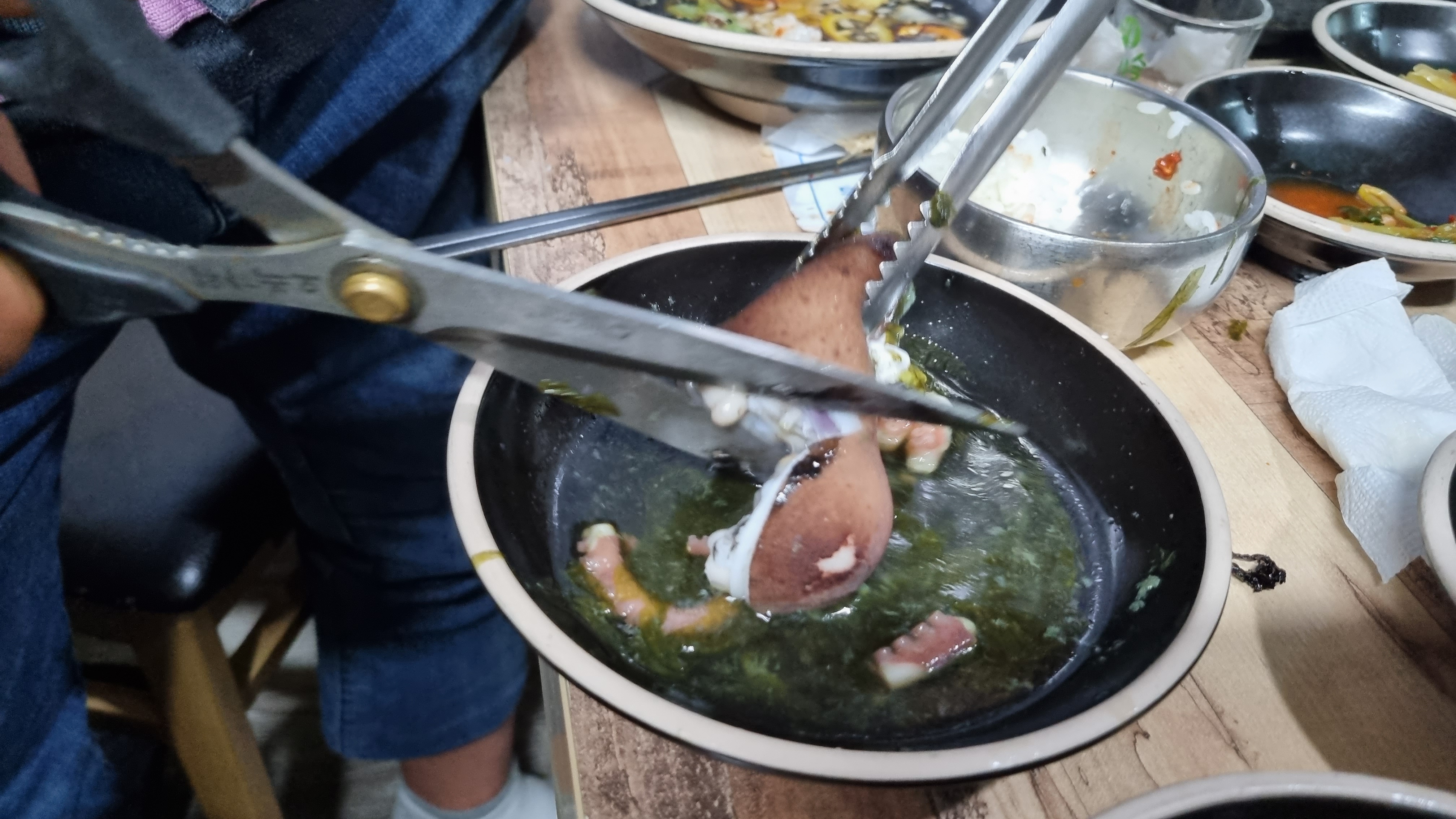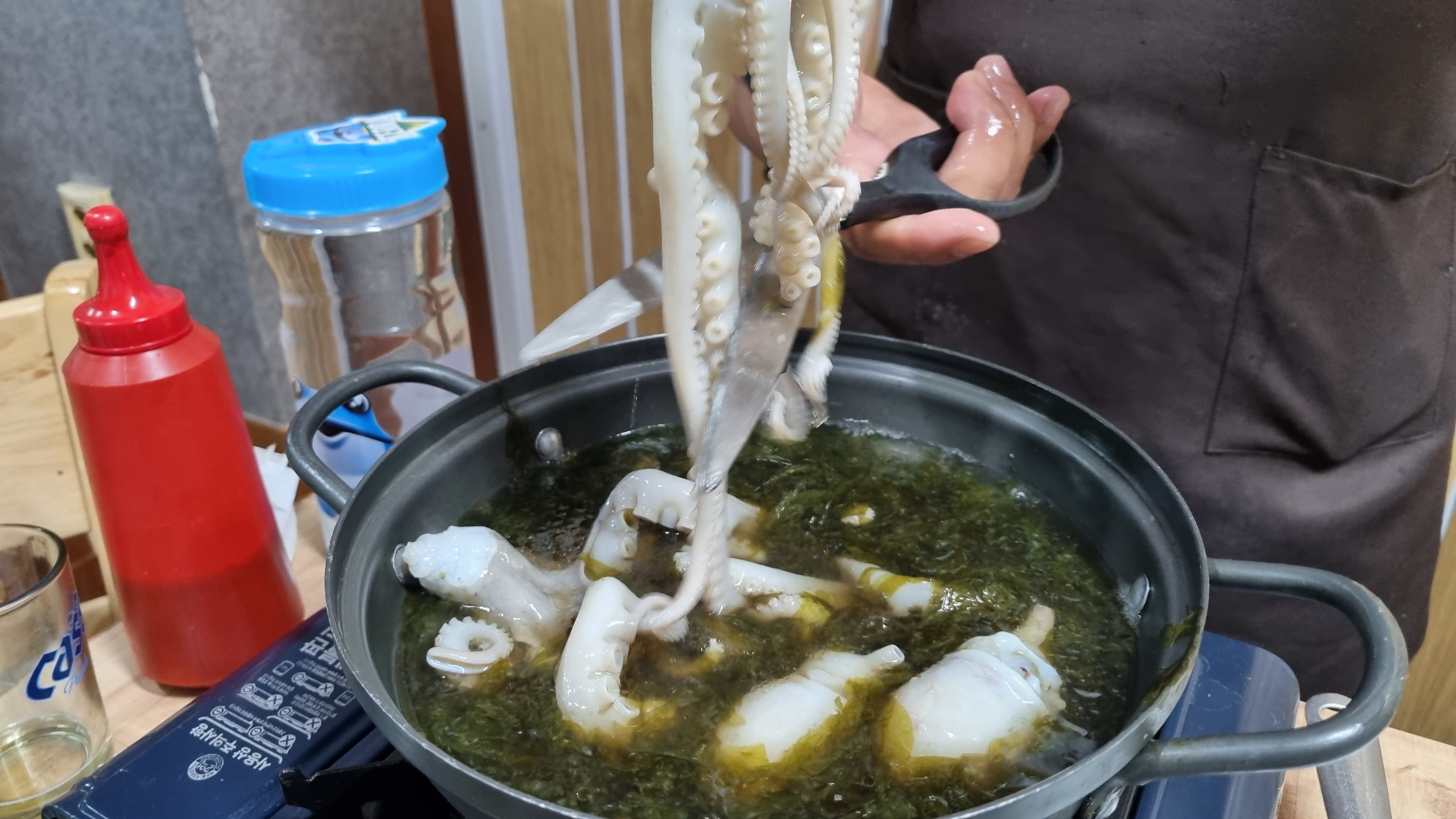 이렇게 한참동안 음식을 맛있게 먹어가고 있을 무렵 아마도 연포탕을 준비한 듯하는데 요리 이름은 정확히 모르겠는데 냄비에 뭔가를 끓이고 있습니다.