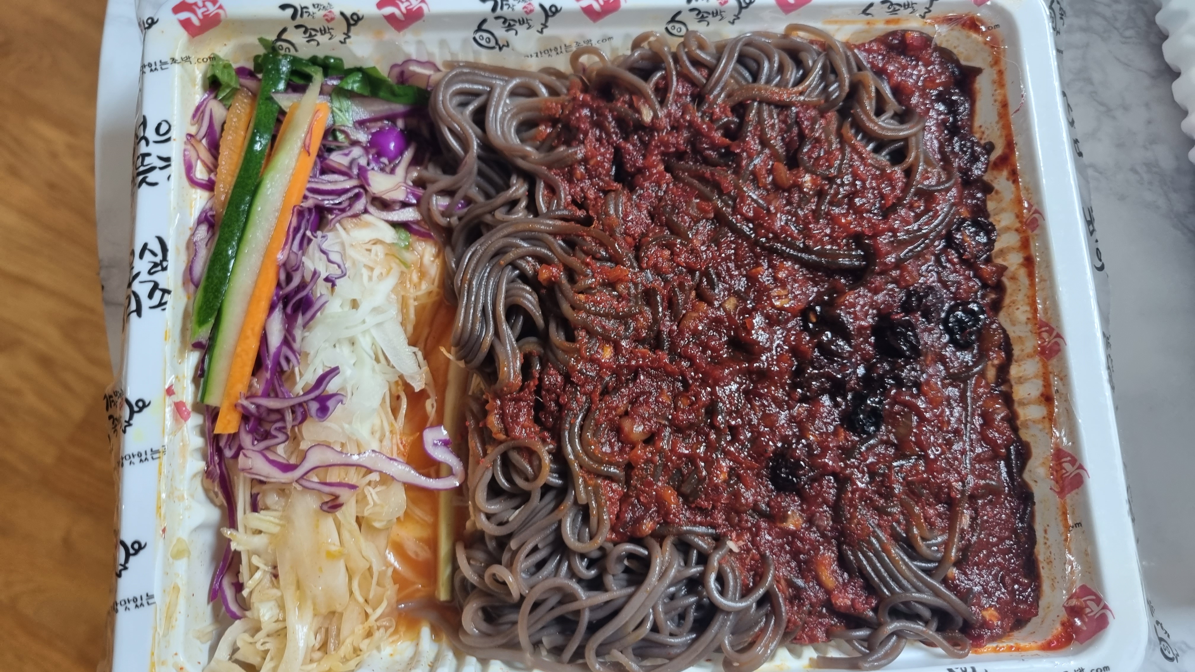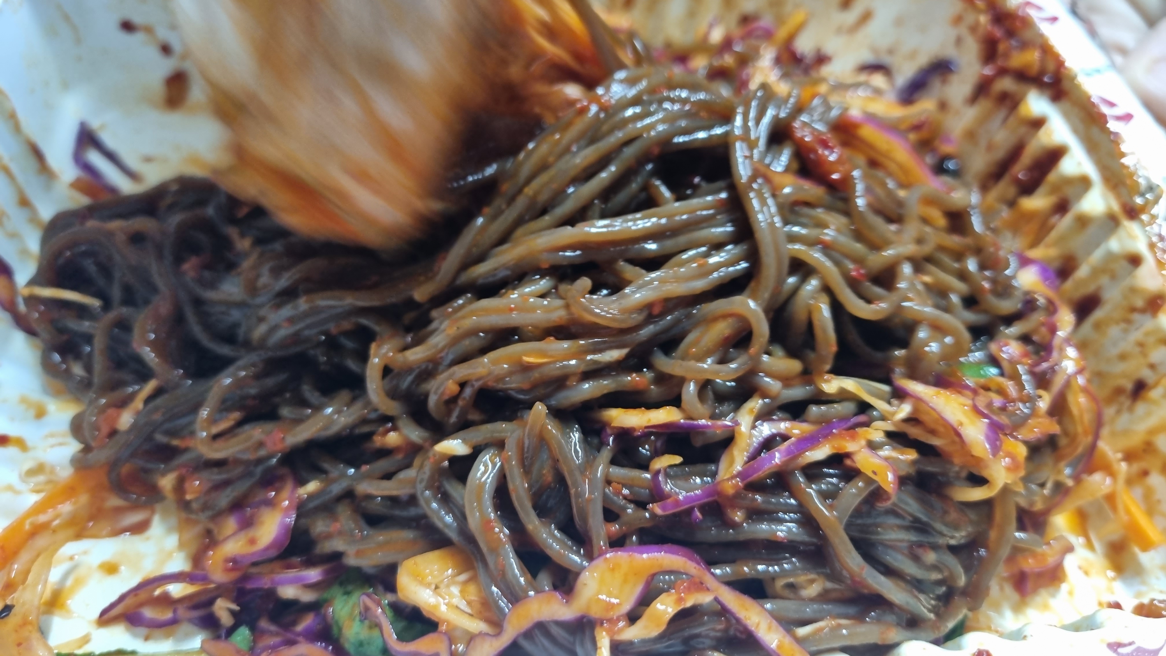 쟁반국수는 불거나 서로 엉켜 붙어 맛이 떨어질 수 있으므로 빨리 비벼서 먹는 것이 중요합니다, 처음에 면과 양념이 따로 있는데 빨리 잘 잘 비벼 드시면 정말 맛있게 드실 수 있습니다.