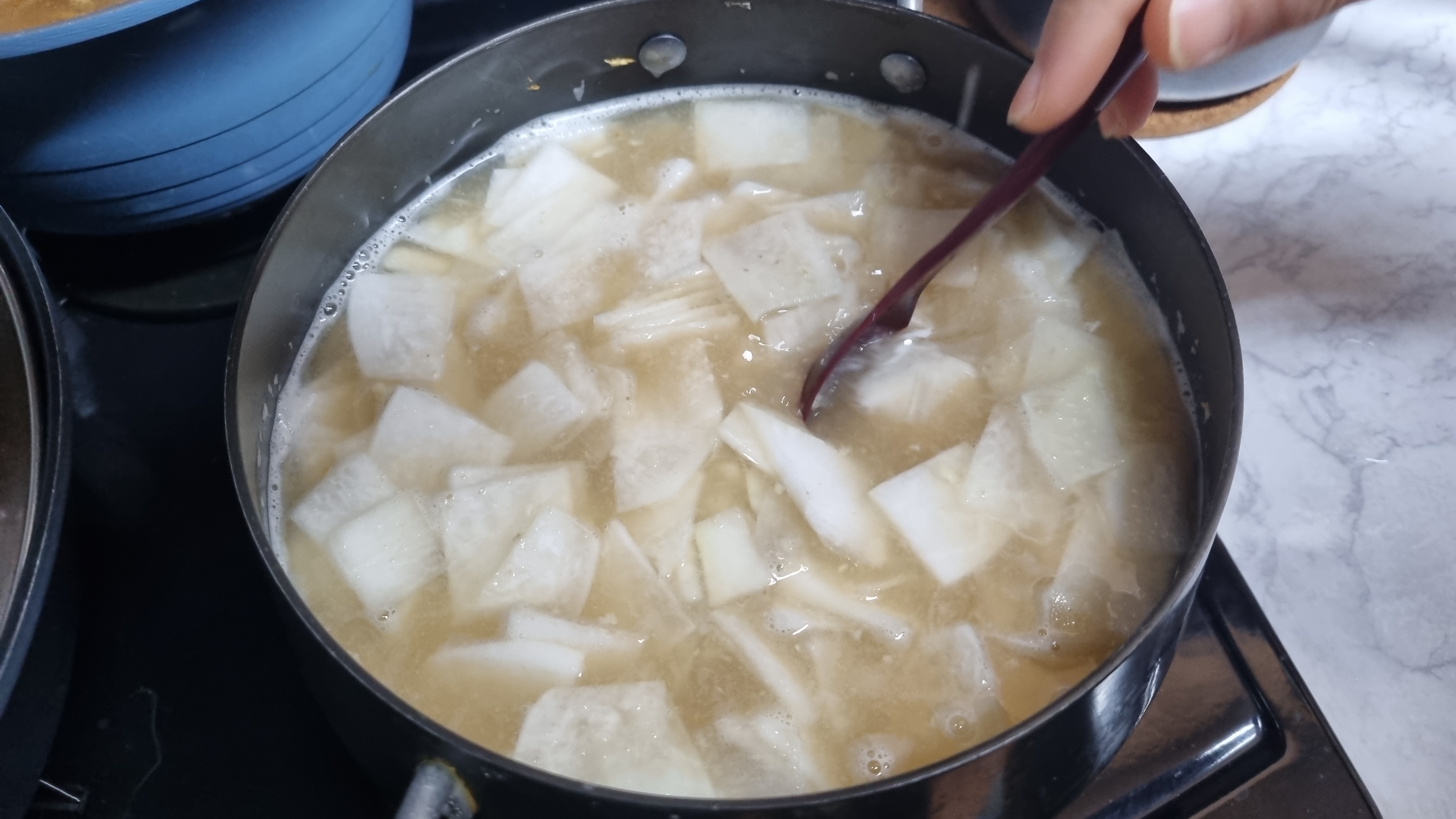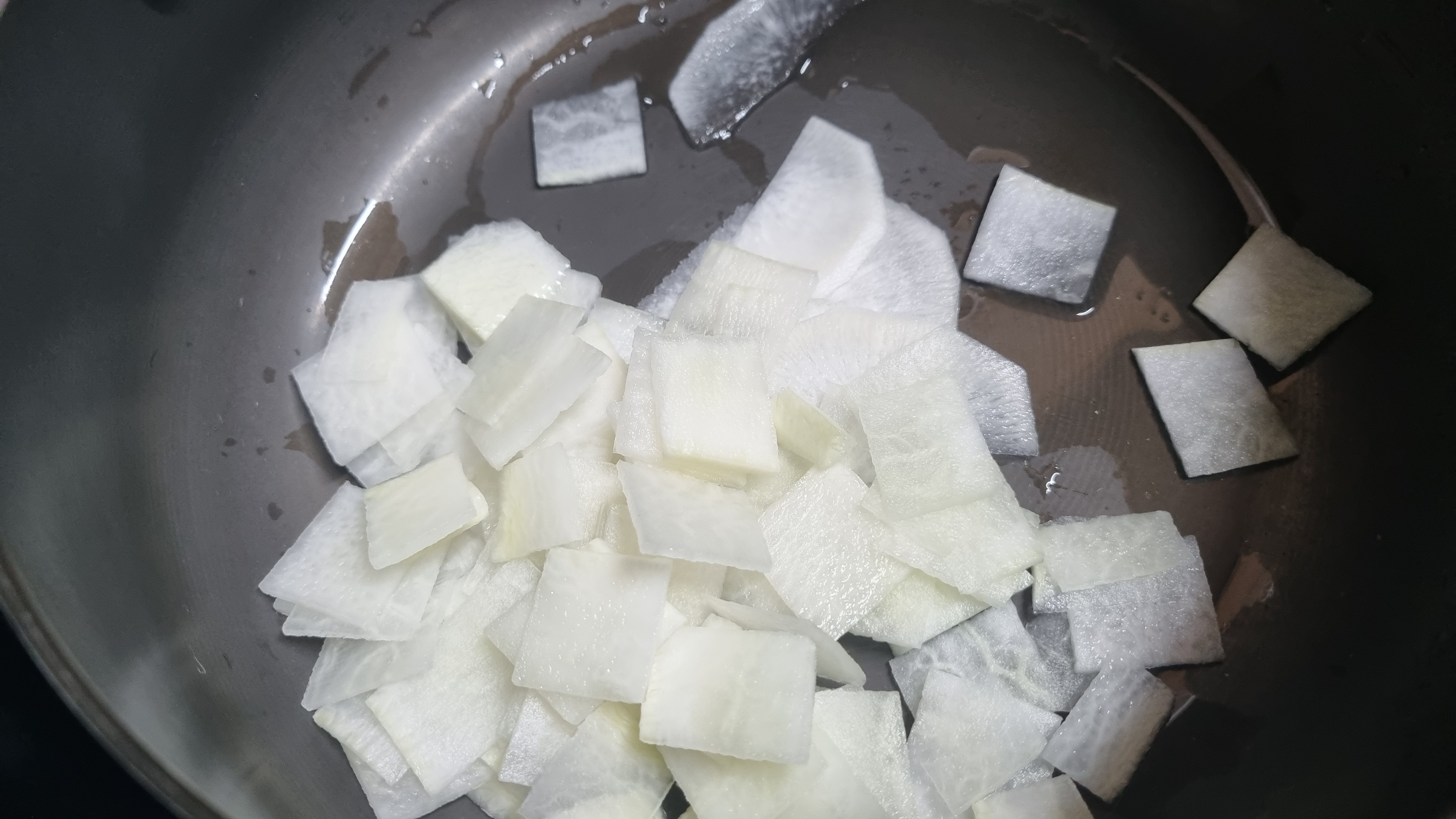 재료가 몇 가지 되지 않아 과정이 쉬운데 무를 냄비에 넣고 이어서 무, 다진 마늘을 차례로 넣습니다.
