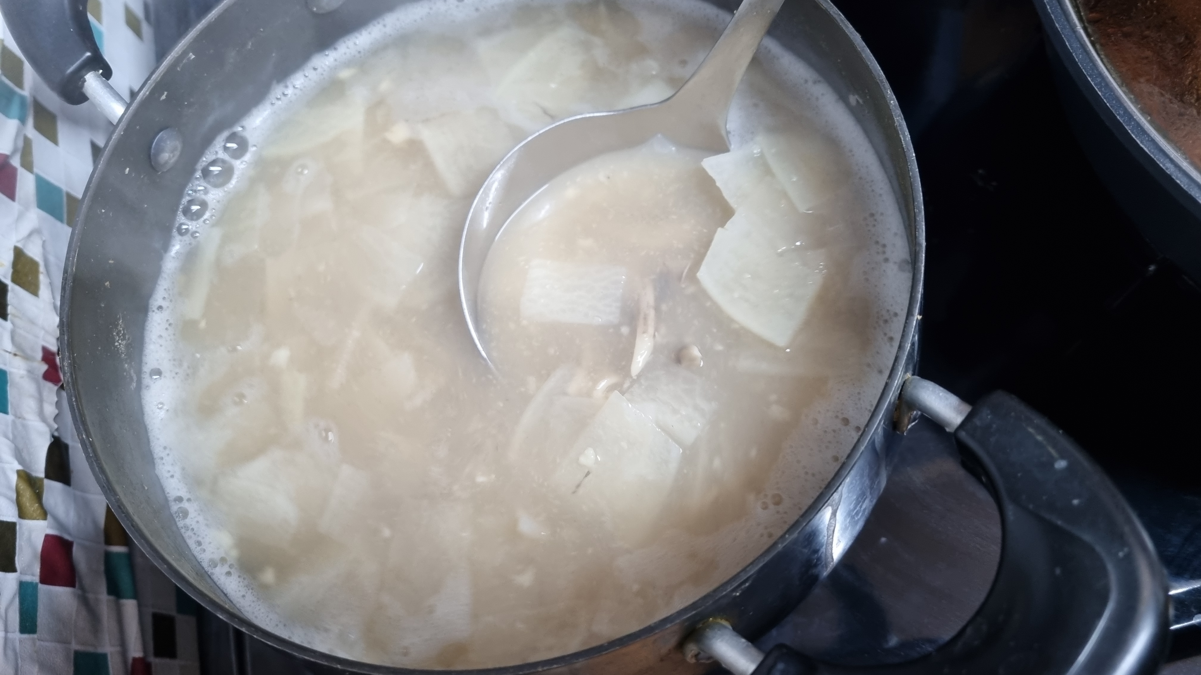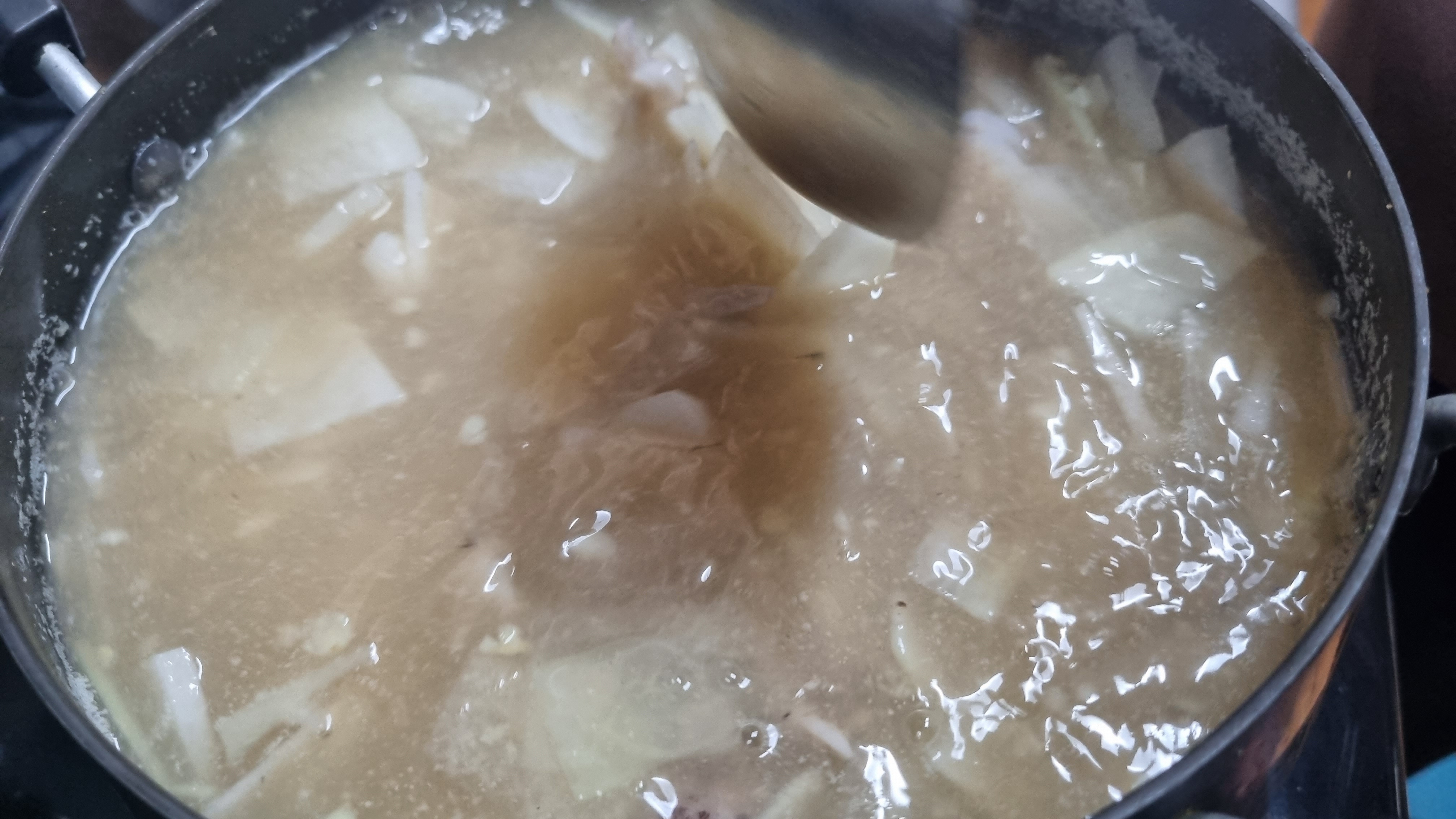 그리고 국물맛을 살짝 보고 간이 괜찮은지 미리 점검하시고 된장으로 조절하시거나 간장으로 조절하시면 되겠습니다. 이때 된장을 맛을 너무 진하게 하지 않아야 하는데 이유는 나중에 새조개를 넣는데 부족한 부분을 새조개가 완전하게 맛을 추가하게 됩니다.