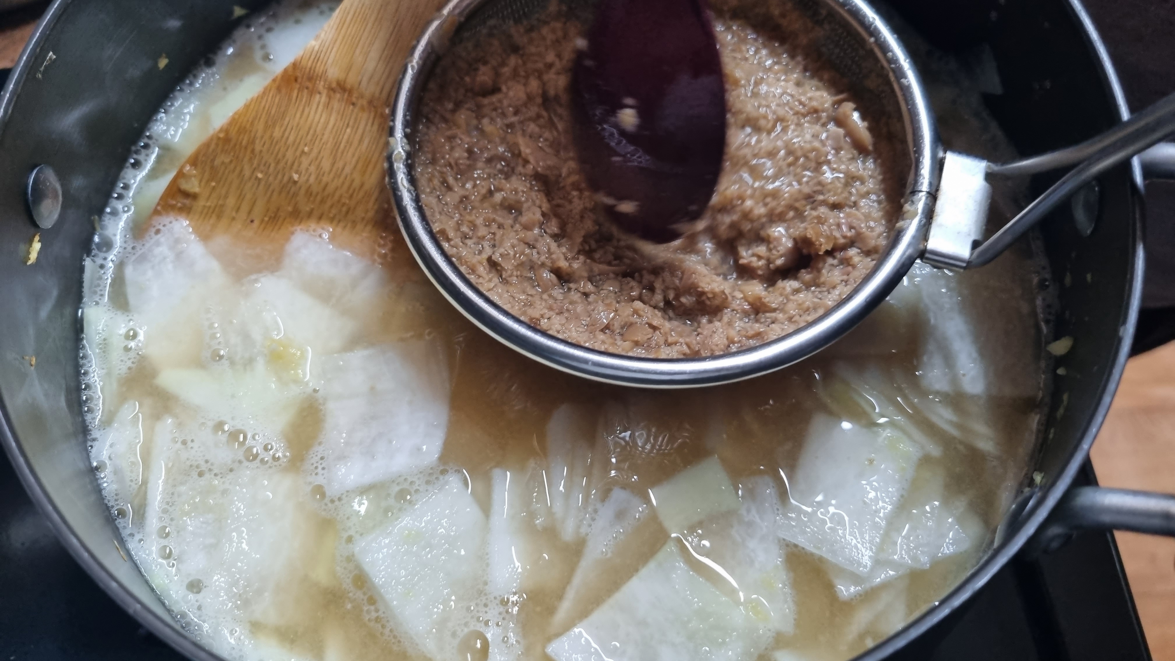 이어서 된장을 준비하는데 된장은 그대로 넣어도 상관없고 깔끔하게 보이기 위해 체망을 이용하여 걸러서 넣어도 되는데 맛에는 상관이 없습니다.