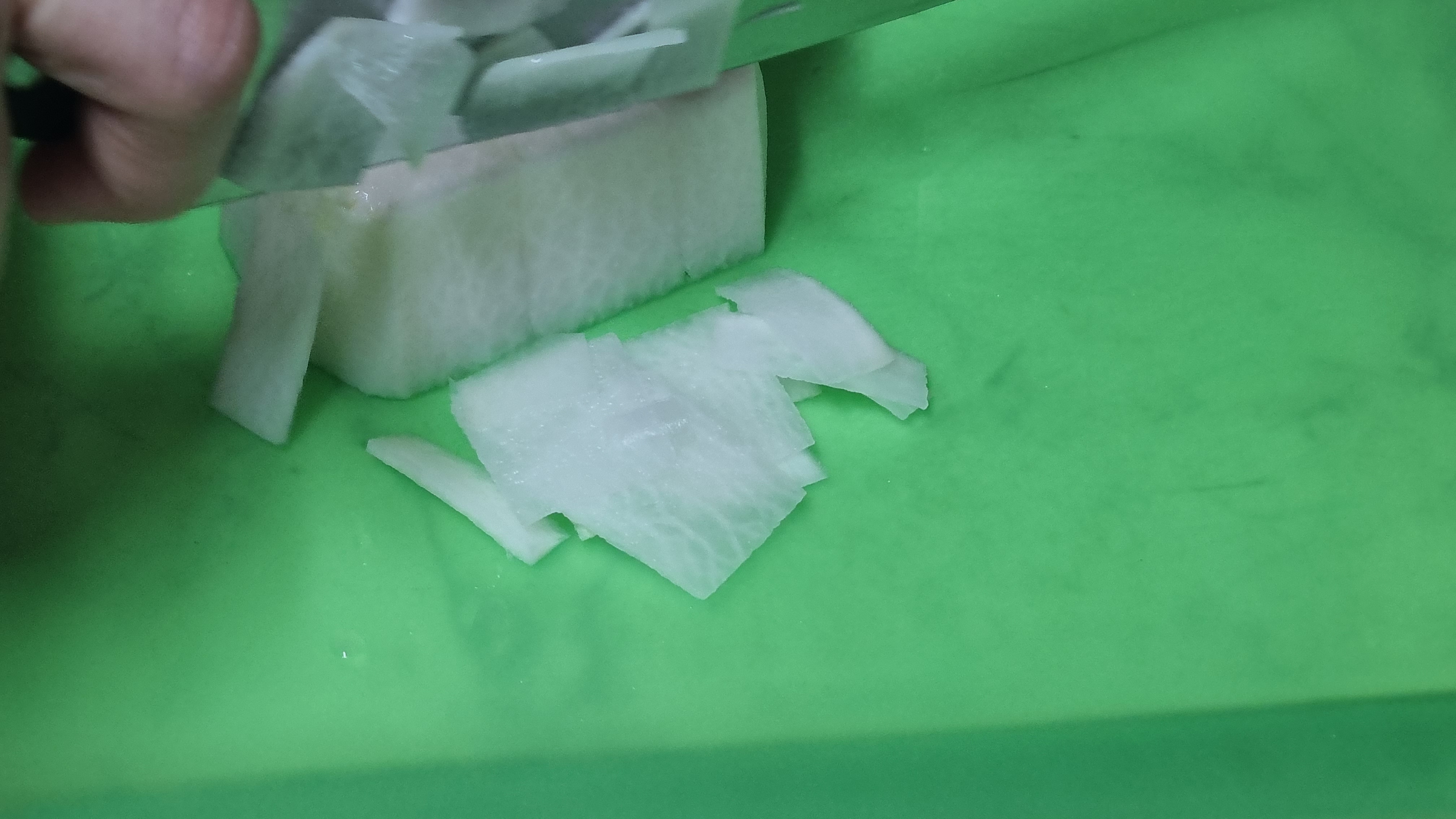 먼저 무를 썰는데 두께는 5mm 이하로 썰어야 잘 익고 식감도 좋습니다. 그렇다고 너무 얇게 썰어도 맛이 덜어지니 3~5mm 정도가 적당한 듯합니다.