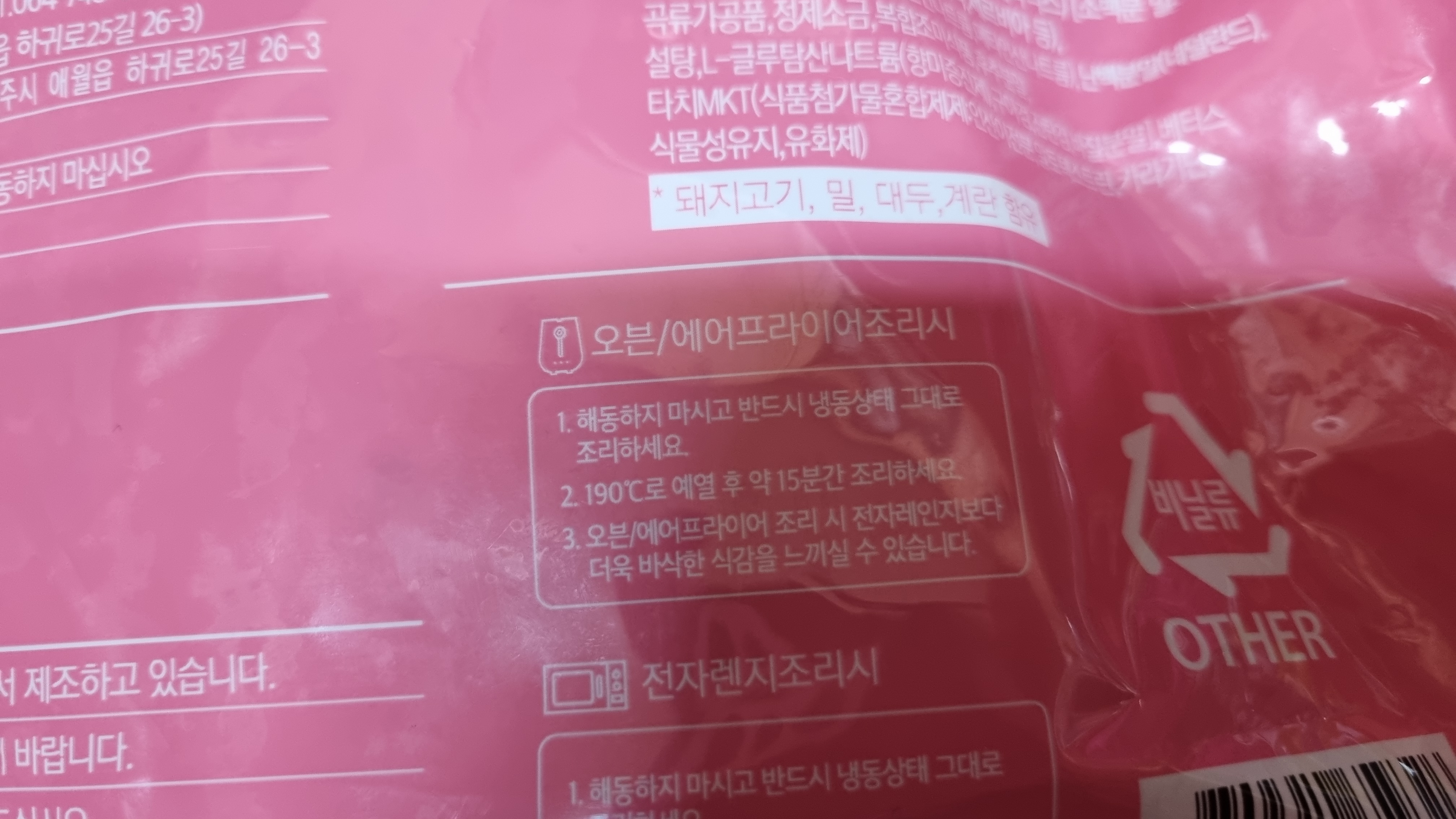 돈가스 봉지 뒤면에 조리방법도 잘 설명되어 있어 그대로 따라 하면 누구나 가능할 것 같습니다. 전자레인지와 오븐 에어프라이어 조리법이 잘 나와 있습니다.