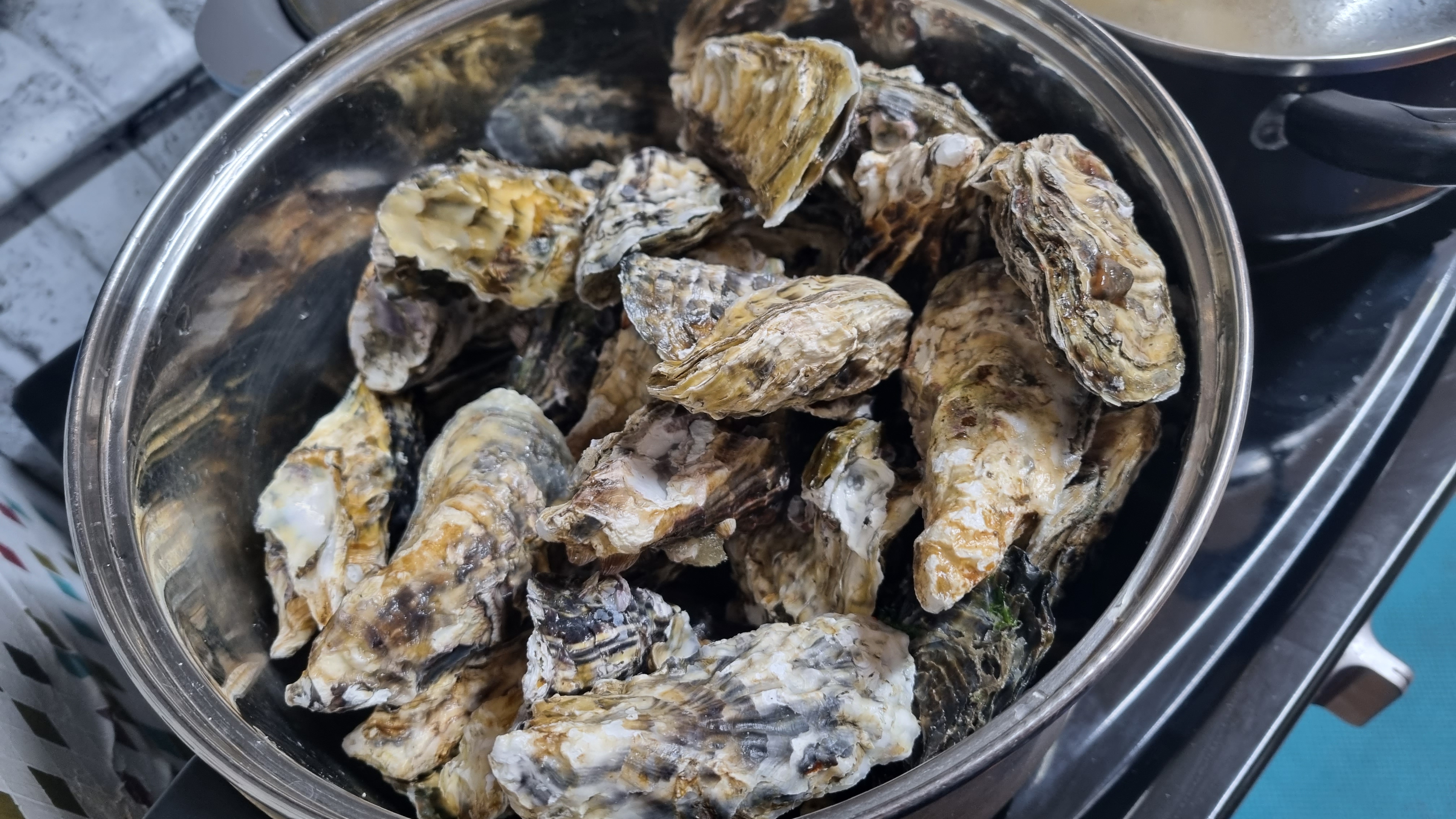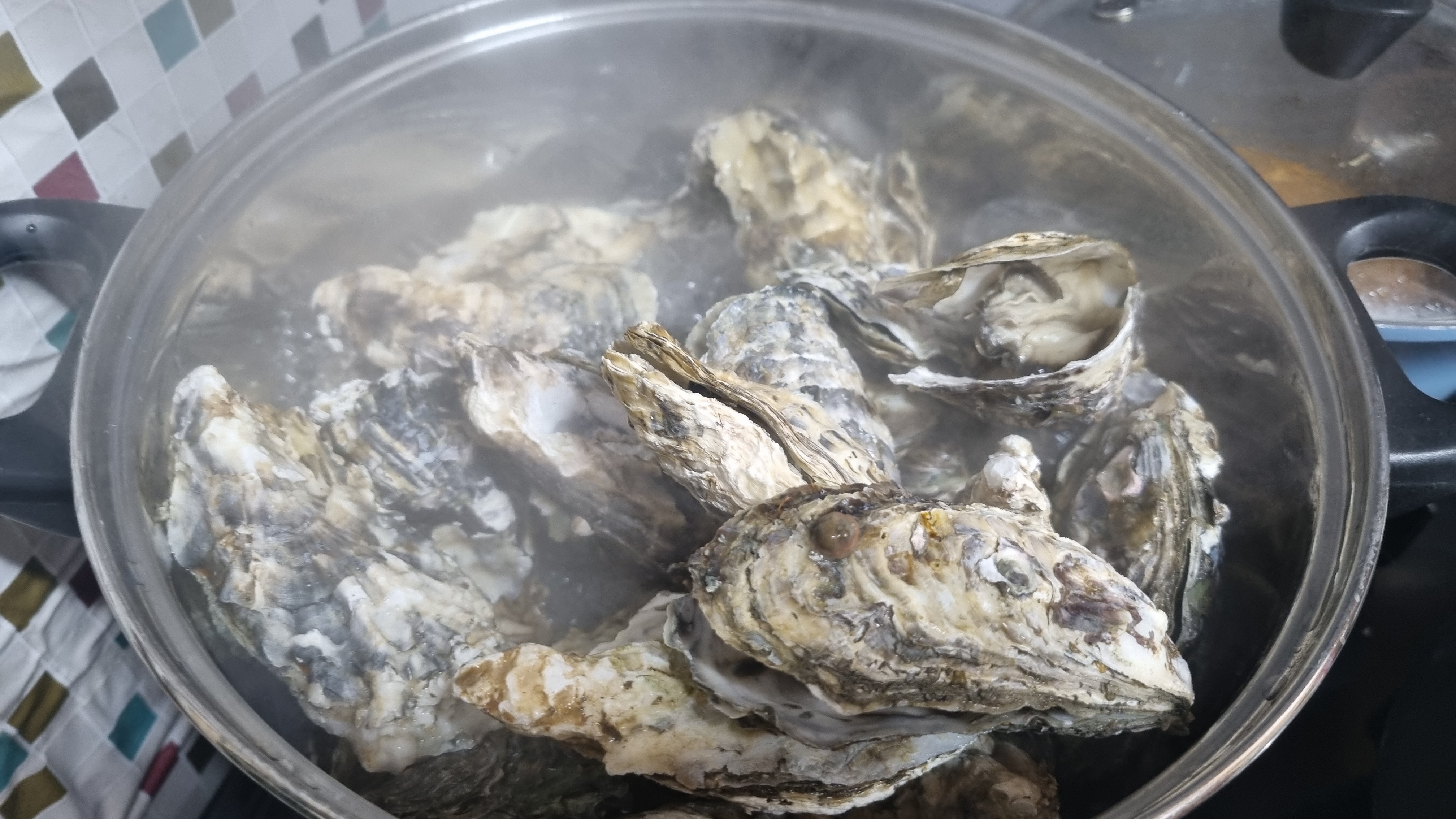 3~4분이 지나면 뚜껑을 열면 이미 입이 벌어진 굴들이 많을 텐데 이때 맛을 보면서 삶아진 상태를 확인합니다.