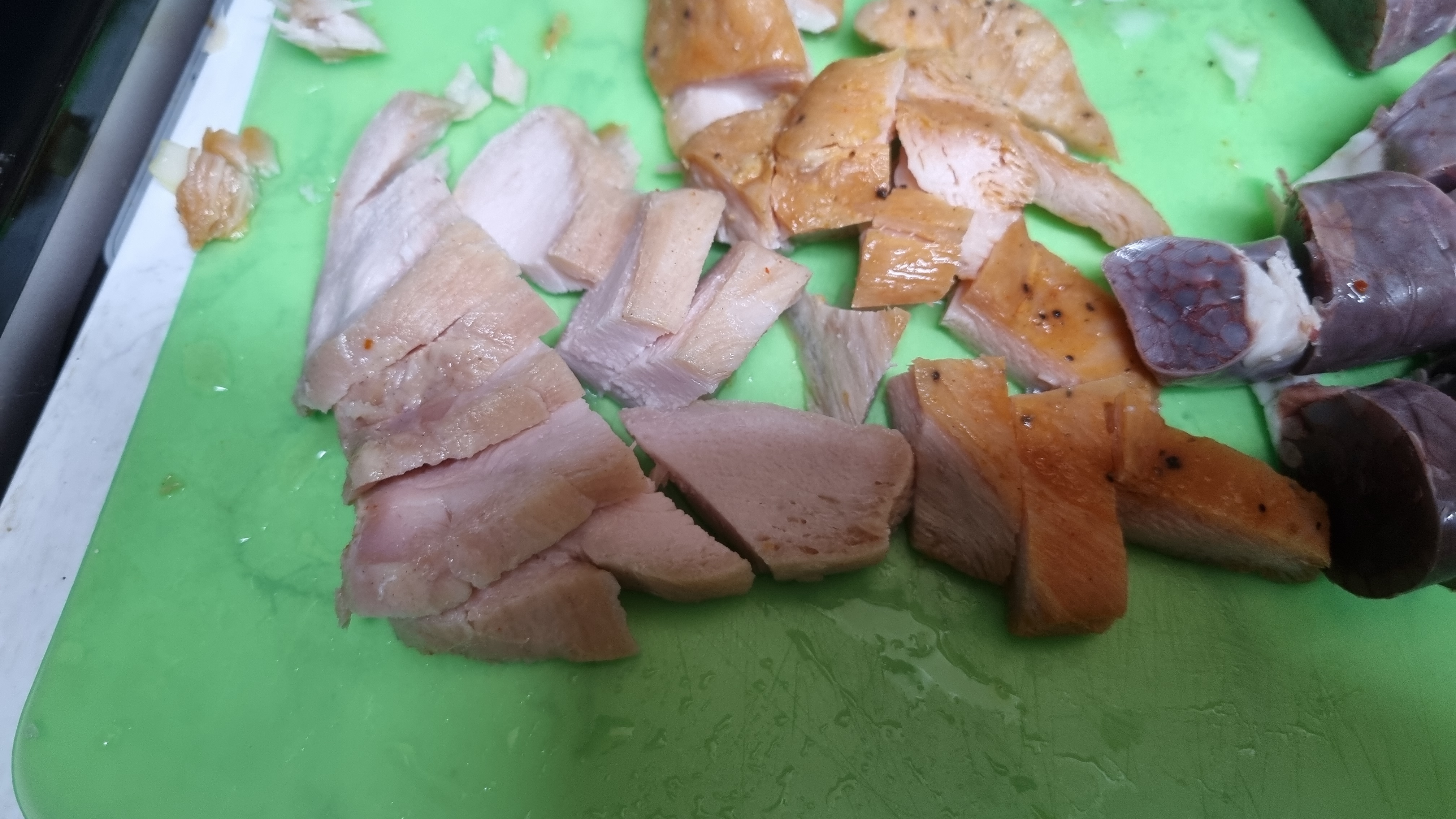 햄이나 순대도 미리 썰어 준비하는데 필자는 집에 닭가슴살이 조금 남는 것이 있어 이것도 넣었습니다. 햄은 집에 스팸 조그마한 것이 있어 하나 넣었습니다.