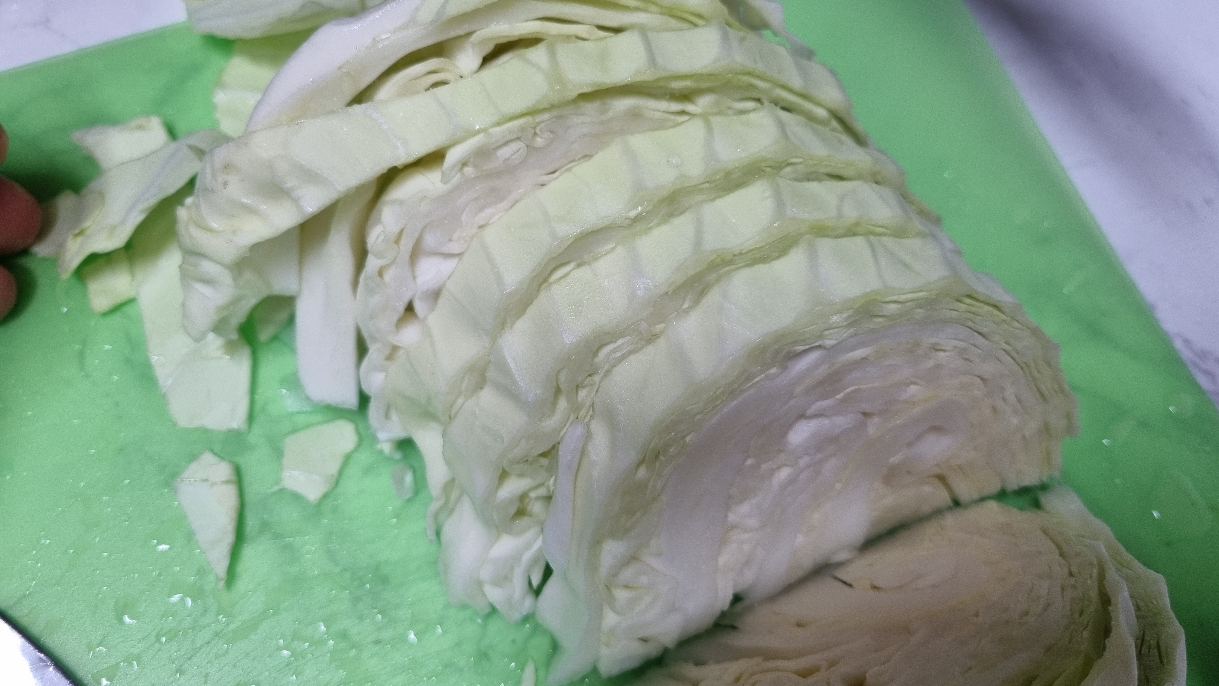 하나 한나 다듬기 시작하는데 양배추는 두께가 약 1cm 정도면 적당하고 양파는 평소에 다른 음식 만들 때 크기로 자르면 되겠습니다.