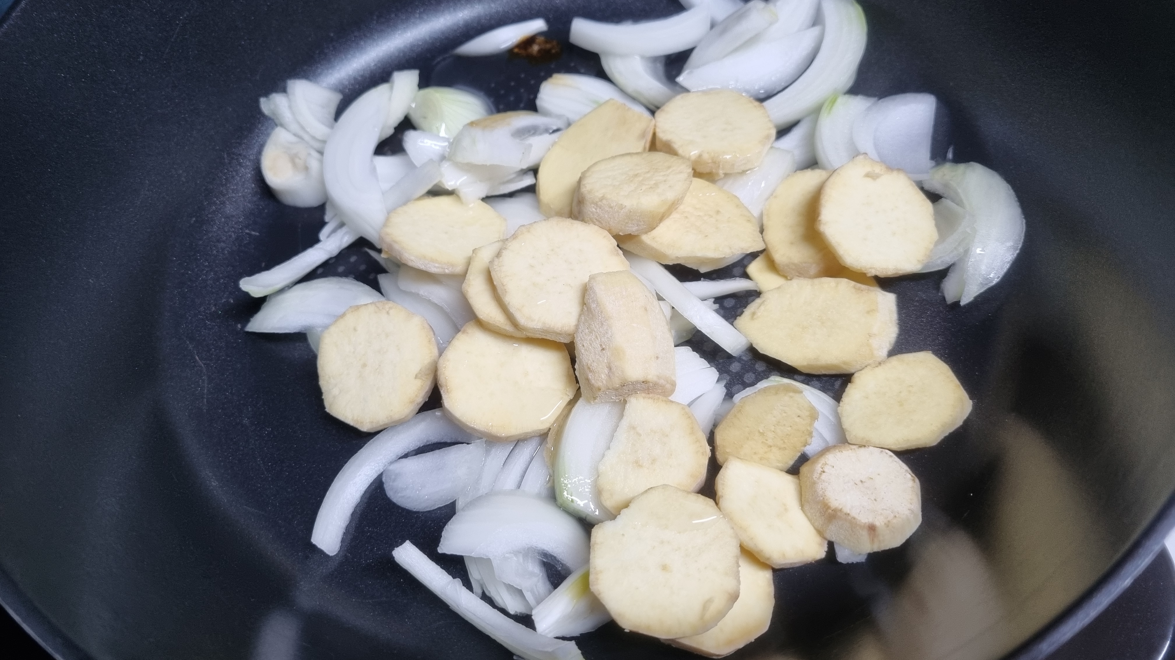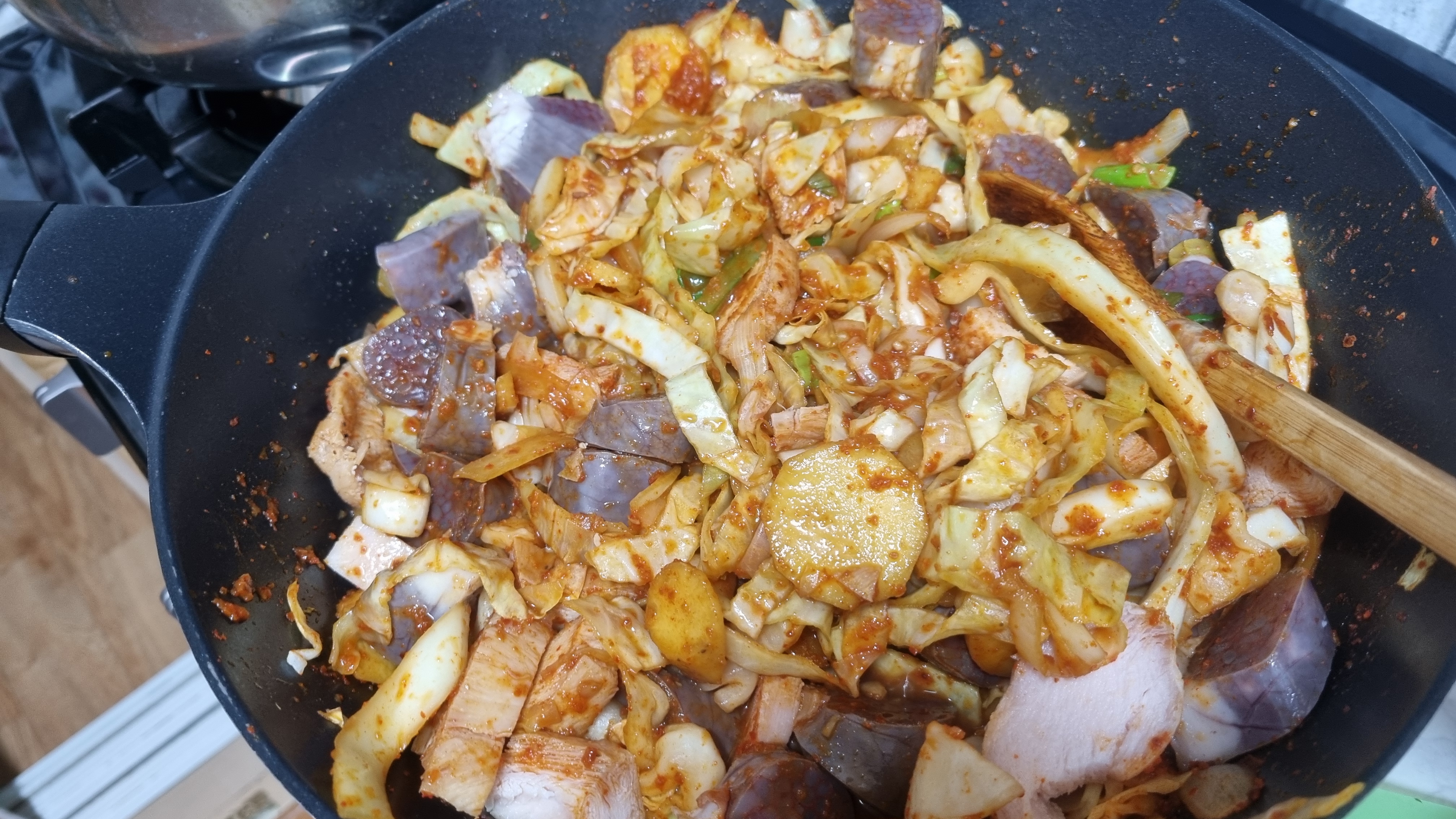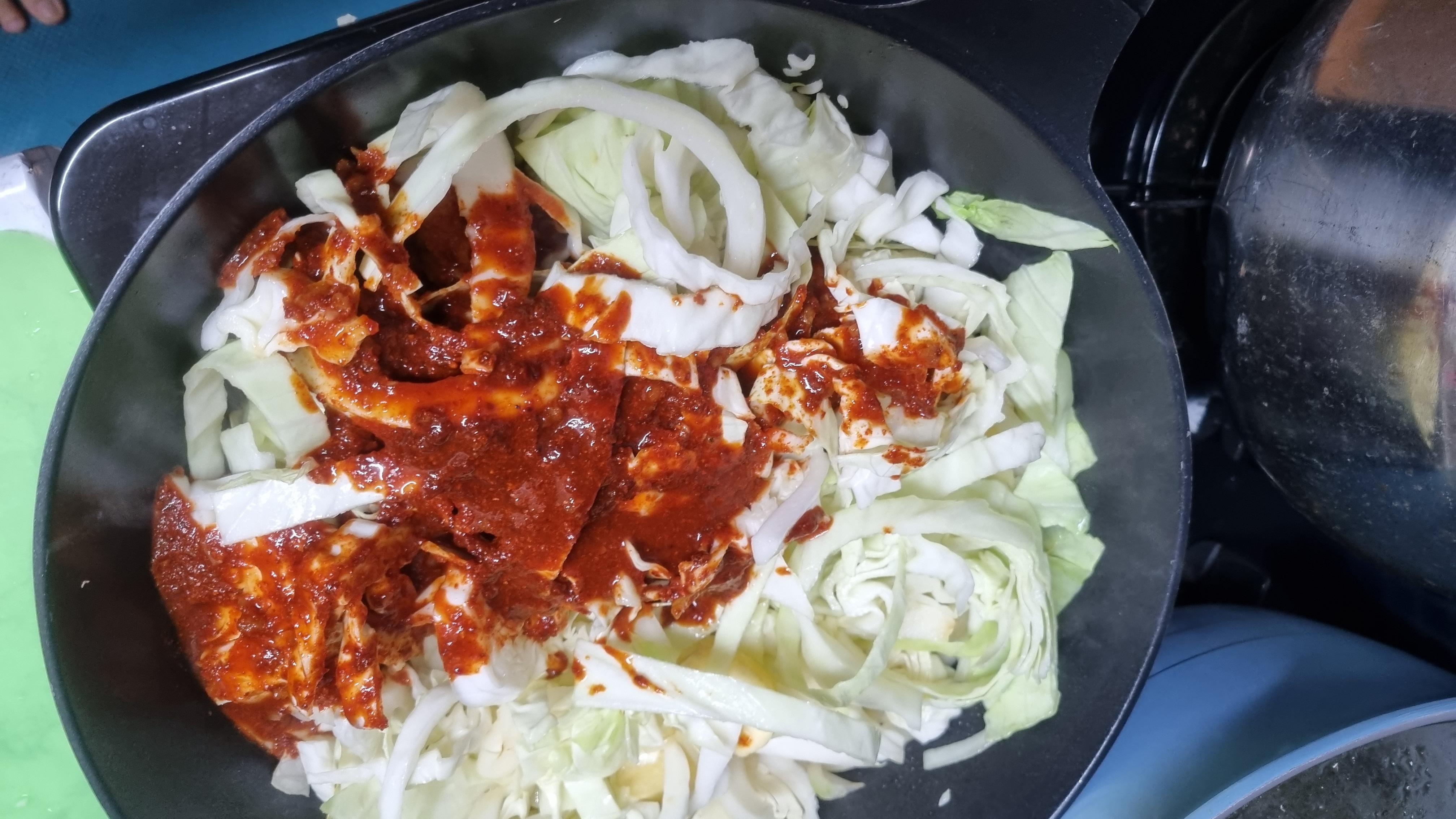 냄비에 기름을 바르고 먼저 양파와 고구마를 볶아줍니다. 고구마가 살짝 익혀진 상태에서 양패추와 양념장을 넣어 계속하여 볶아주면 됩니다