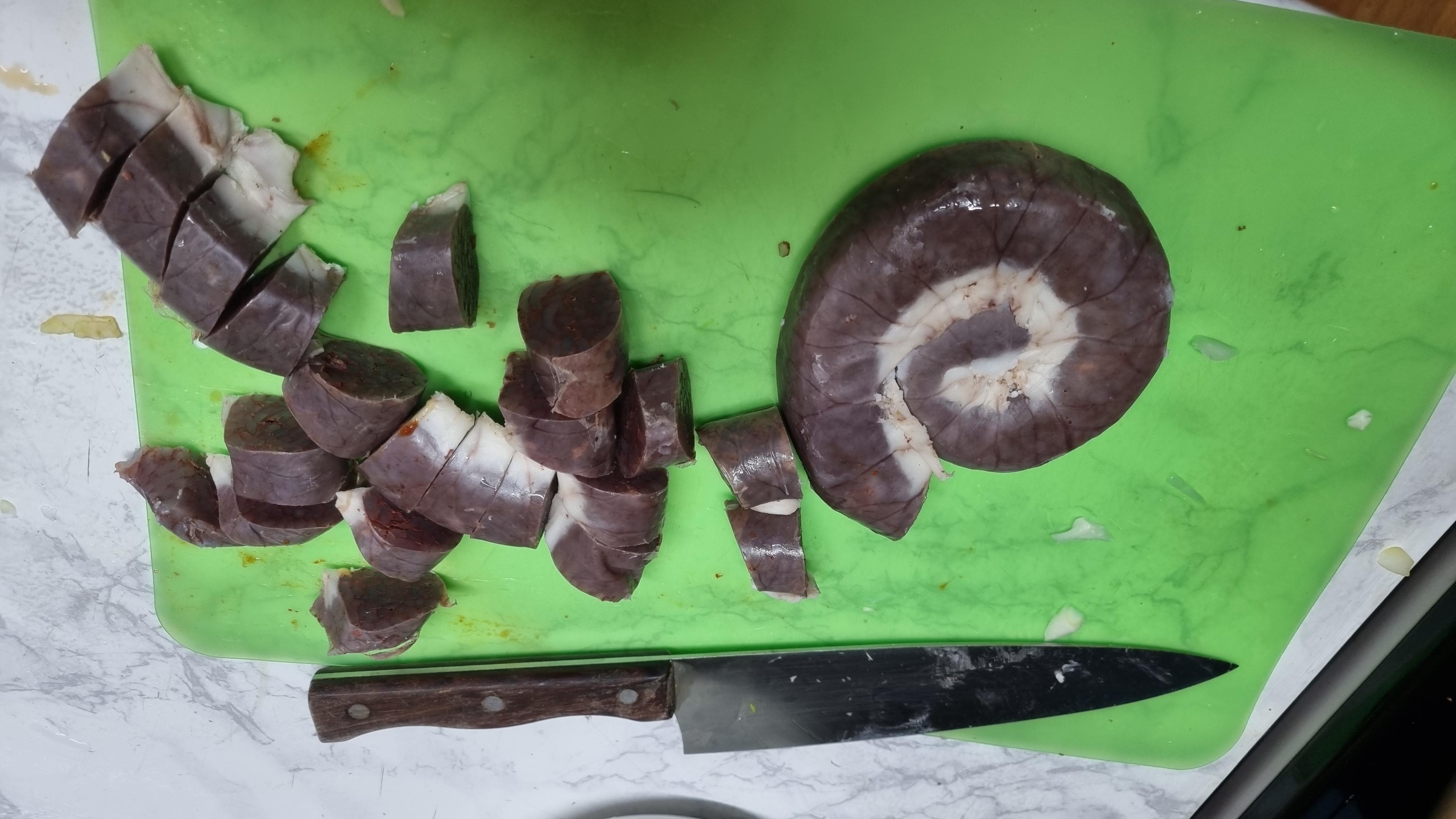 순대는 두께를 잘 조절하여 썰어야 하는데 두께는 2cm 정도가 적당하였습니다.