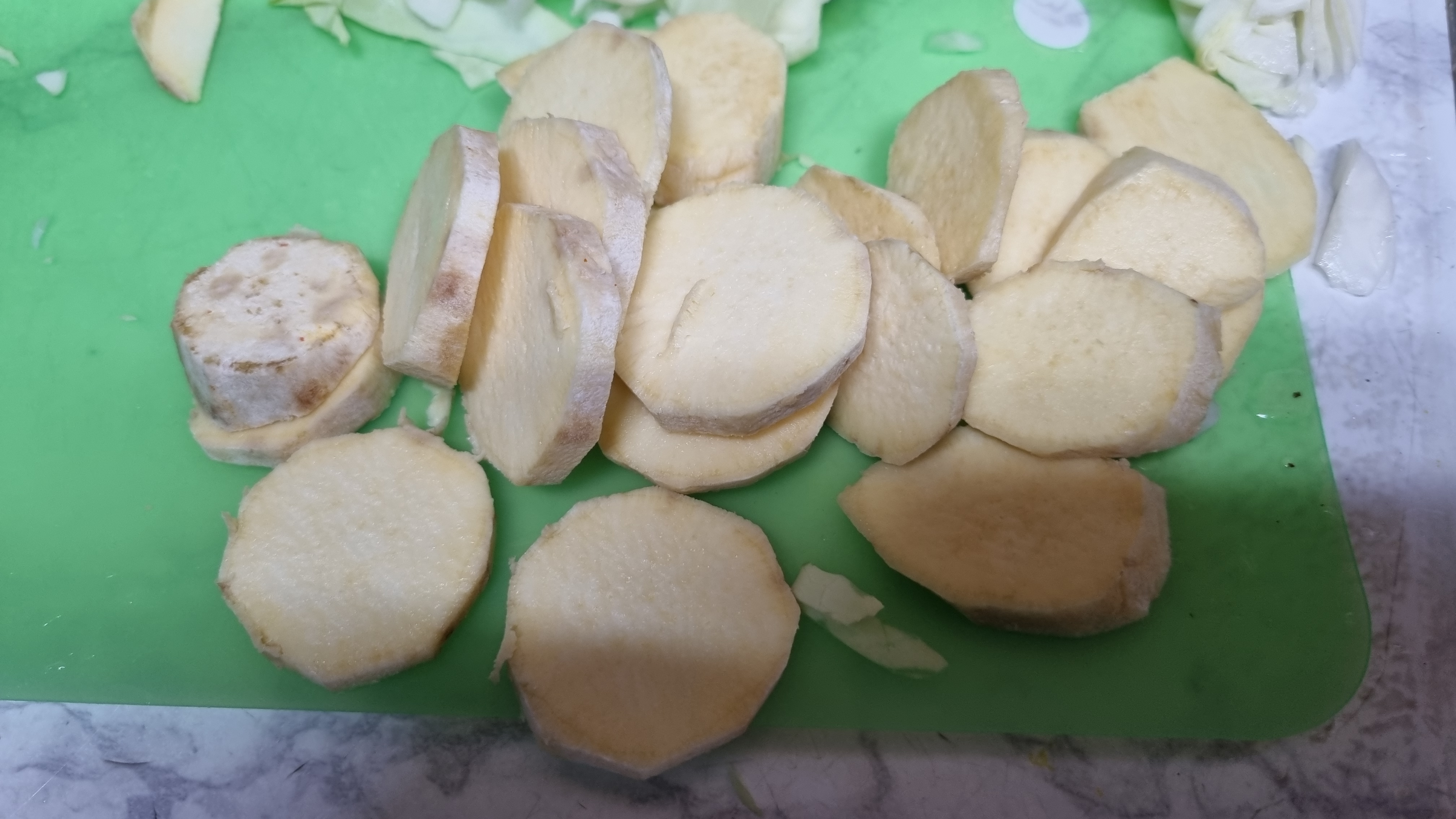 고구마는 두께가 0.5cm 정도면 적당하는데 없으면 넣지 않아도 되지만 이것이 의외로 맛있습니다.