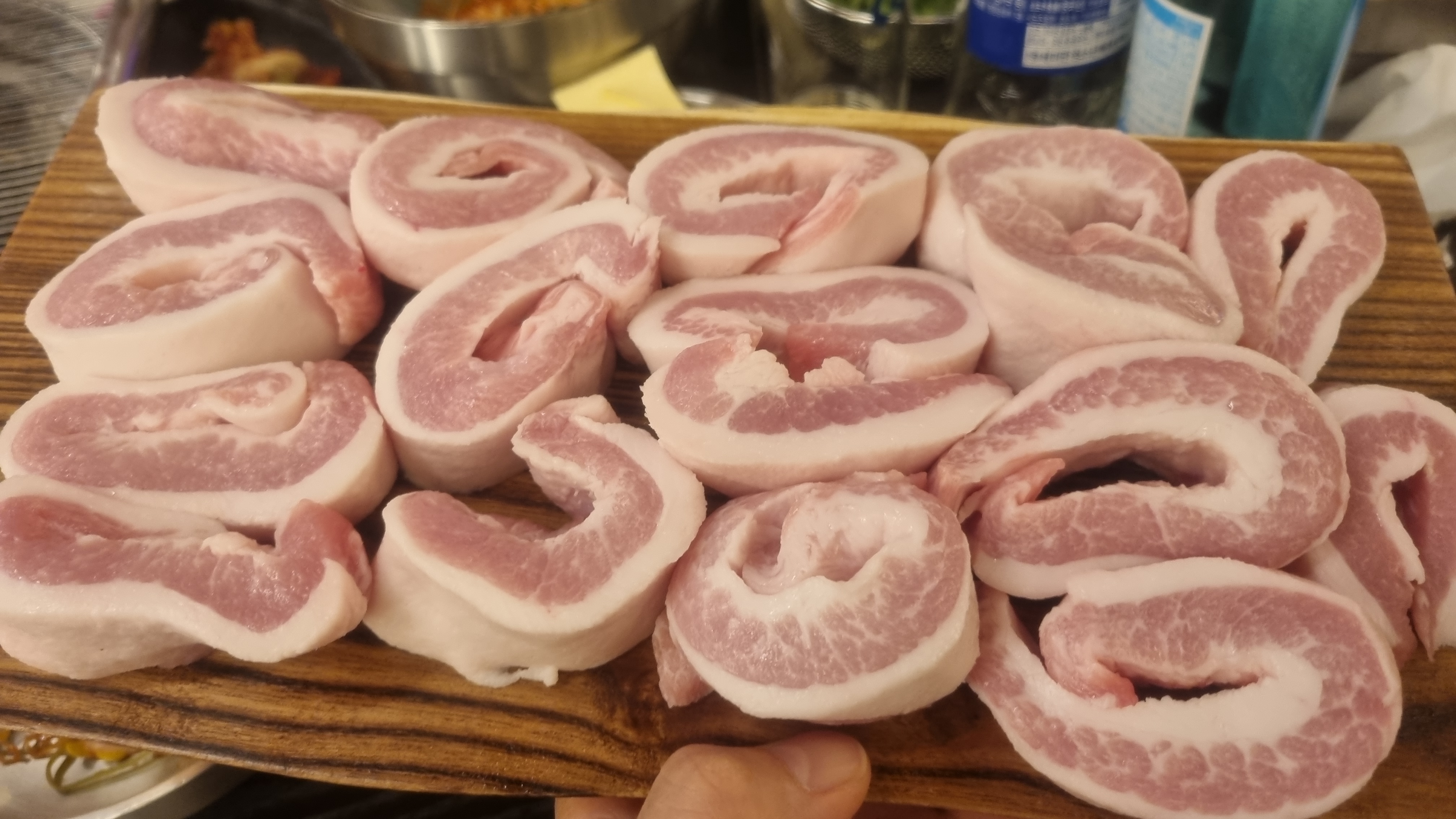 삼겹살은 크게 덩어리로 나오며 구우면서 잘라드셔야 합니다
