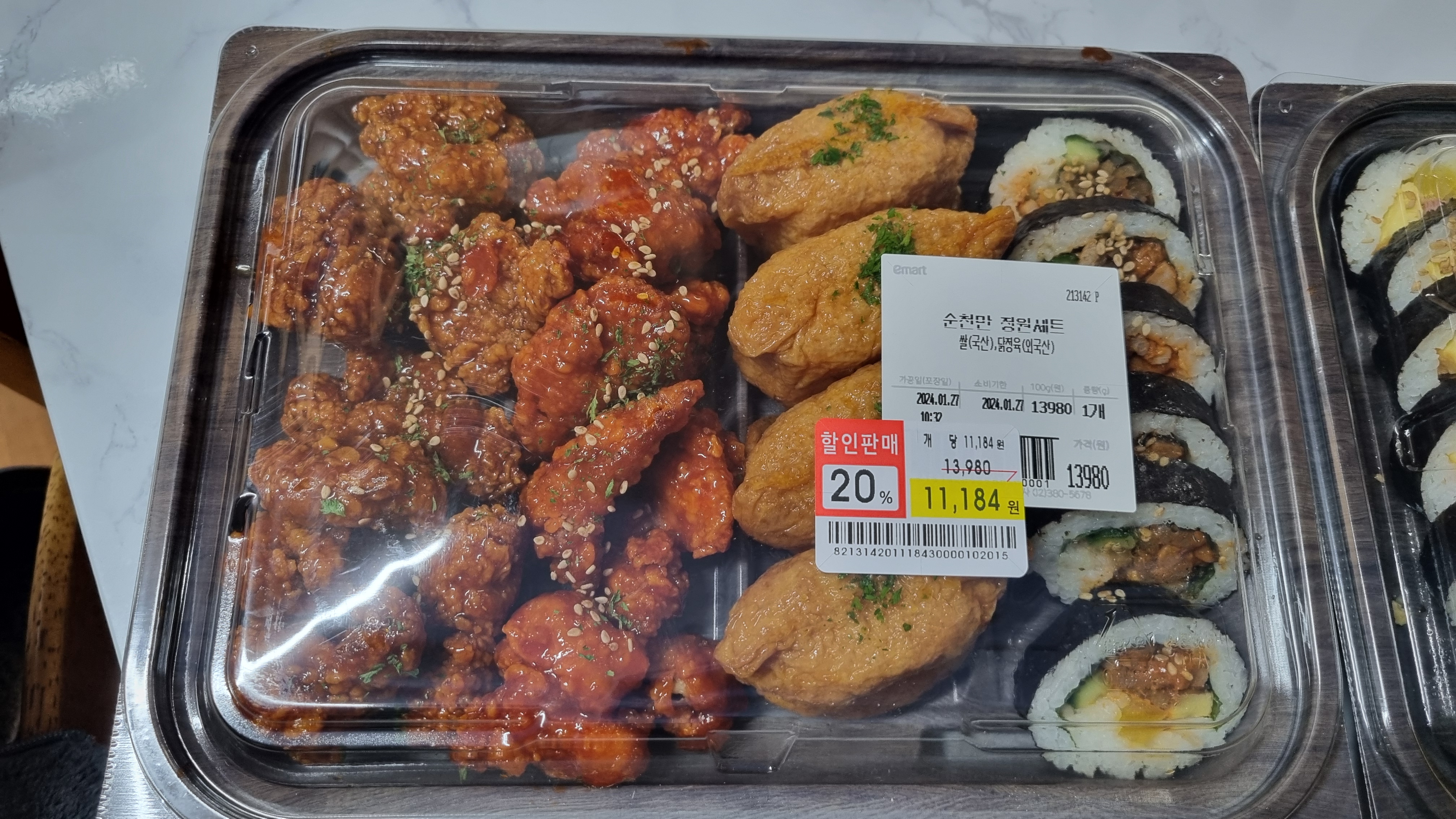 개인적으로도 가장 좋아하고 또한 애들도 상당한 좋아하는 메뉴로 닭강정 2 가지맛과 유부초밥 김밥이 조금씩 들어 있는데 혼자서 드시면 아주 배부르게 드실 수 있는 것으로 가격은 13,980원입니다.