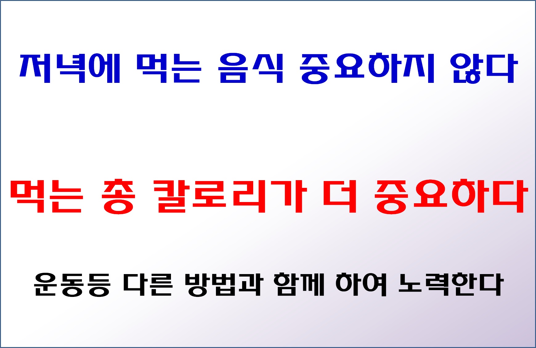 다시 말하면 아침, 점심, 저녁식사 골고루 다이어트 시작 시 목표량을 드시면 살을 빼는 데는 저녁을 먹는다 하여 불리할 게 없다는 것입니다. 다시 언급하지만 제일 중요한 것은 하루 총섭취량이 중요한 것입니다.
