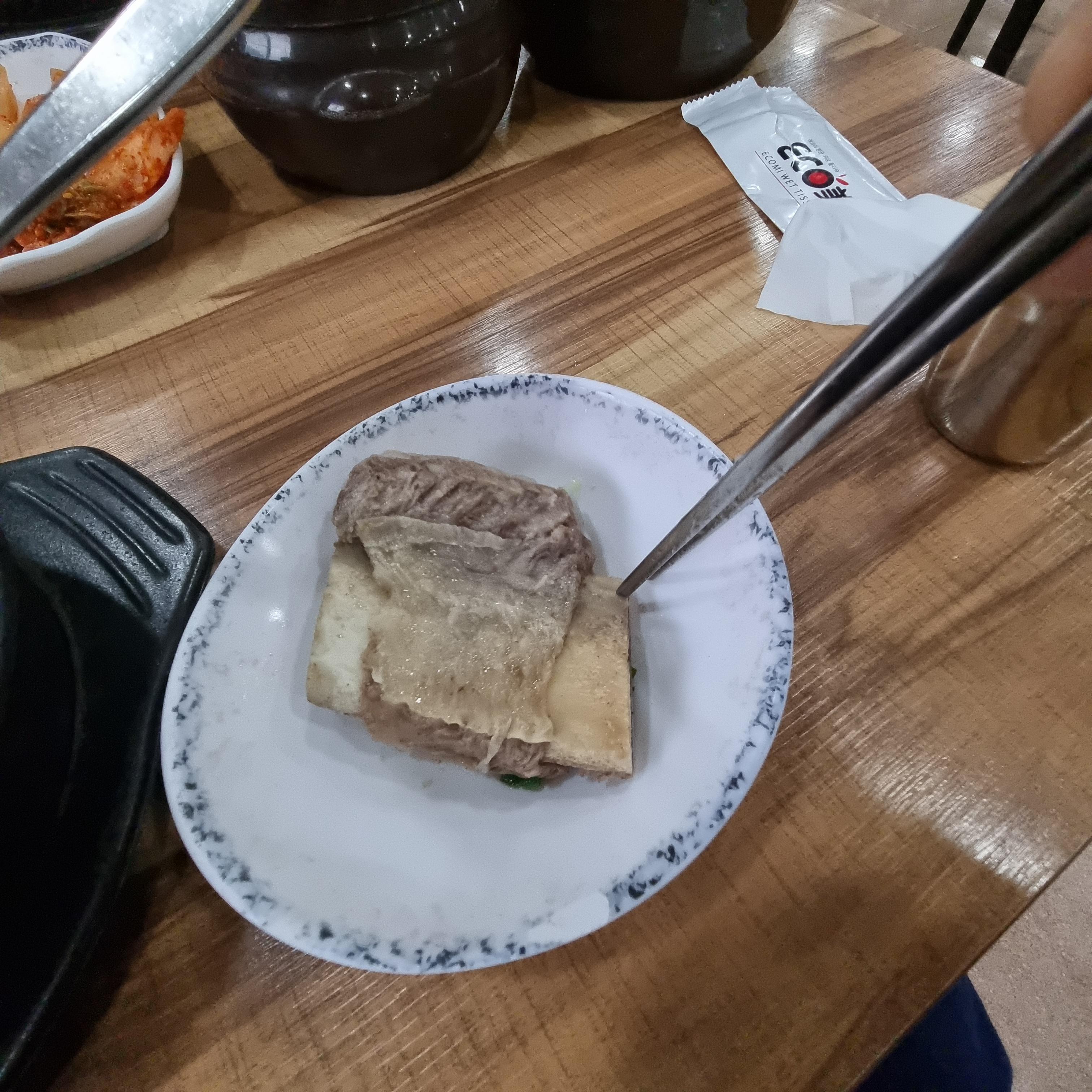 먼저 맑은 국물을 맛을 보는데 정말 시원하고 담백하며 느끼하지 않고 맛있습니다. 공기밥을 함께 먹기 전에 먼저 갈비를 하나 꺼내어 접시에 담아 고기를 뜯어먹는데 식탁에 집게와 가위가 준비되어 있으므로 가위로 잘라 고기를 발라 드시면 됩니다.