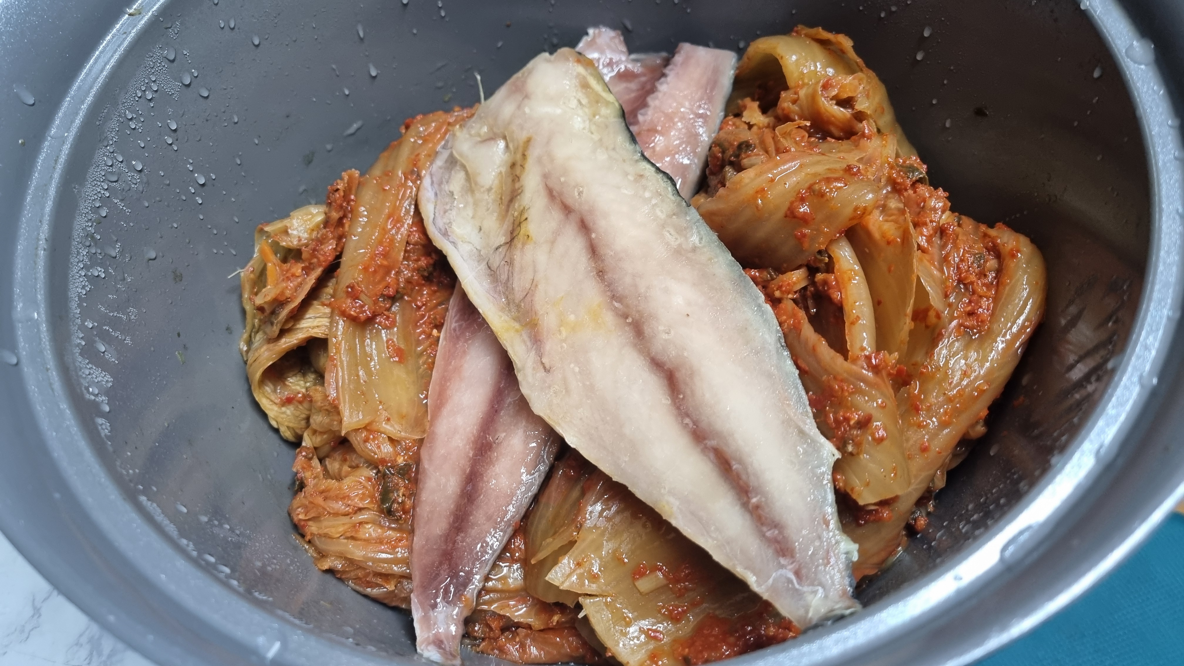 묵은지 김치는 꼭지를 잘라 길게 하여 넣고 고등어를 김치가 감싸는 형식으로 냄비에 넣으시면 되는데 이것은 김치의 양념이 고등어 깊숙이 들어갈 수 있도록 하기 위함입니다.