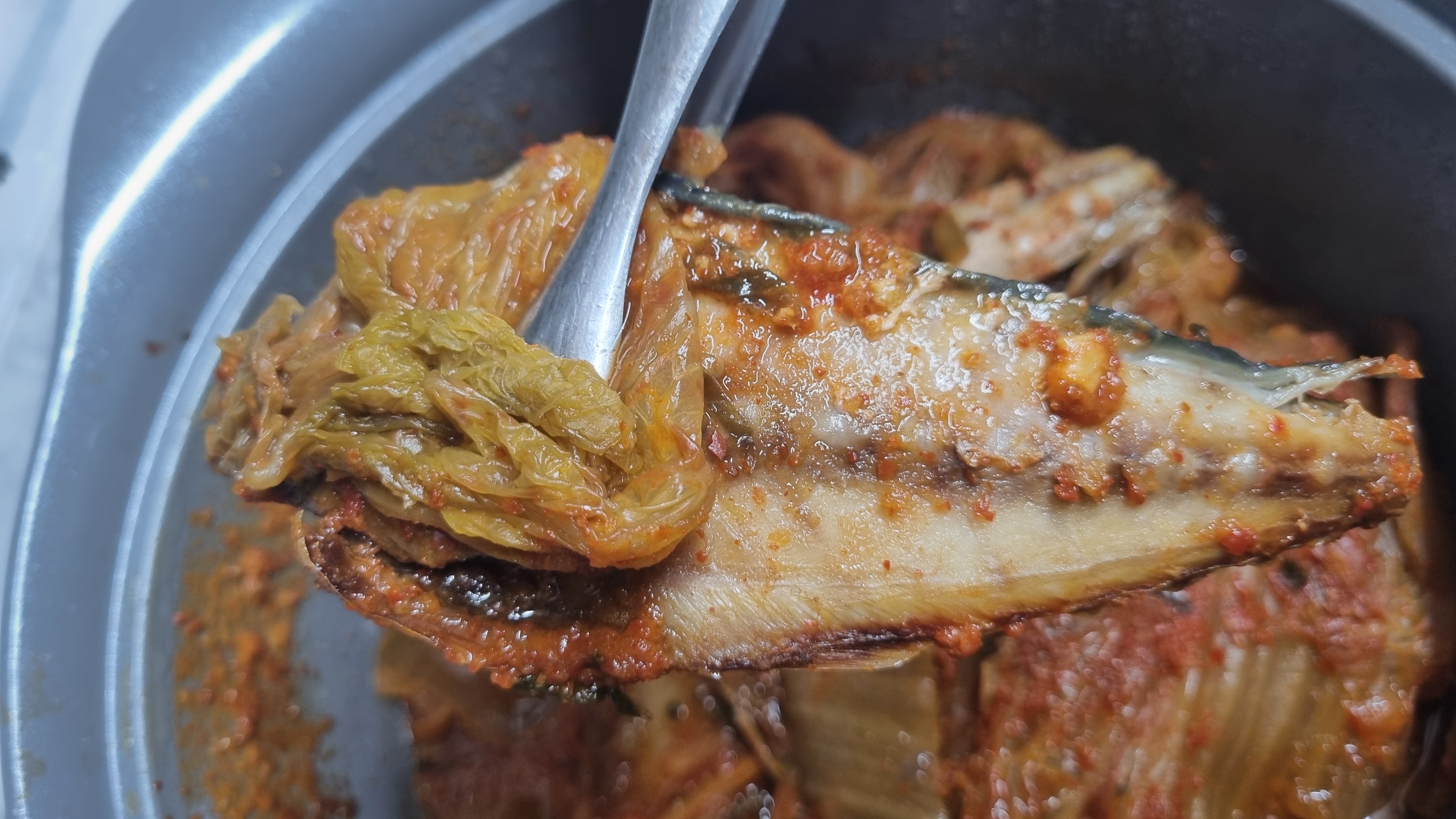 이 음식이 생각보다 엄청 맛있습니다. 깊은 김치맛과 묵은지의 양념이 고등어에 들어가 맛이 환상적으로 맛있으며 김치와 고등어가 궁합이 정말 잘 맞습니다.