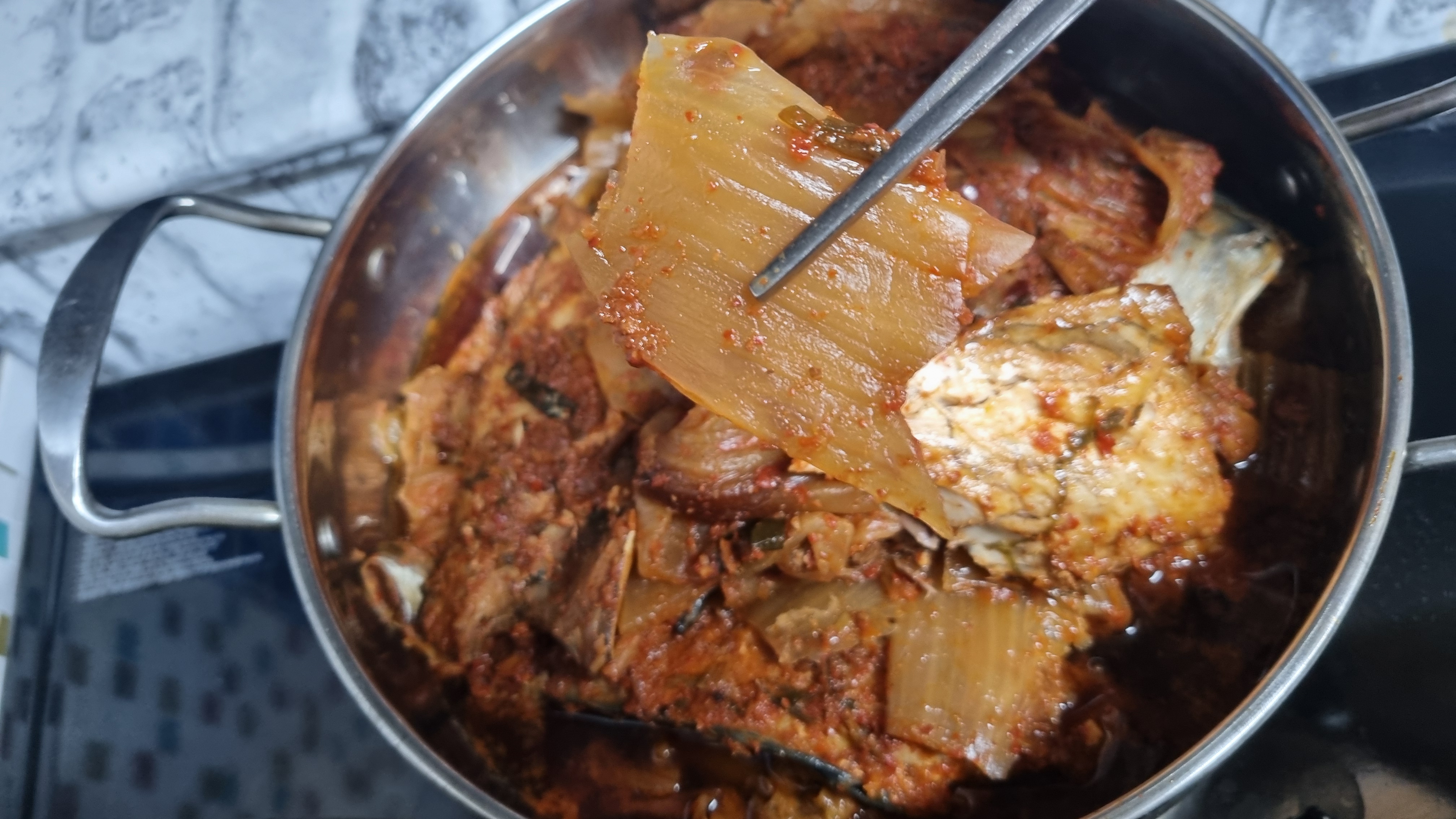 조림이지만 거의 찜 수준으로 만드는데 각자의 조건에 따라 조금씩 다를 수 있지만 중간불에서 대략적으로 7분 정도 끓이고 이후 약한 불에서 3~5분 정도 추가로 더 끓이면 맛있는 묵은지 고등어조림이 되겠습니다.