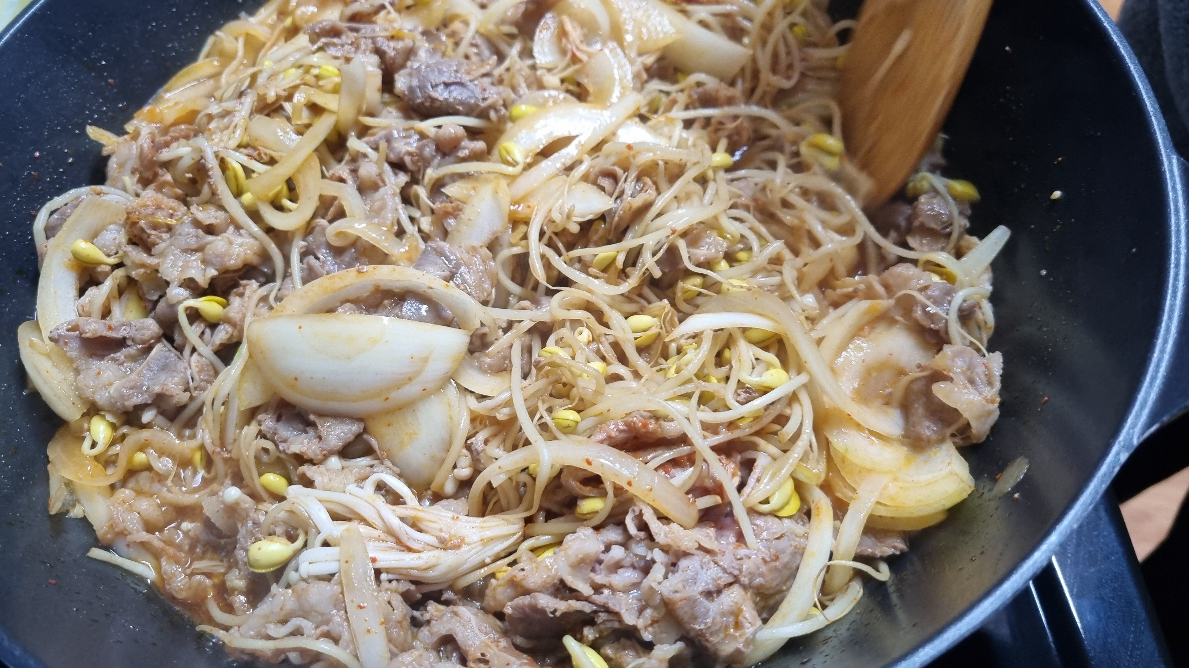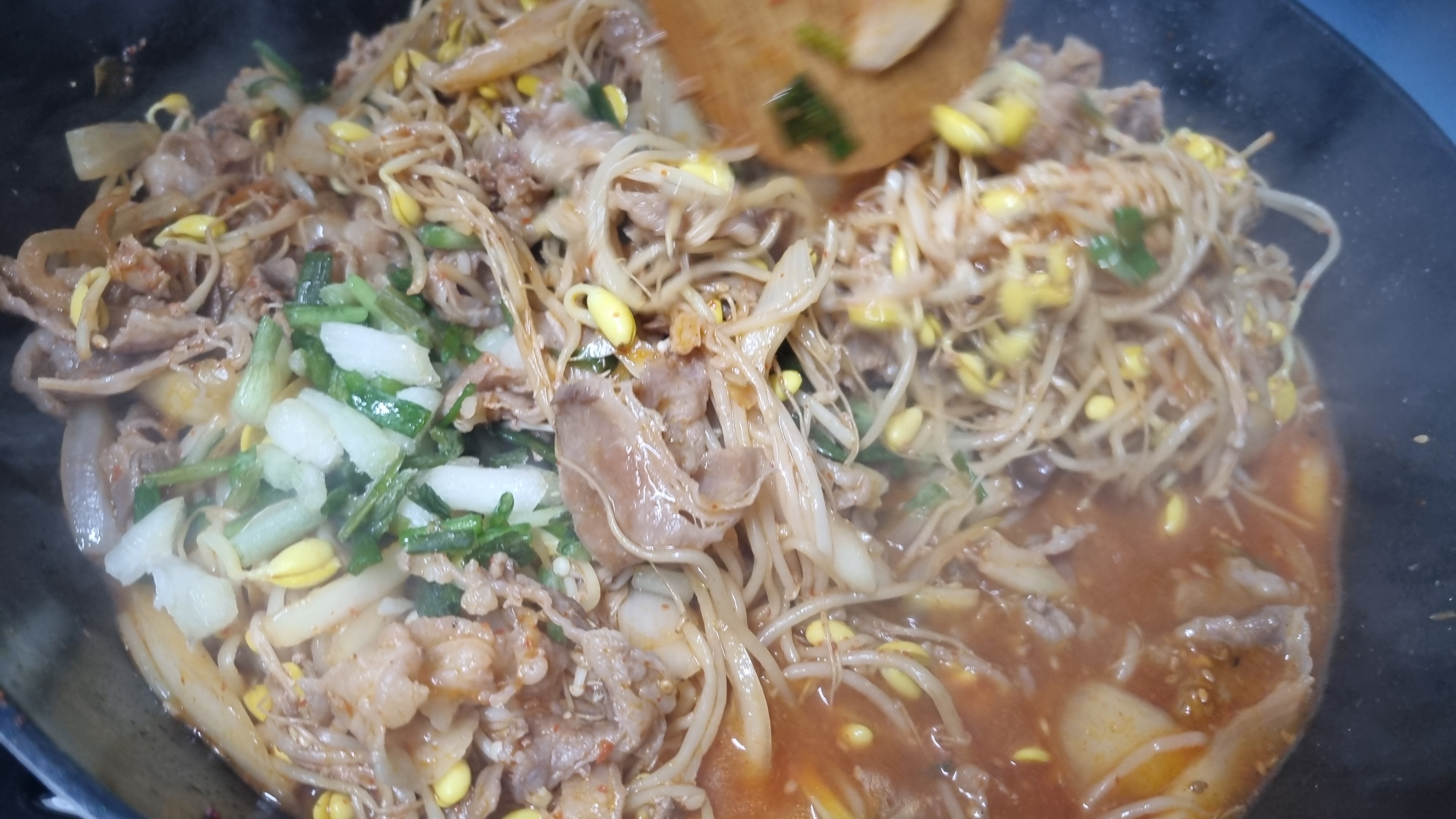 이렇게 하여 중간불에서 5~7분 정도 더 볶으시면 적당히 국물도 나오면서 콩나물 숨이 죽으면서 차돌박이도 서서히 잘 볶아지면서 맛있게 되어 갑니다.