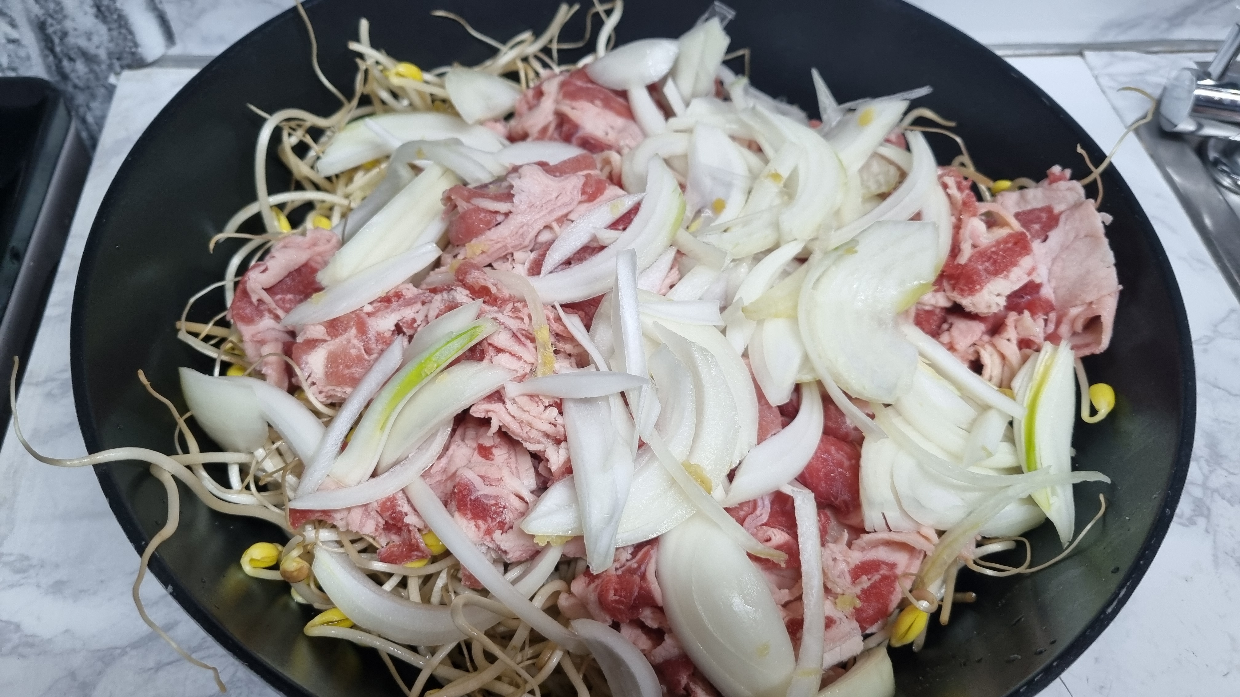 먼저 볶음용 프라이팬을 큰것을 준비하고 재료를 넣기 시작하는데 먼저 콩나물의 절반을 살짝 프라이팬에 먼저 깔고 이어서 차돌박이를 넓게 그 위에 깔아줍니다.