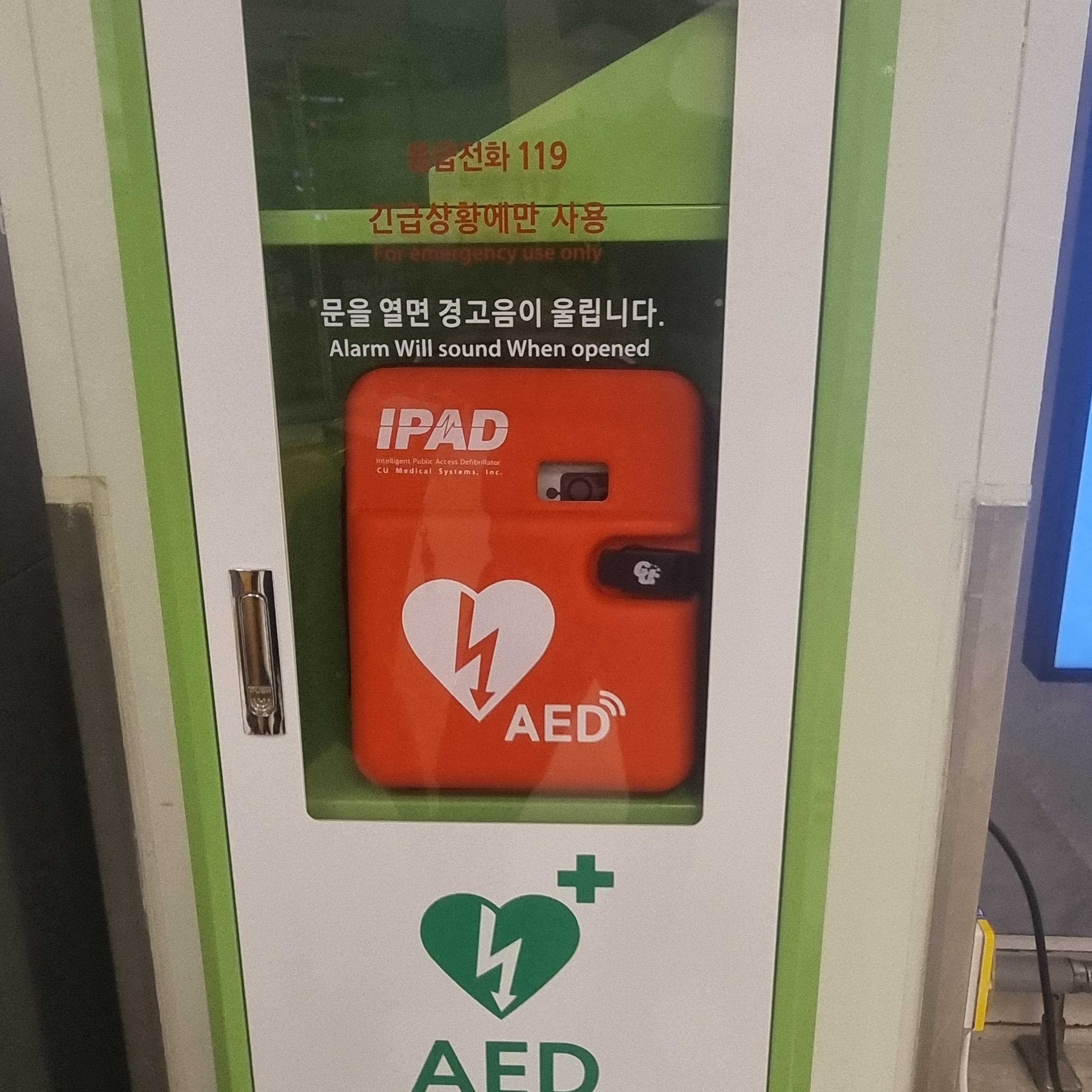 요즘에는 심장자동충격이가 많이 설치되어 있는데 이곳에 매장입구에 보이는데 위급사항 발생 시 누구나 이용할 수 있습니다.