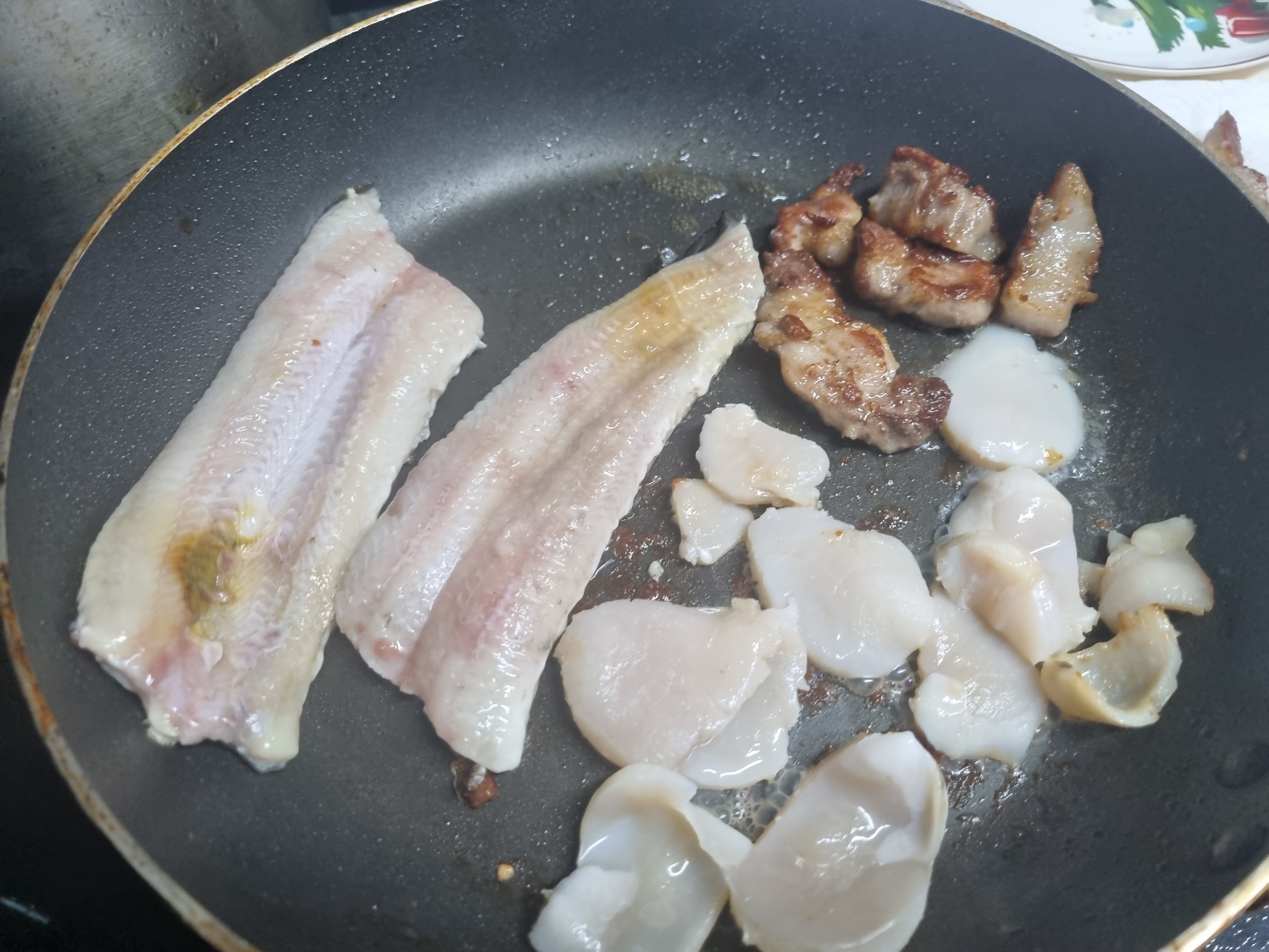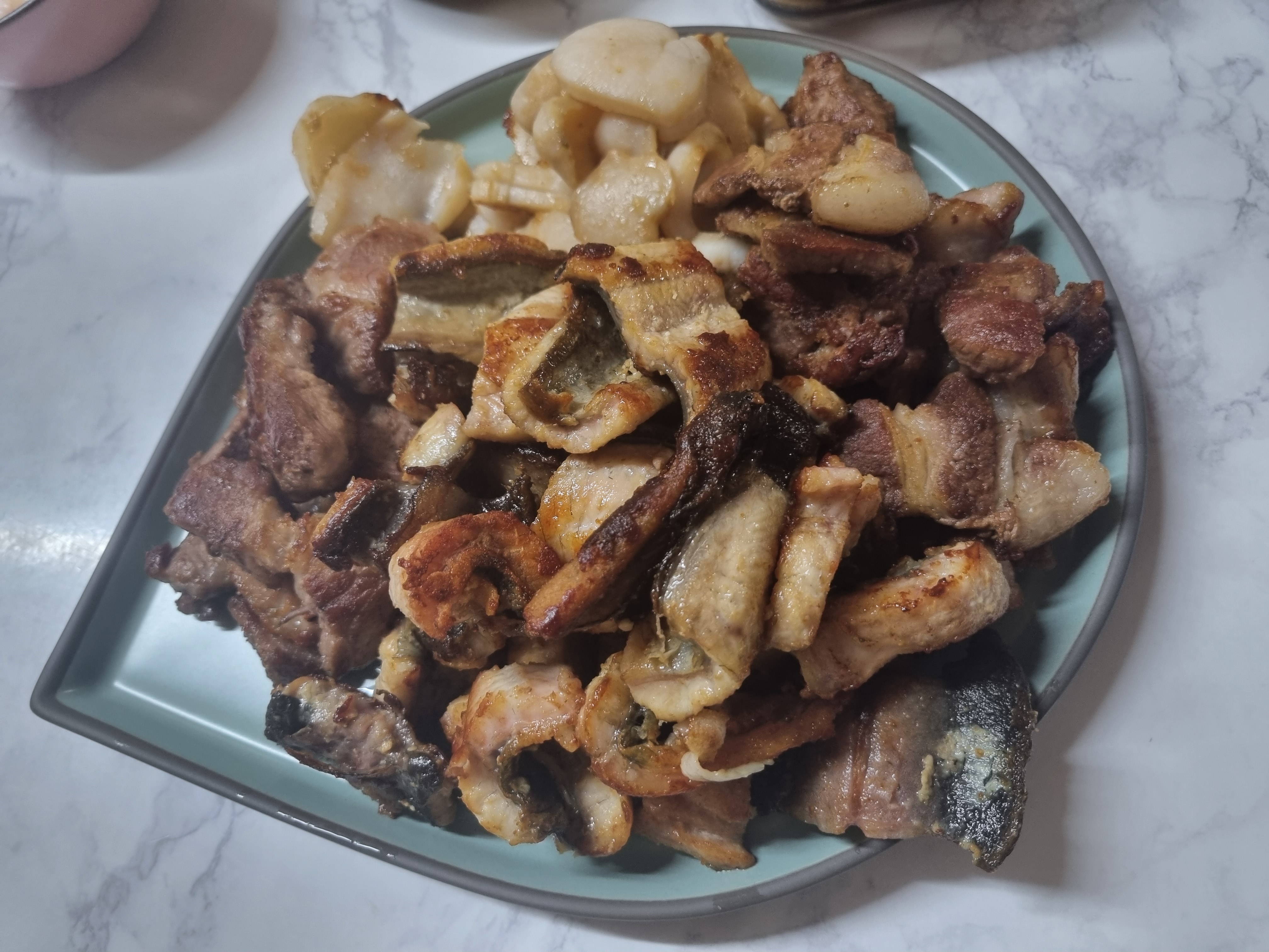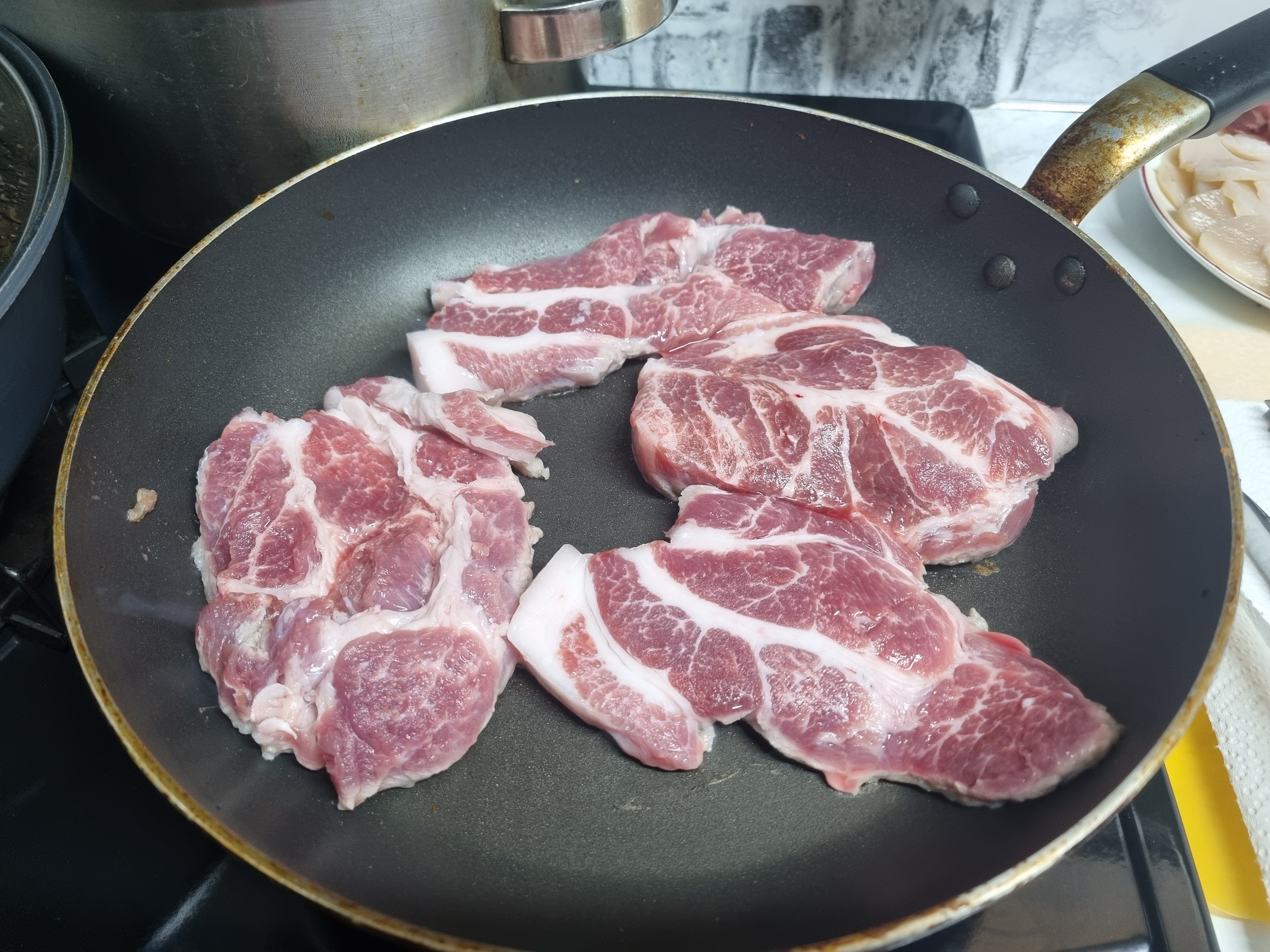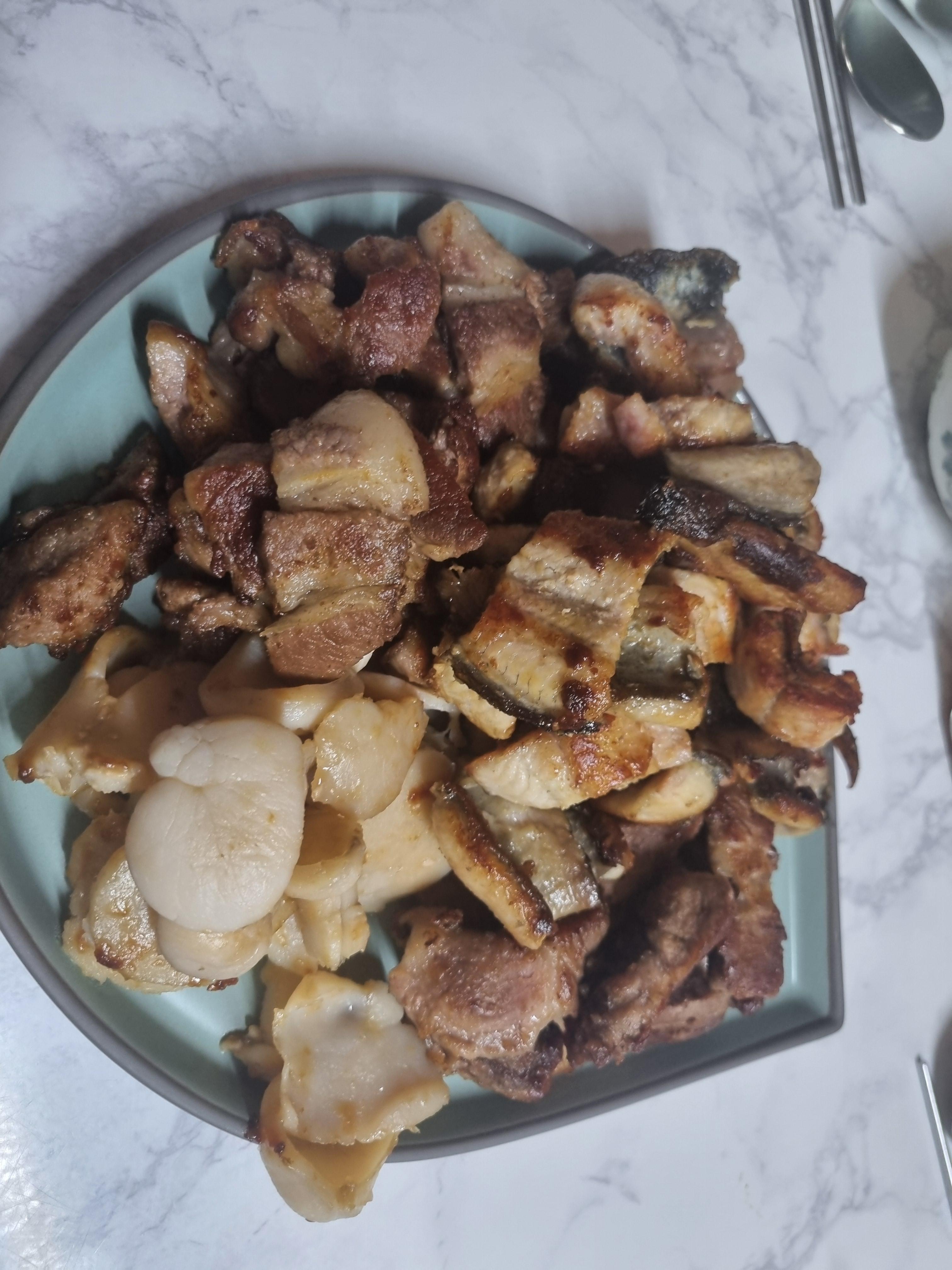 굽는 순서는 먼저 돼지고기를 굽는 것이 좋습니다. 일단 돼지고기가 가장 늦게 구워지기 때문에 먼저 굽고 또한 굽는 과정에서 나오는 기름으로 키조개 관자를 구우면 더욱더 맛있습니다.