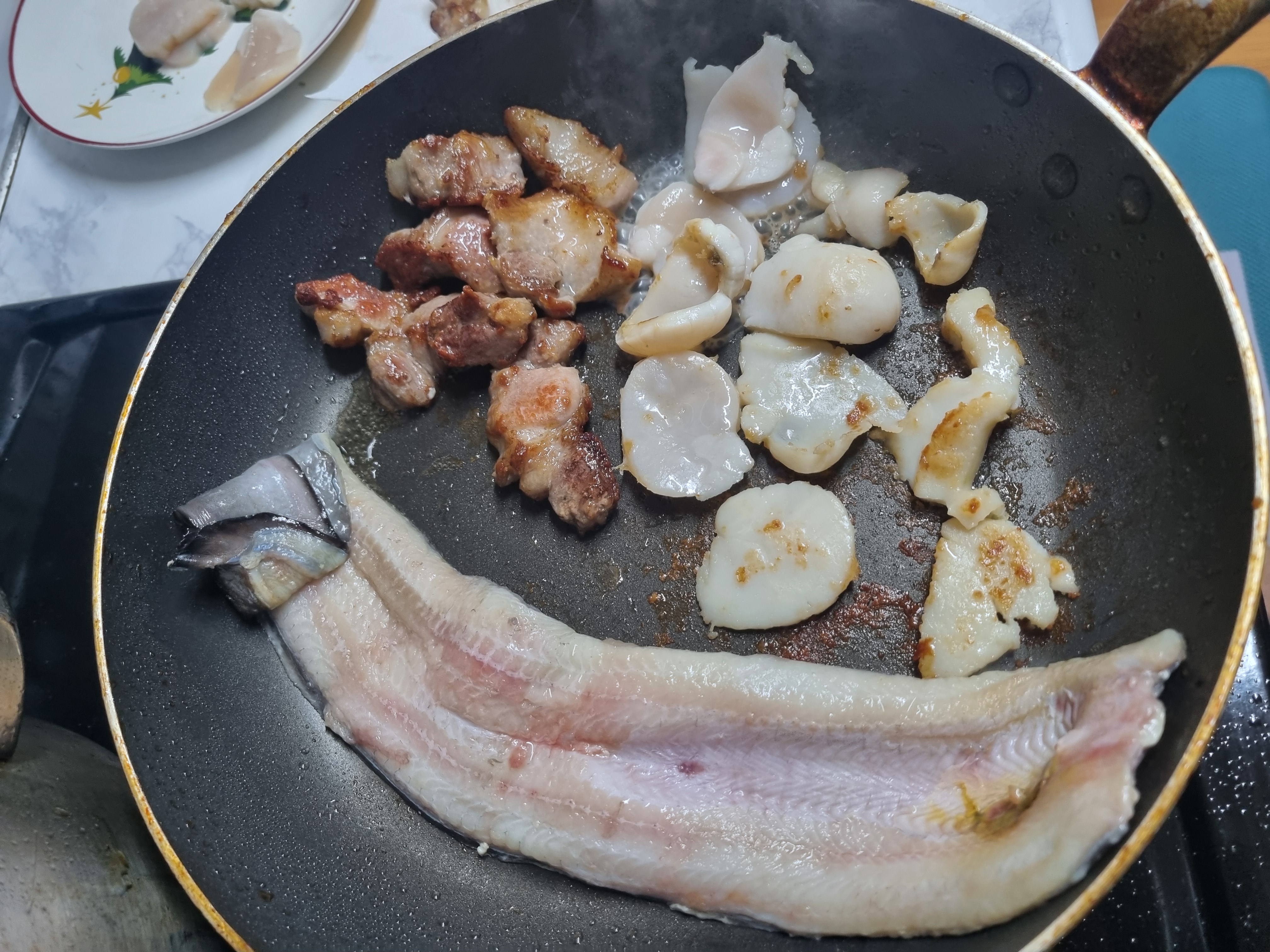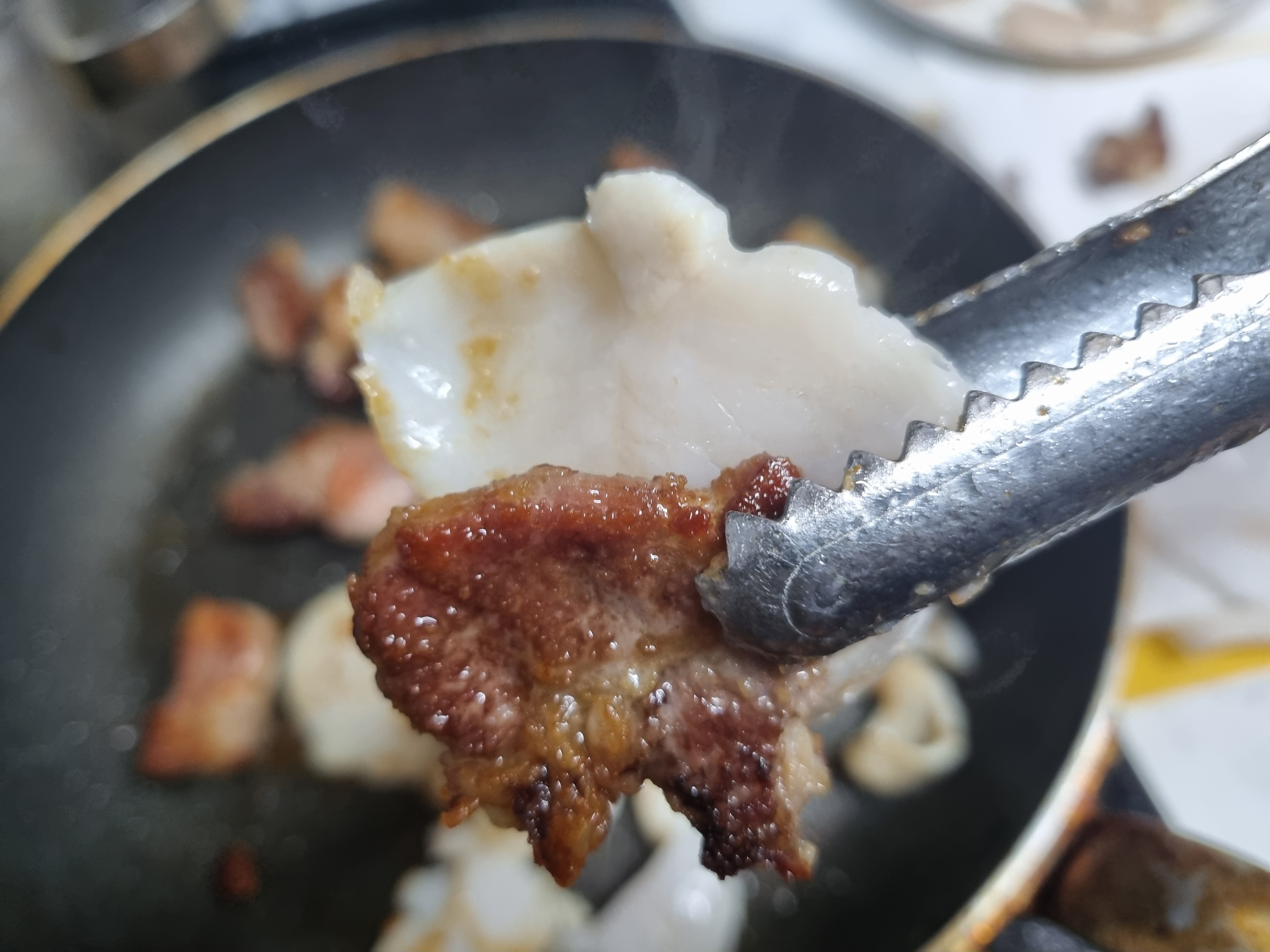 목살을 굽다가 절반이상 구웠으면 이어서 관자를 함께 굽기 시작합니다, 관자는 특성상 빠르게 구워지고 바로 먹을 있을 만큼 굽는 시간이 짧습니다.