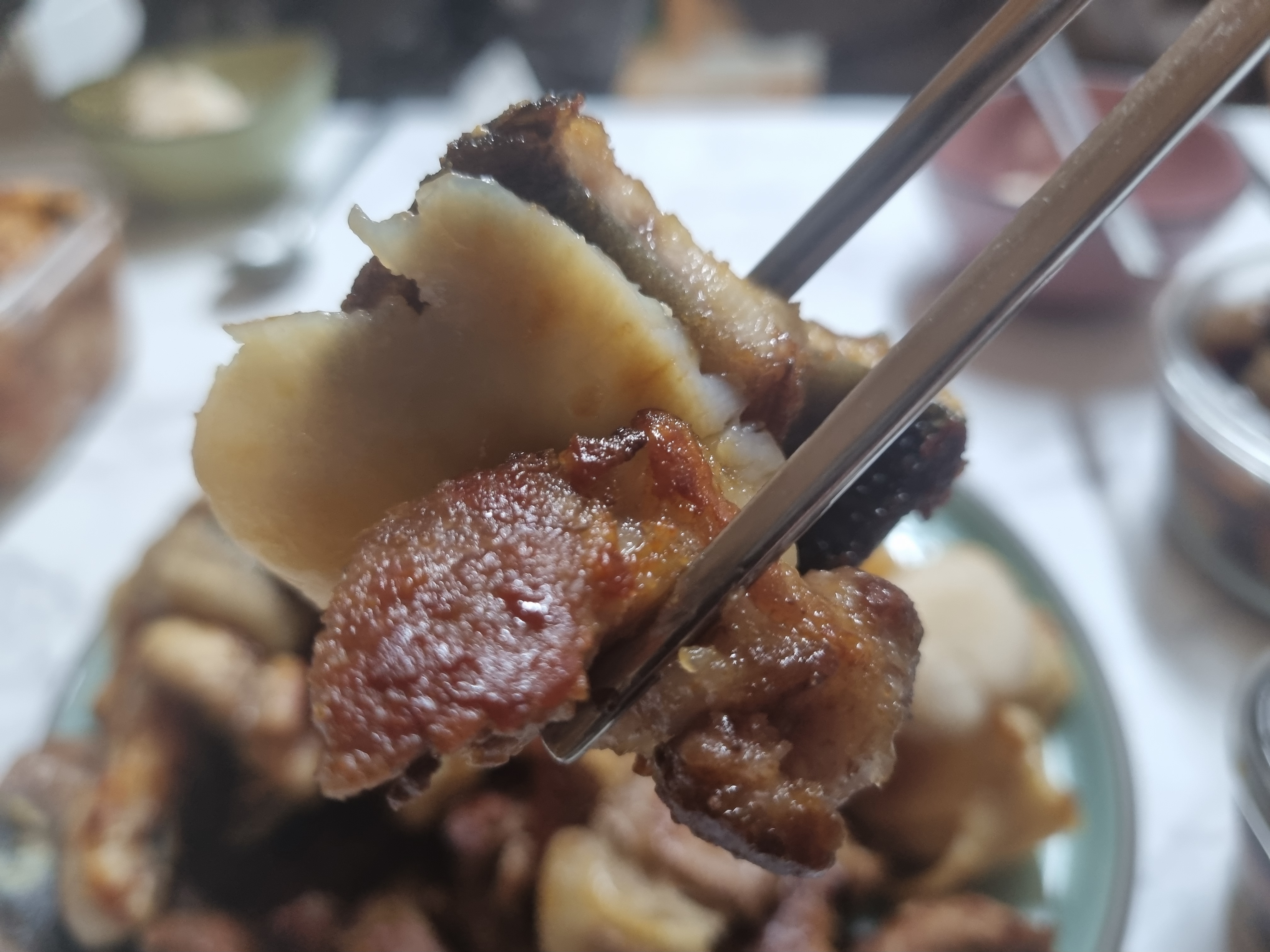 아직 모두 굽지는 않았지만 입맛이 땡겨 게지와 돼지고기를 함께 먹었는데 역시 전혀 새로운 맛을 느낄 수 있었는데 입안에서 두 가지 맛의 독특한 것이 느껴져 새롭고 맛있습니다.