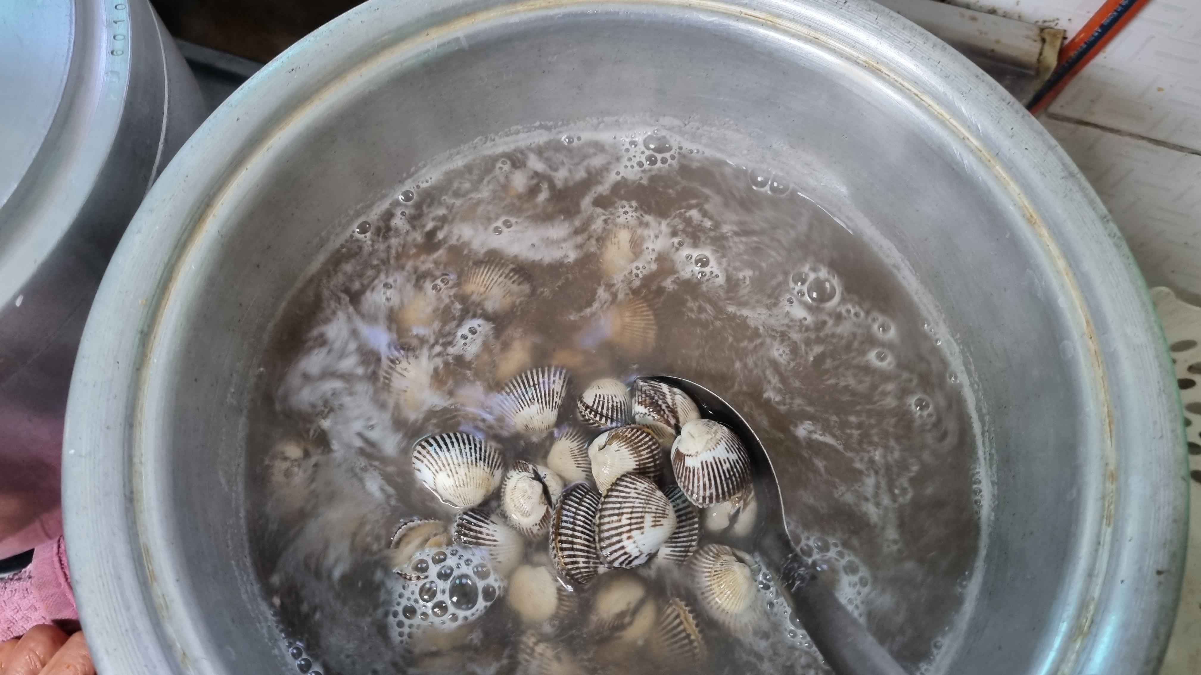 넣은 후 2분정도 지나면 국자등으로 자주 저어주워야 합니다 그래야 골고루 삶아지게 되고 꼭막안에 남아있는 뻘이 빠져나오게 됩니다.