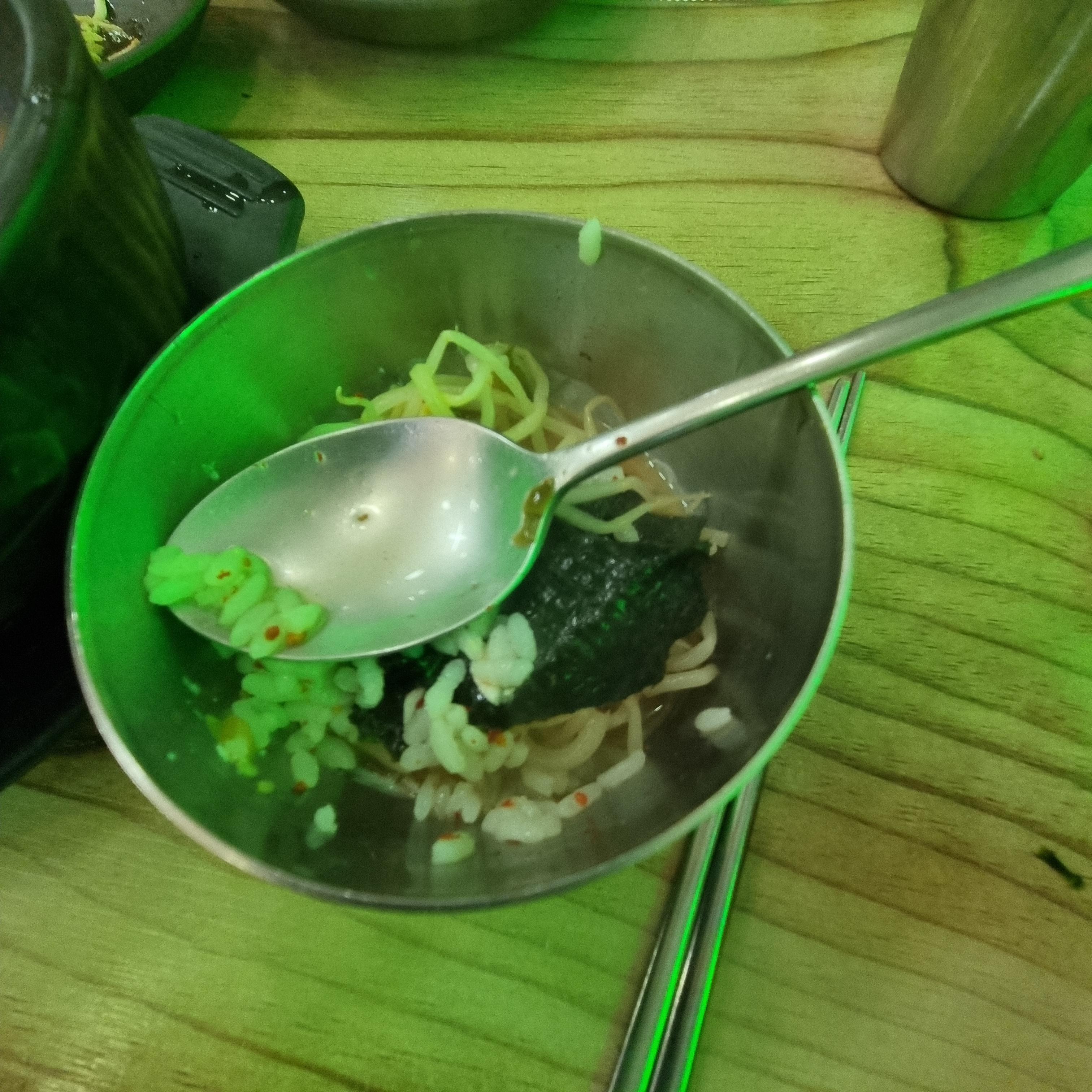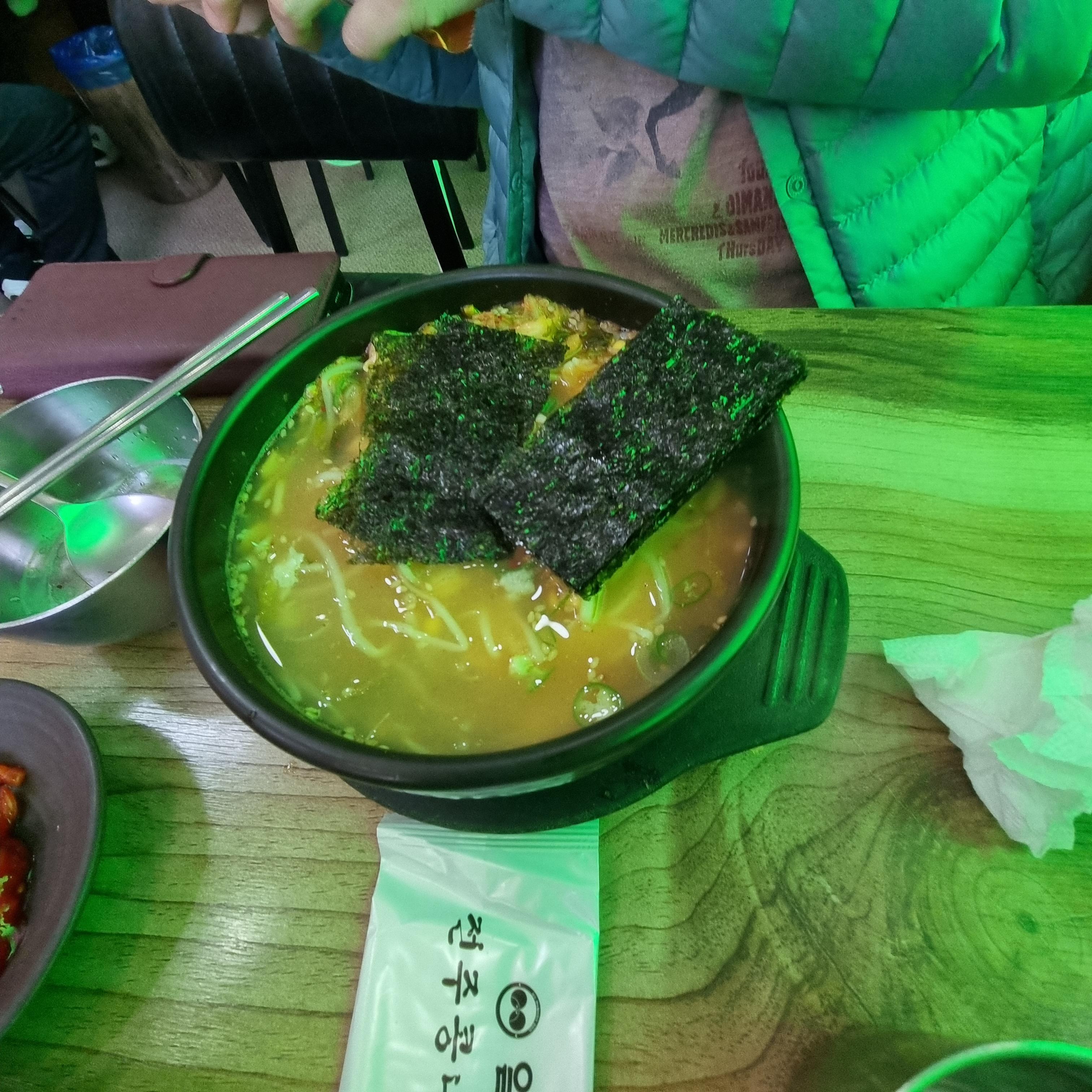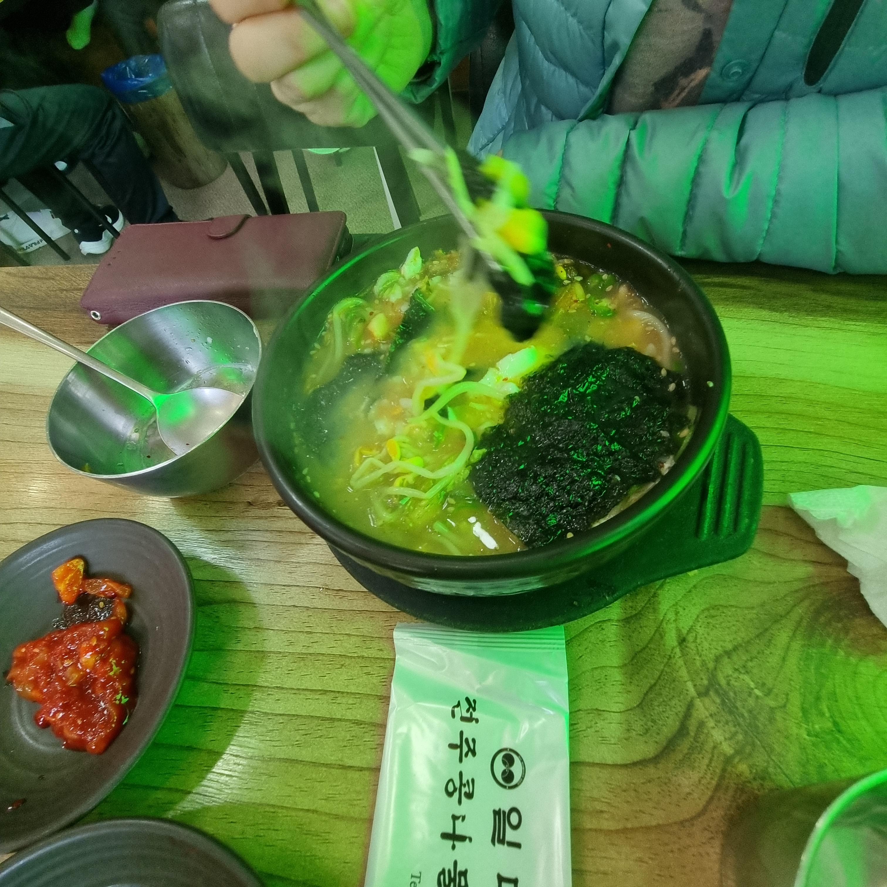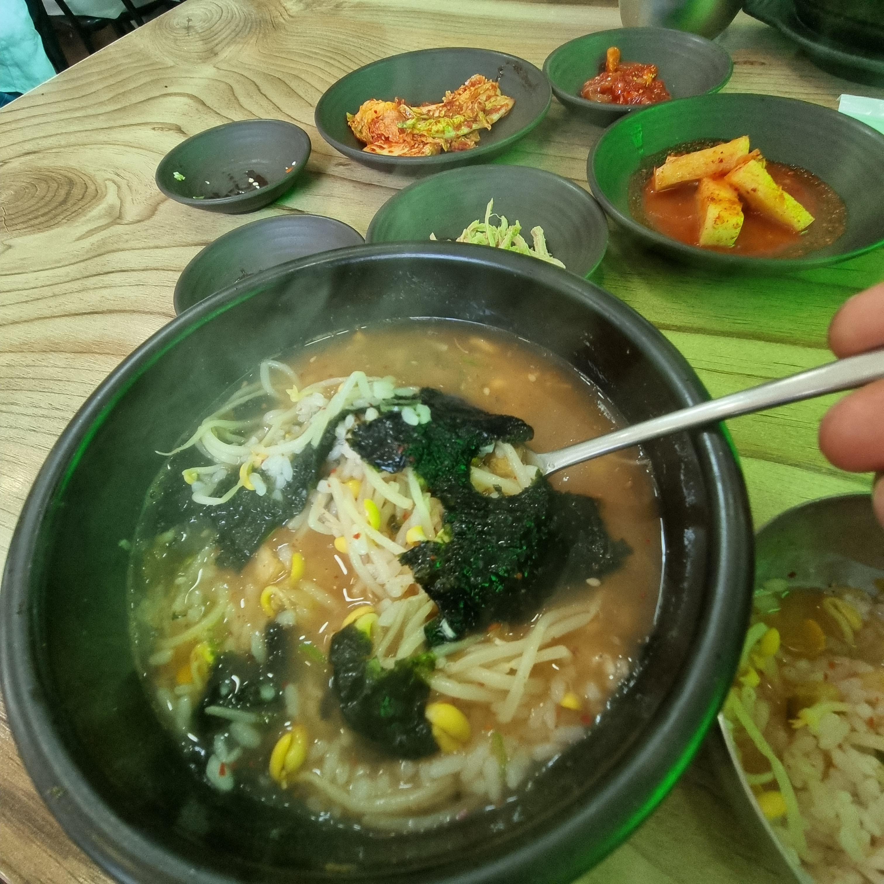 시원하고 담백한 국물이 너무 좋고 밥은 국에 말아져 있으며 콩나물과 기타 양념들로 구성되어 있습니다.