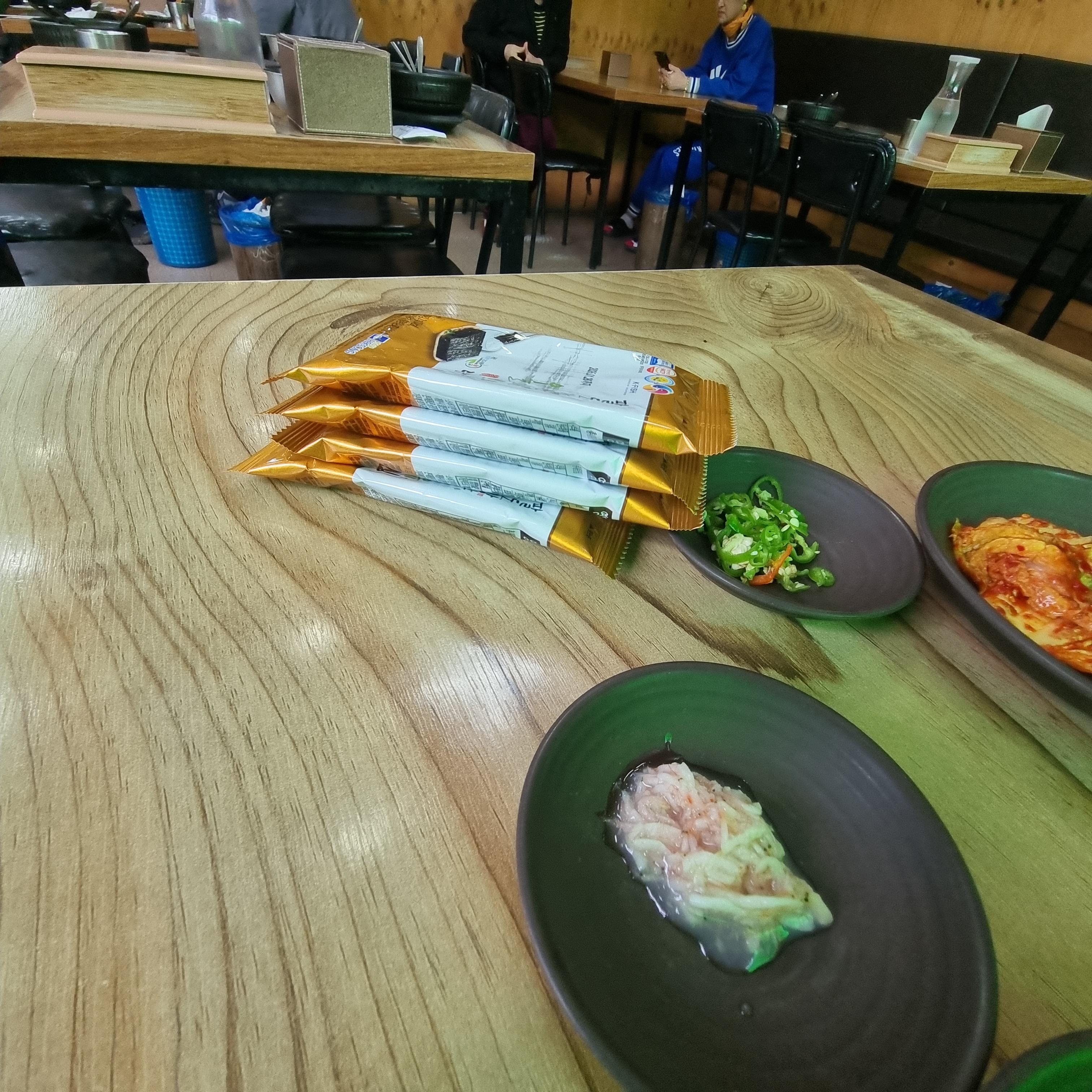 기본반찬입니다. 국밥 한그릇에 맛김이 기본적으로 2개씩 나오고 반찬은 조금씩 나오는데 리필은 얼마든지 가능하며 정말 깔끔하게 나옵니다.