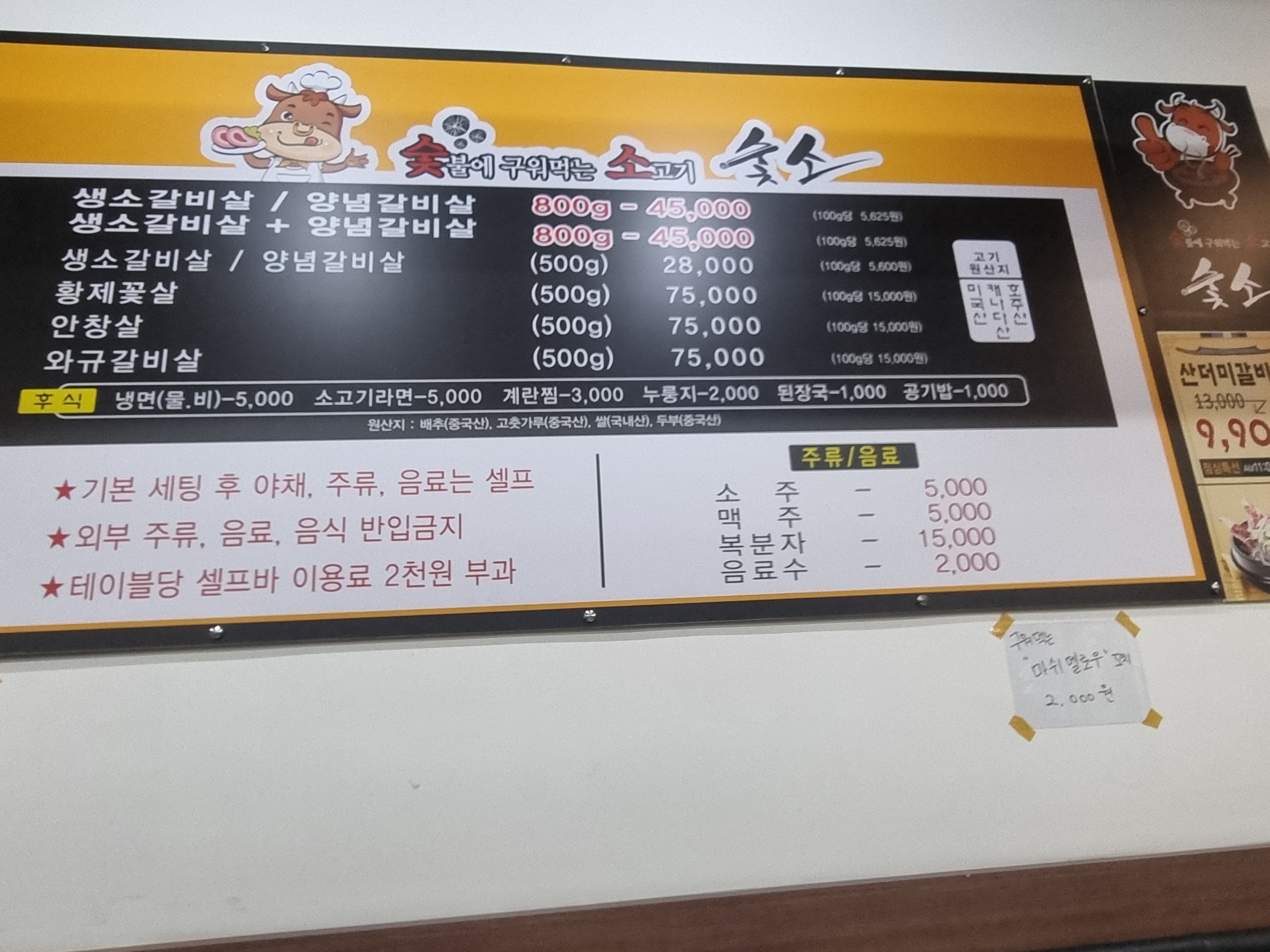메뉴표인데 주요 메뉴가 생소갈비살과 양념갈비살입니다.