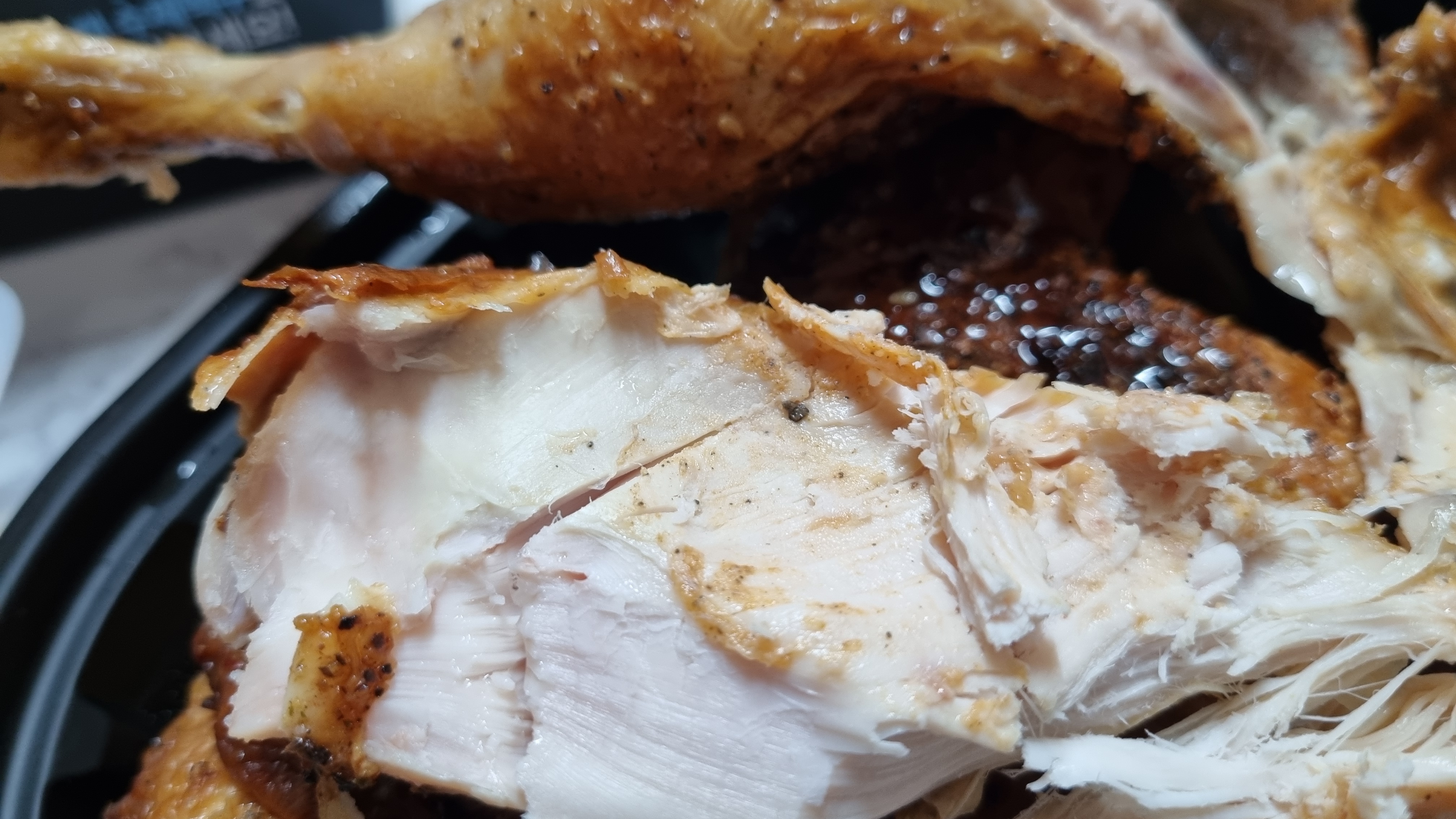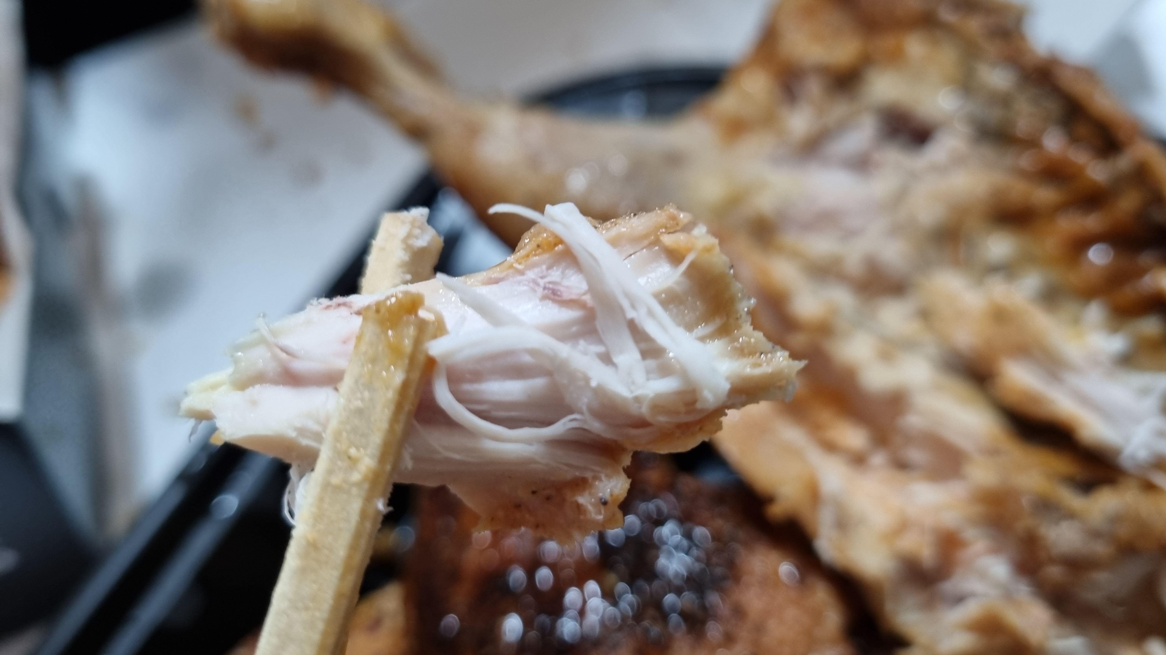 직접 먹어보았는데 고기가 부드럽고 간이 약간 짭조름하여 일단 입맛에는 딱 맛있습니다. 부위가 다리라 고기살의 식감이 정말 좋았으며 치킨과는 다른 맛이지만 특유의 훈제맛과 어우러져 새로운 맛을 느낄 수 있습니다.