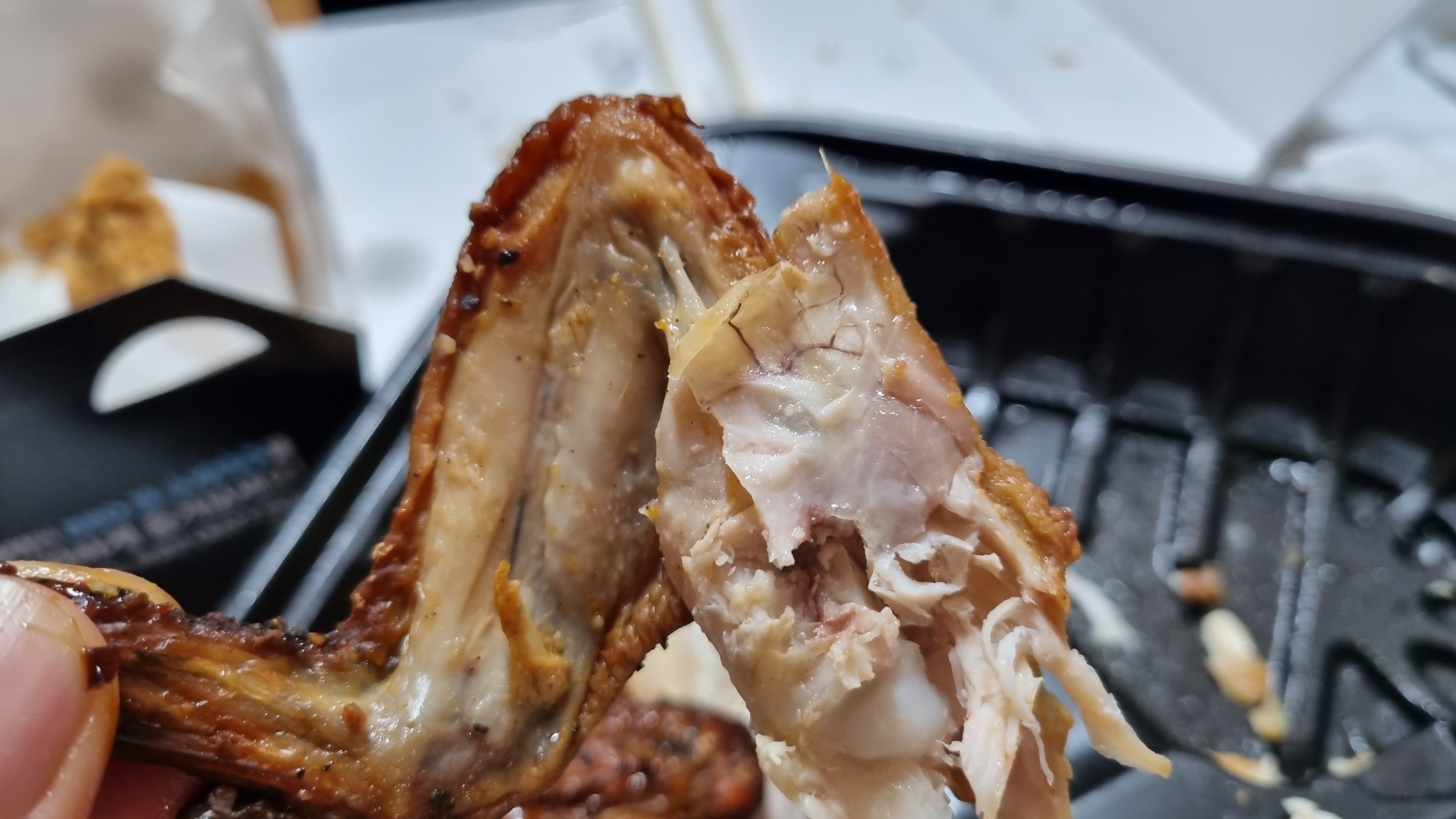 포장지를 개봉했는데 직접 만지니 크기가 더 큰 것처럼 느껴졌습니다. 양념도 잘 되어 있고 닭다리가 날개부위까지 구성되어 있었으며 소스 같은 것이 발라져 있었습니다.