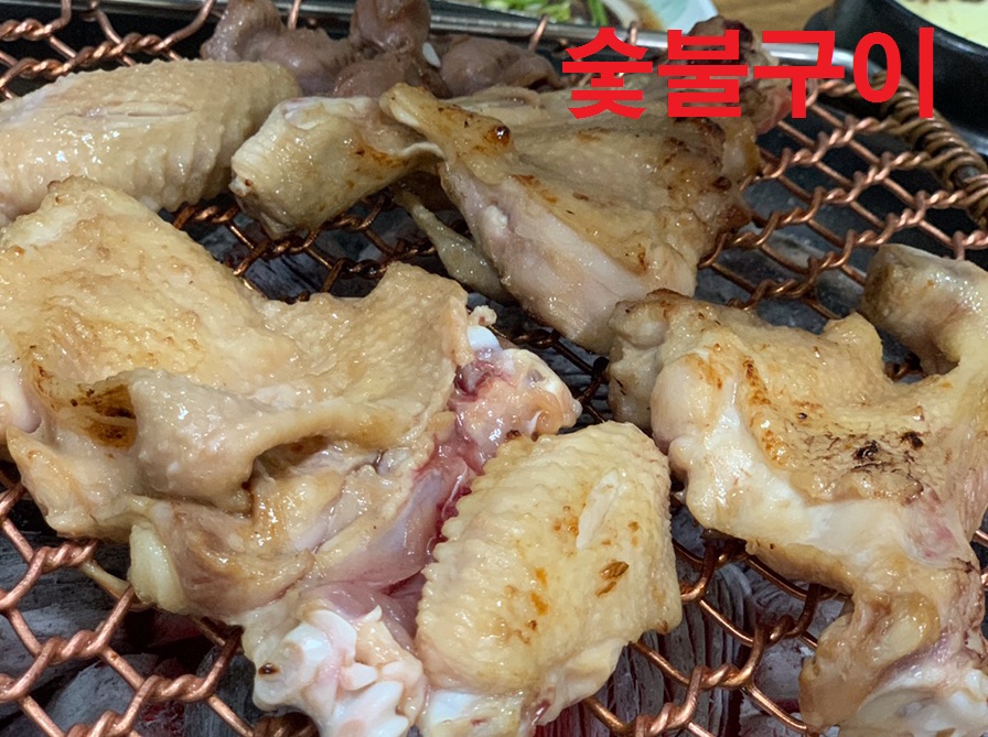 우리는 일행이 많아 2개 테이블에서 먹었는데 토종닭숯불구이와 능이백숙, 삼겹살을 주문하였습니다.