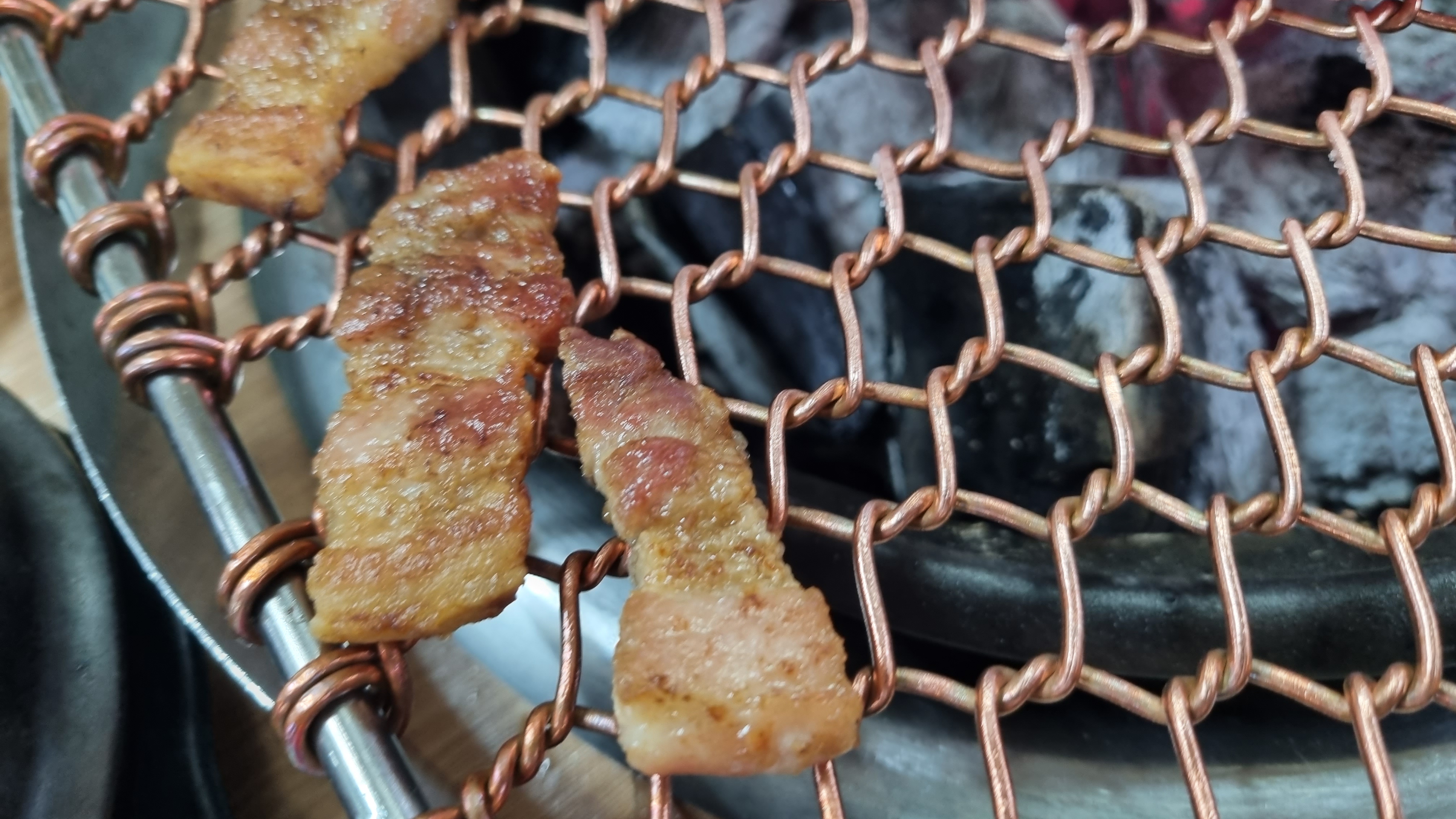 일반 불판보다 숯불에 구우 먹으니 확실히 맛이 다르고 맛있습니다. 하지만 굽는 과정에서 불쇼를 조심해야 하는데 환기구를 가까이하면 불이 적게 나니 참고하시기 바랍니다.