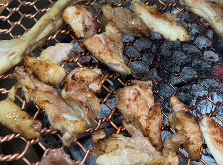 닭은 비교적 잘 구워지고 살짝 탄 부위는 가위로 잘라주면서 드시면 되는데 애들이나 나이 드신 어르신들도 먹기 참 편하고 맛있습니다. 일단 기름기가 별로 없는데 또 숯불이기 때문에 쫙 빠져 정말 담백하고 부드럽고 맛있습니다.