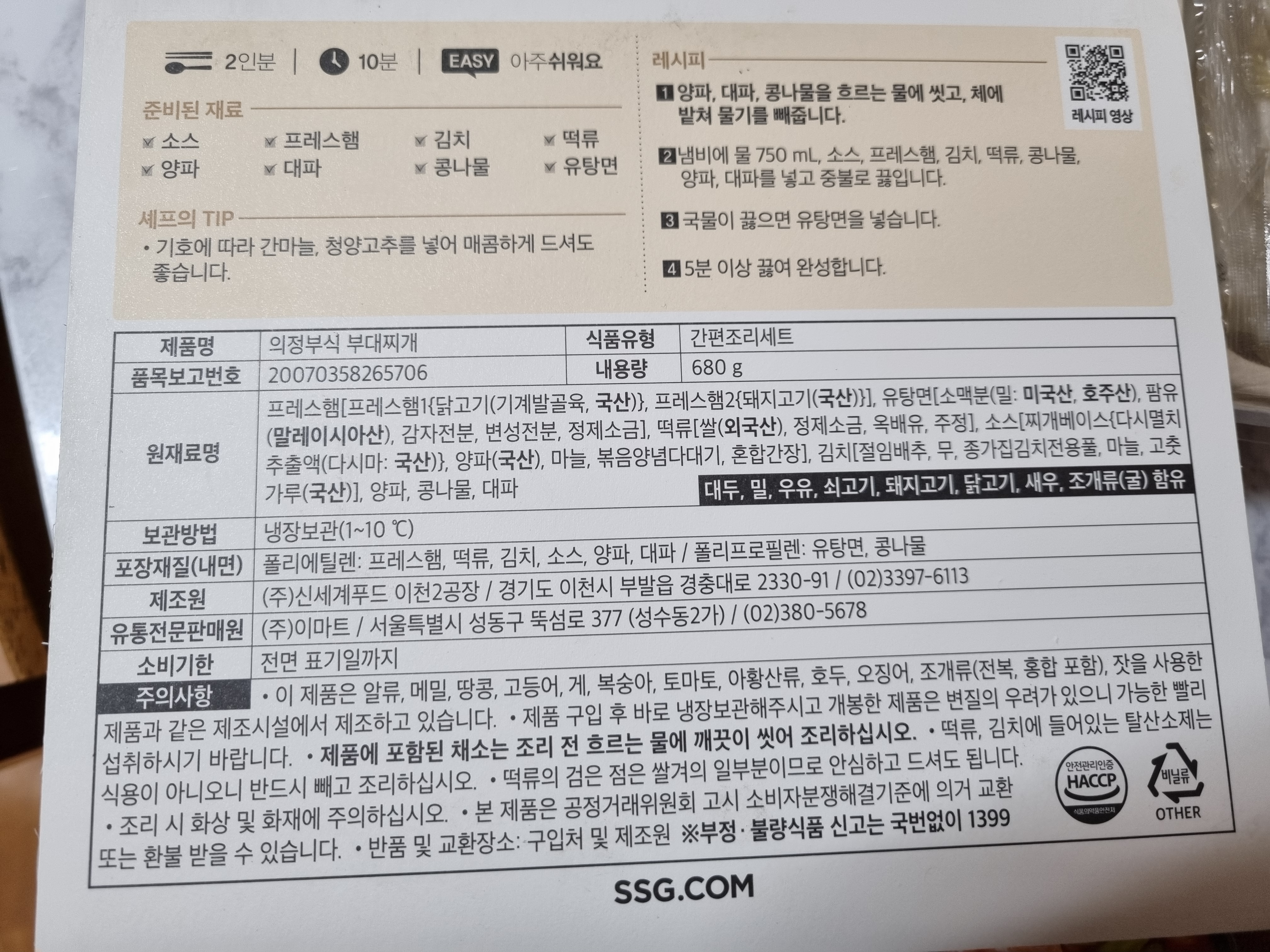 뒤면을 보면은 재료와 조리법이 잘 나와 있는데 참고하시면 됩니다. 조리 과정이 워낙 간단하여 그대로 따라 해도 전문가 솜씨로 부대찌개를 만들 수 있습니다.