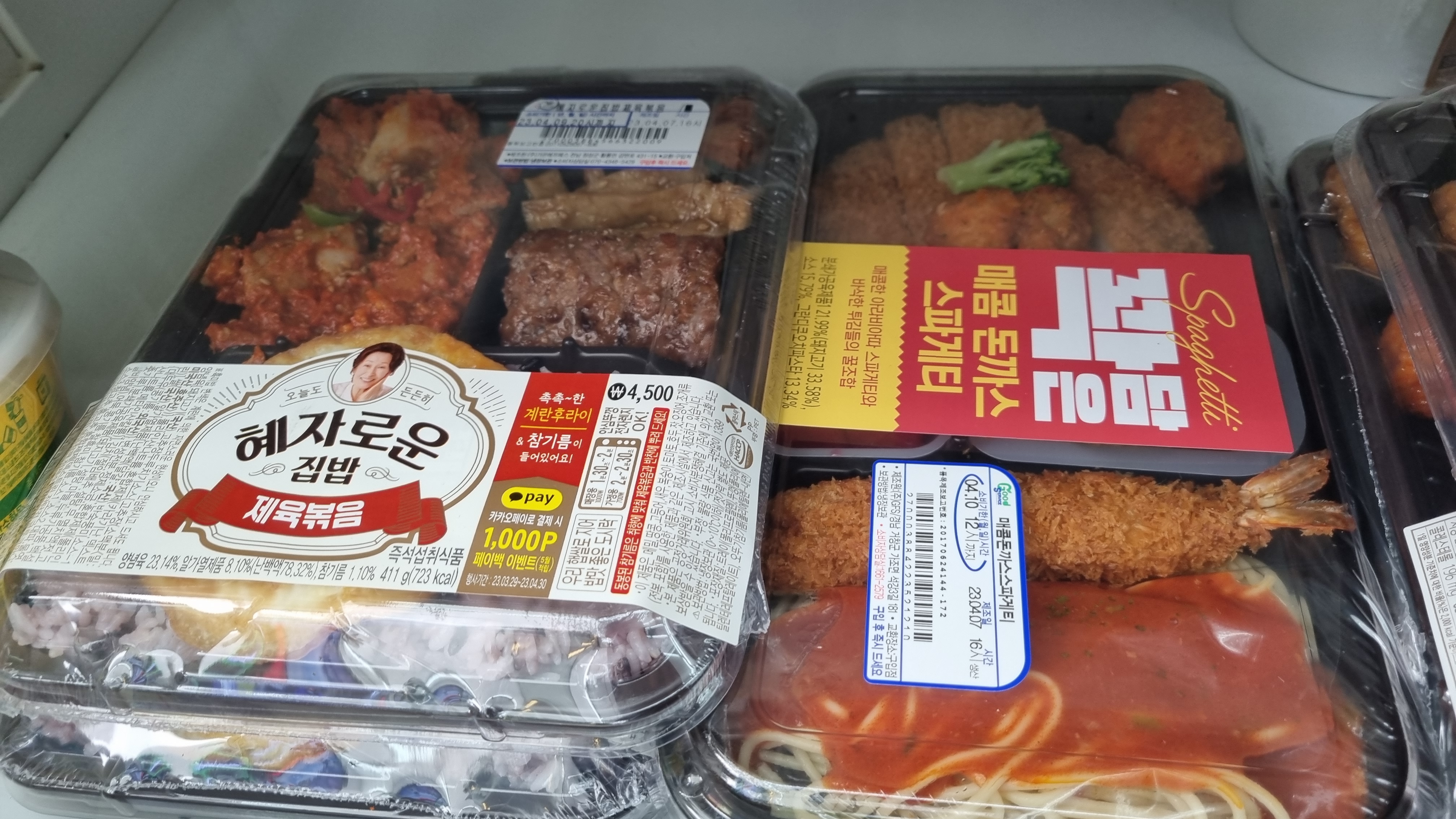 위의 도시락들도 모두 4천 원대인데 왼쪽은 제육볶음인데 밥이 있고 제육볶음과 기타 햄등의 반찬이 추가로 있습니다. 오른쪽 것은 밥 종류의 도시락은 아닌데 이름이 매콤 돈까시 스파게티입니다.