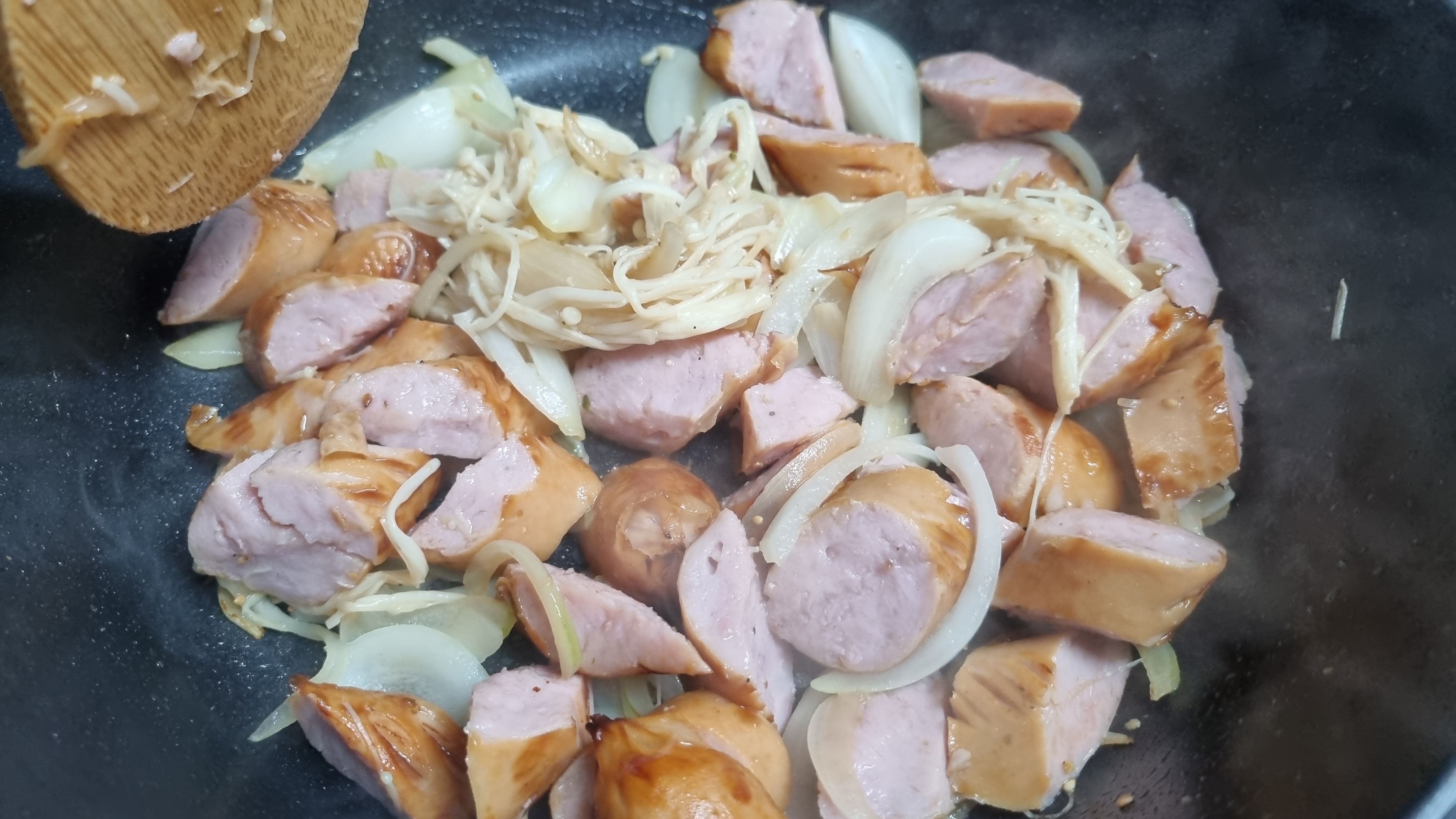 양파와 소시지가 적당히 볶아지기 시작할 때 마지막으로 넣은 것이 바로 팽이버섯입니다. 이것은 아주 얇고 작은 것이므로 먼저 넣으면 탈 수 있으므로 나중에 넣는 것이 좋습니다.