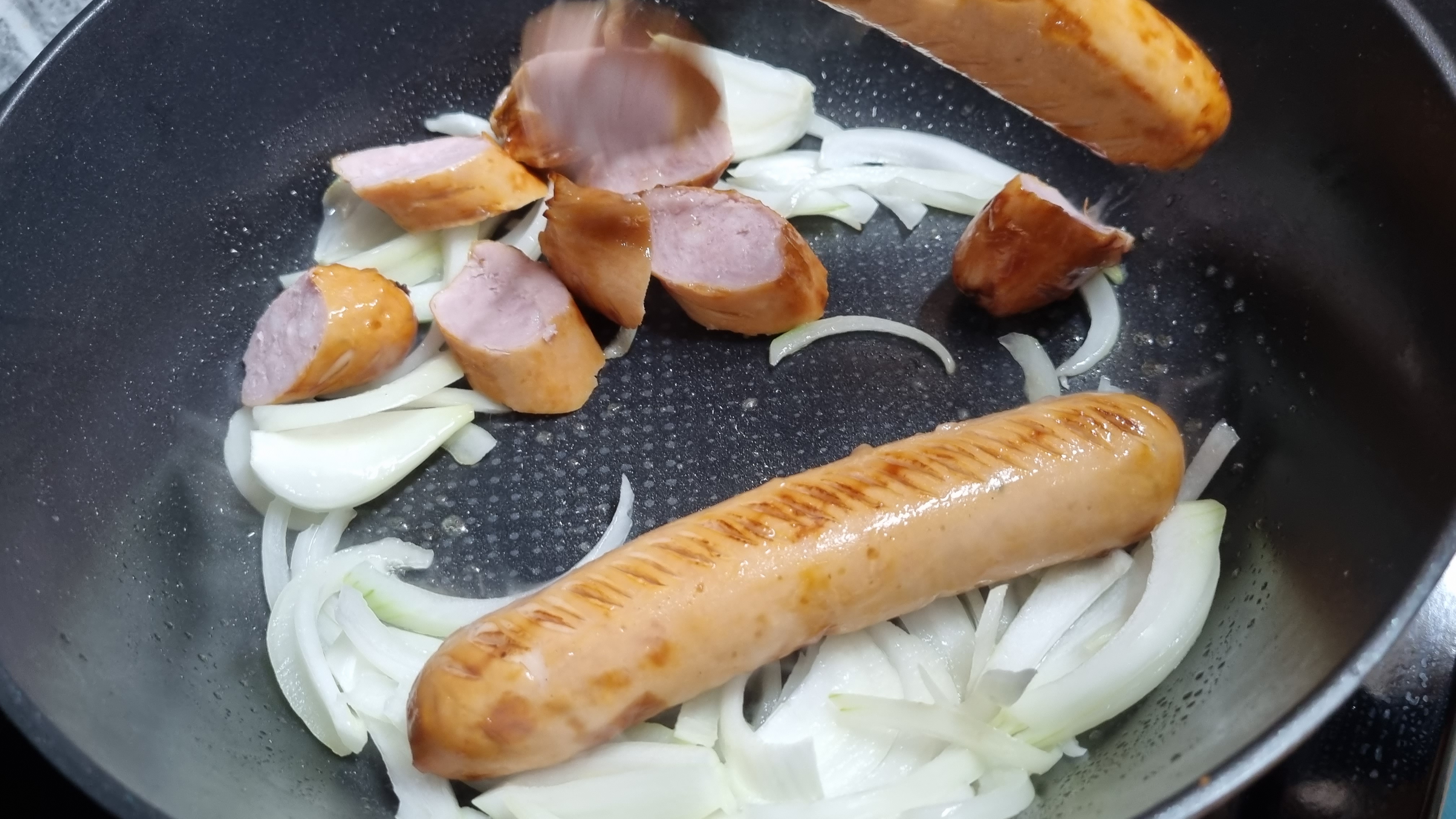 양파를 넣은후 추가로 1분 정도 볶은 상태에서 소시지를 드시기 적당한 크기로 잘라줍니다. 크기나 모양은 특별히 관계는 없지만 대각선 모양으로 자르면 볶는데도 좋고 먹기에도 편안하고 좋습니다.